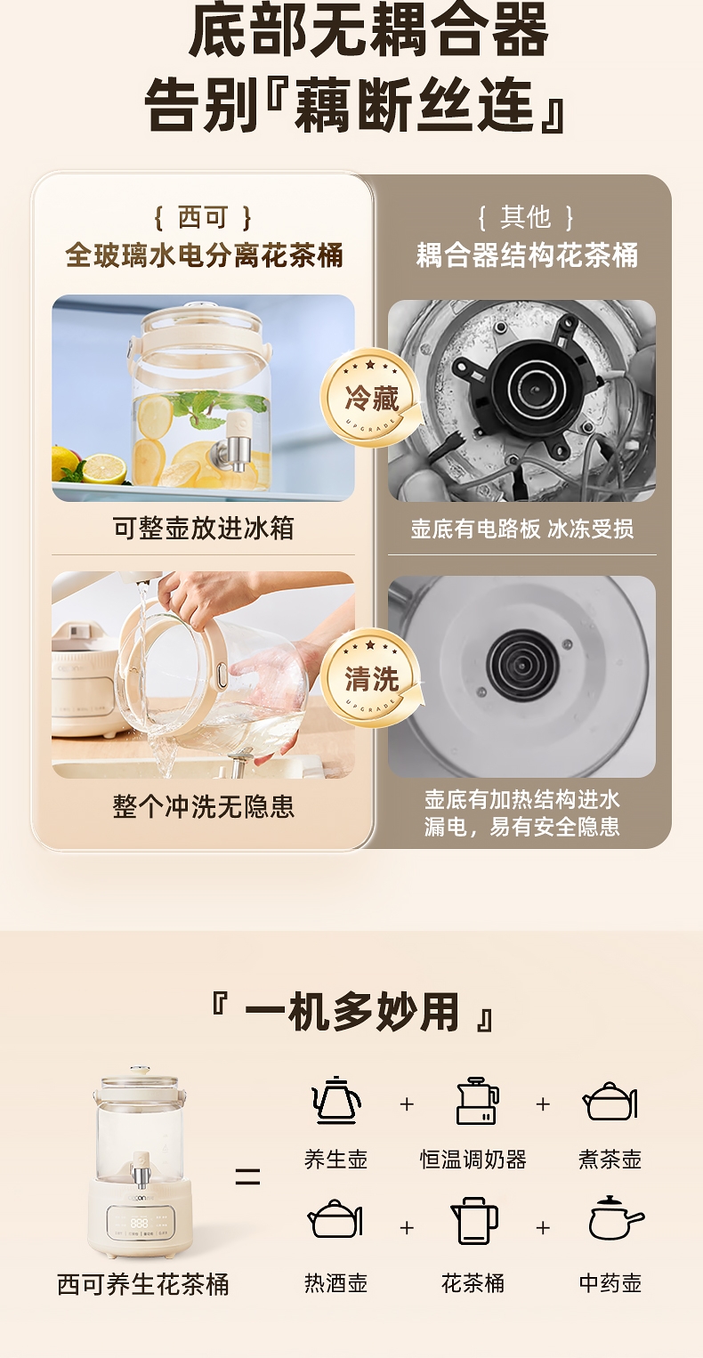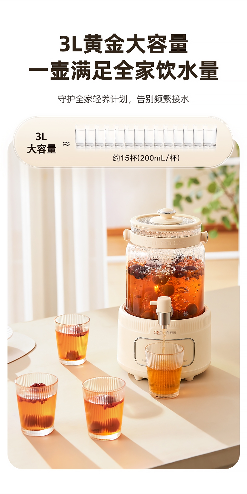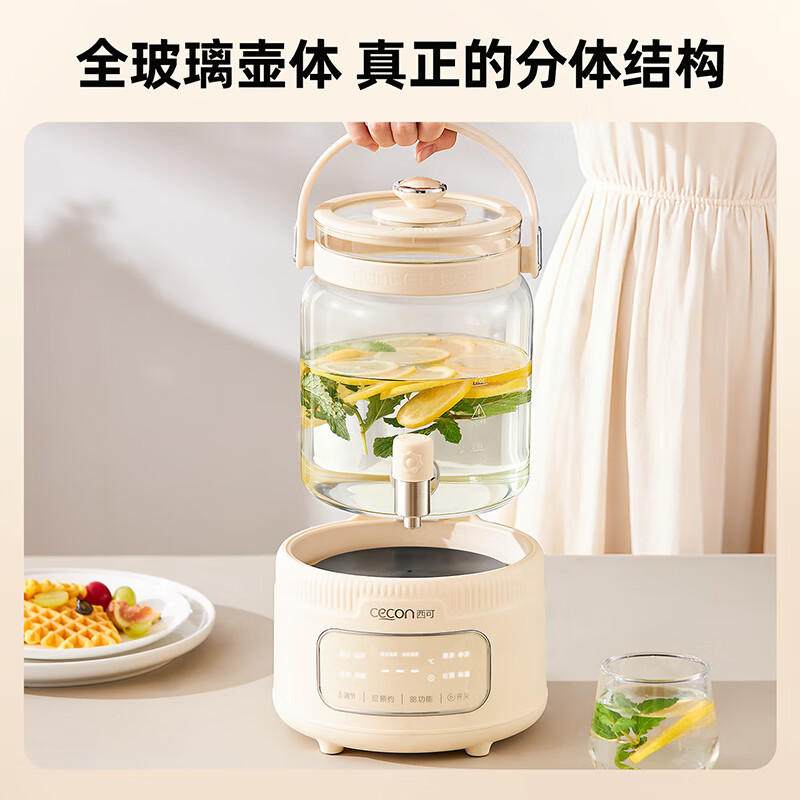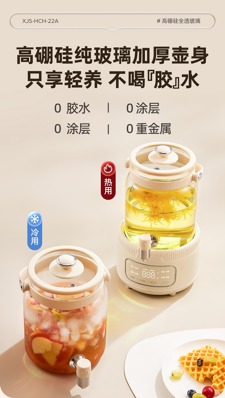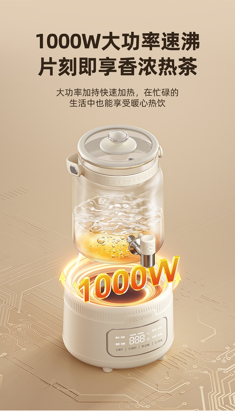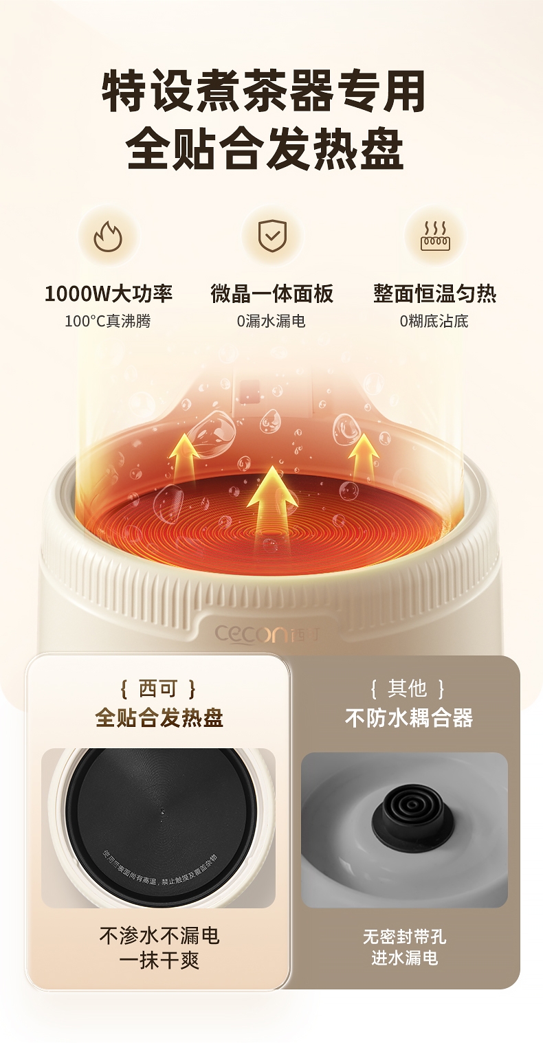 全玻璃水电分离壶体,不结水垢,;3L大容量,1000w快功率;选配0.7升加大加宽304不锈钢茶漏;微晶一体发热面板,整面恒温均热;带缺水保护,低水位可自动断电