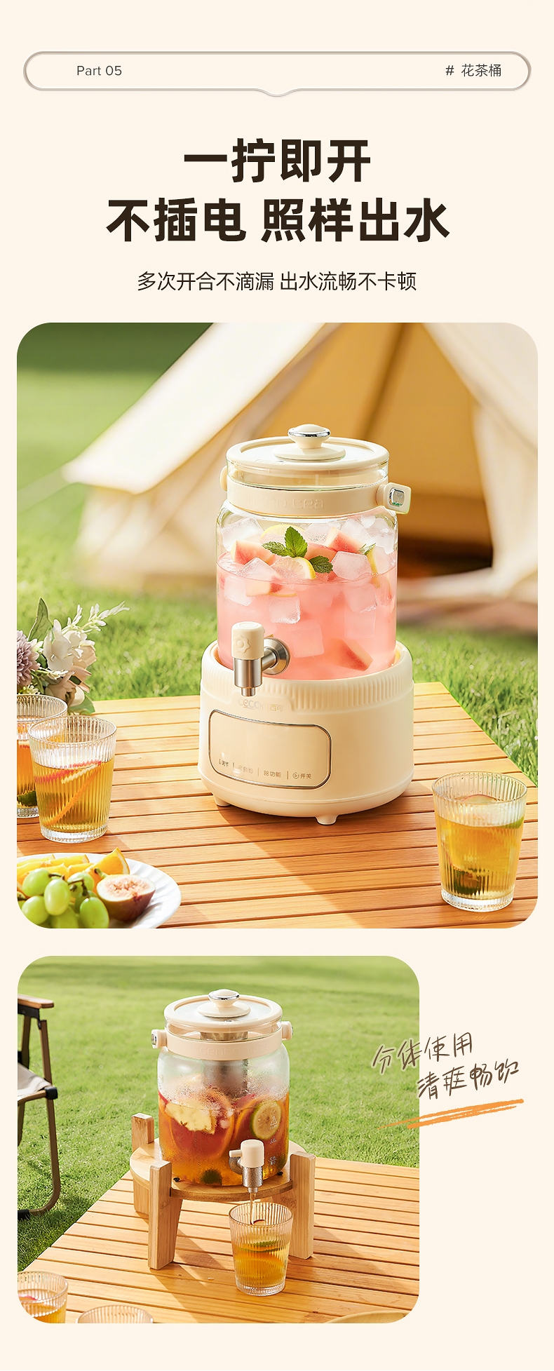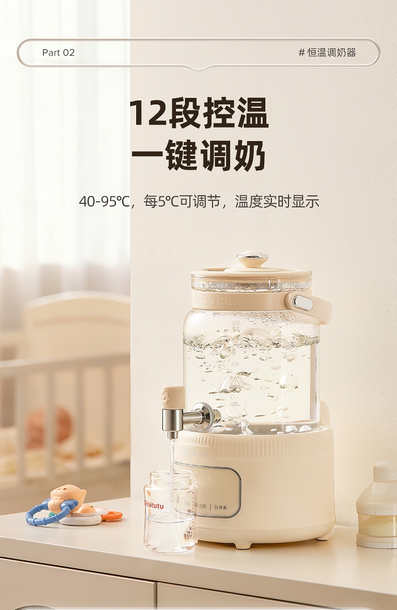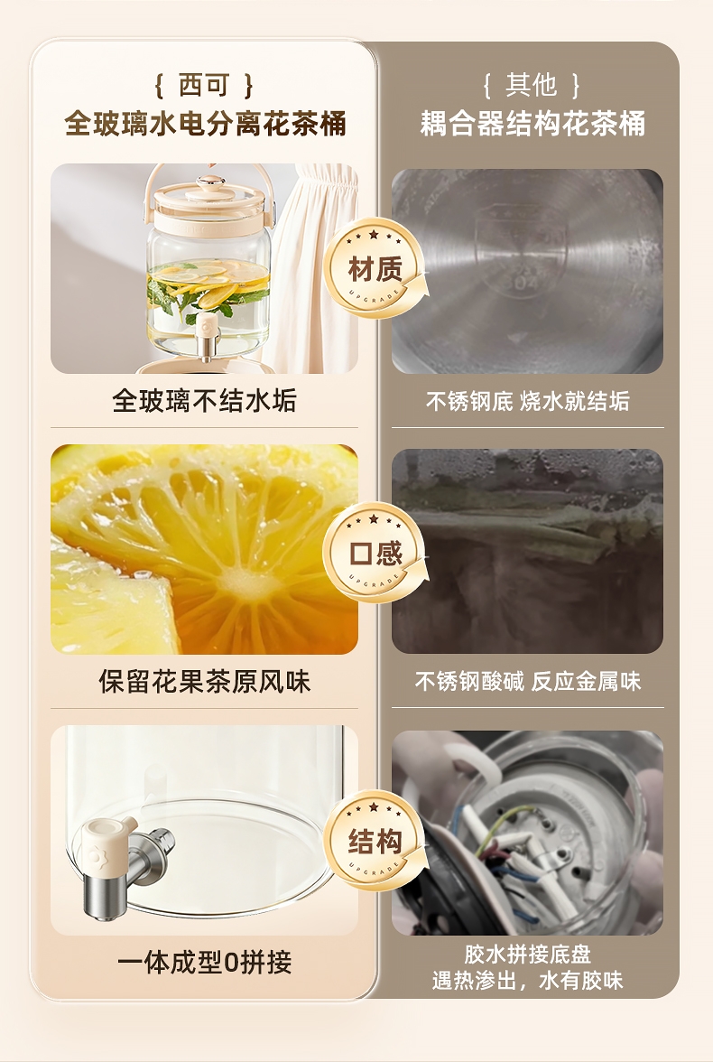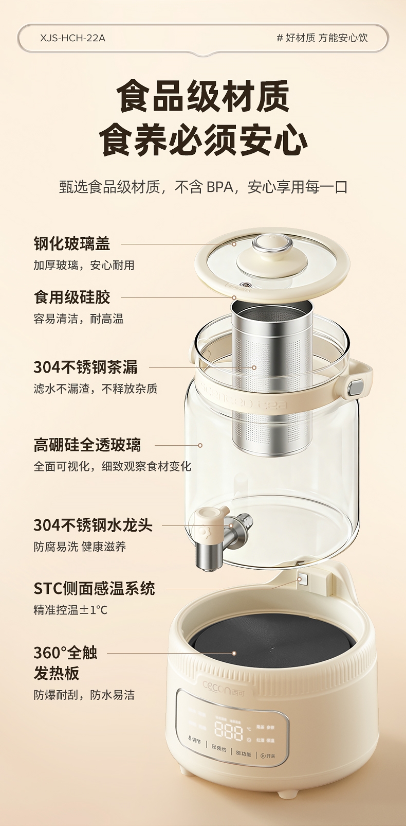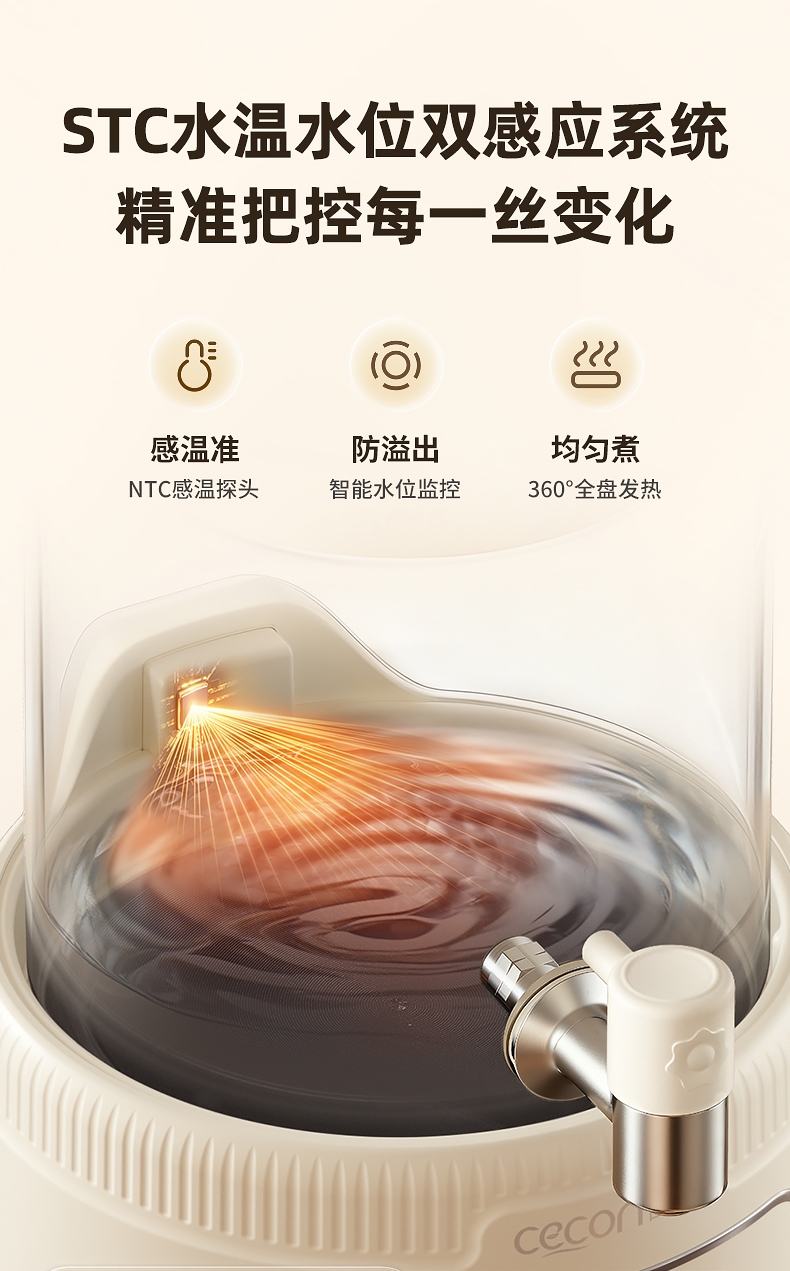 全玻璃水电分离壶体,不结水垢,;3L大容量,1000w快功率;选配0.7升加大加宽304不锈钢茶漏;微晶一体发热面板,整面恒温均热;带缺水保护,低水位可自动断电