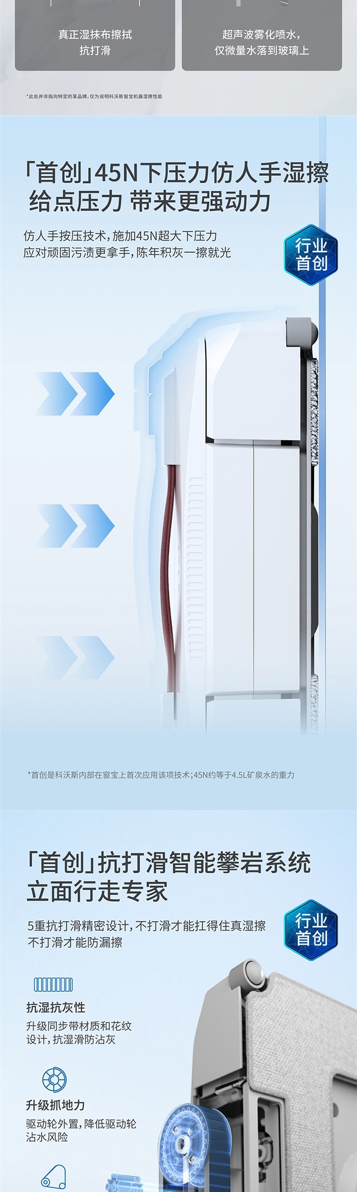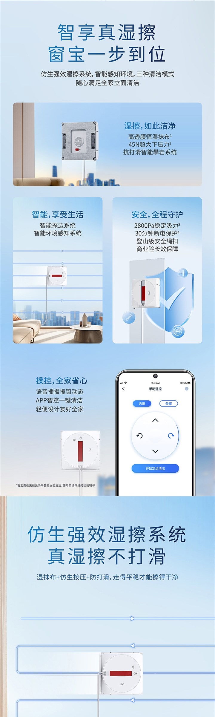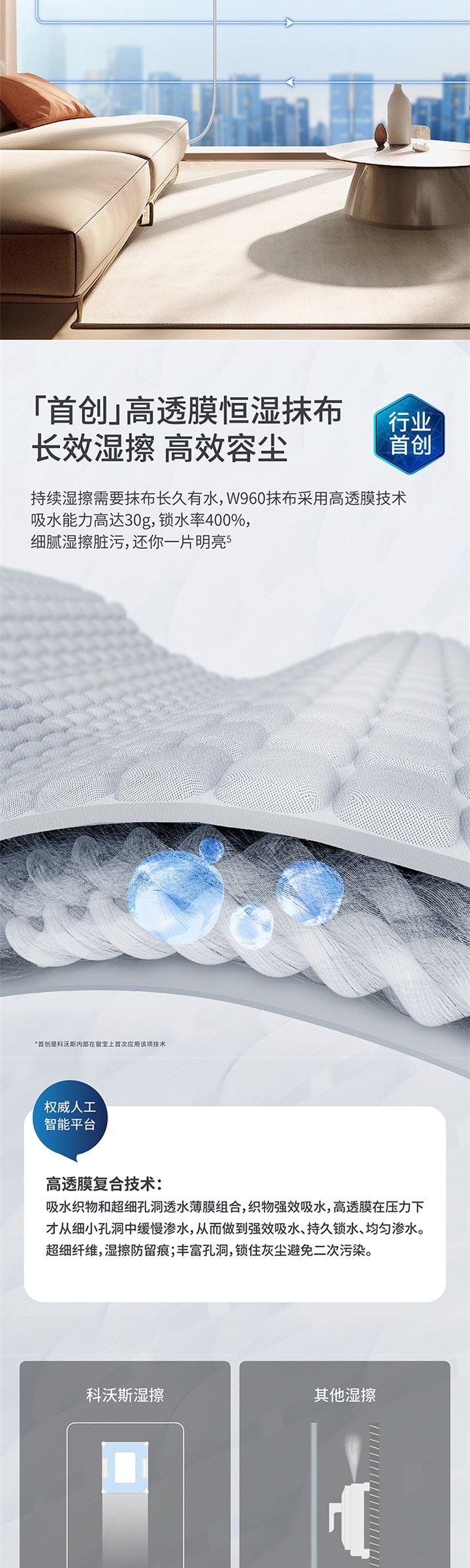仿生强效湿擦系统,智能感知环境,三种清洁模式;吸水能力高达30g,锁水率400%,;细腻湿擦脏污,还你一片明亮