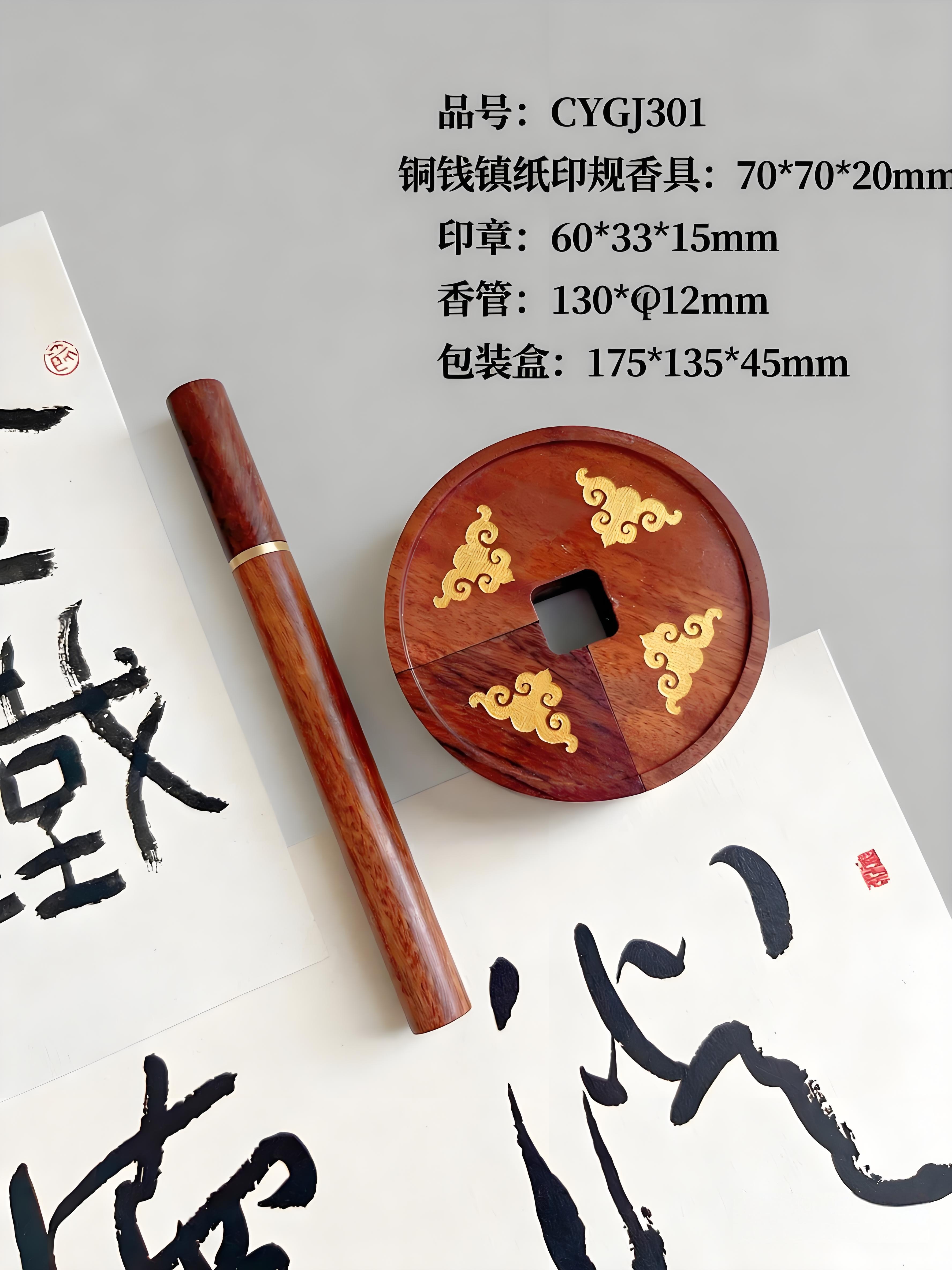 配置清单:铜钱镇纸印规香具*1、布币印章*1、酸枝短香管*1
