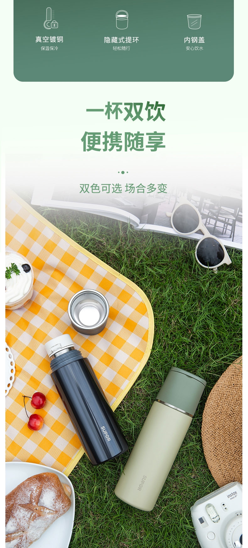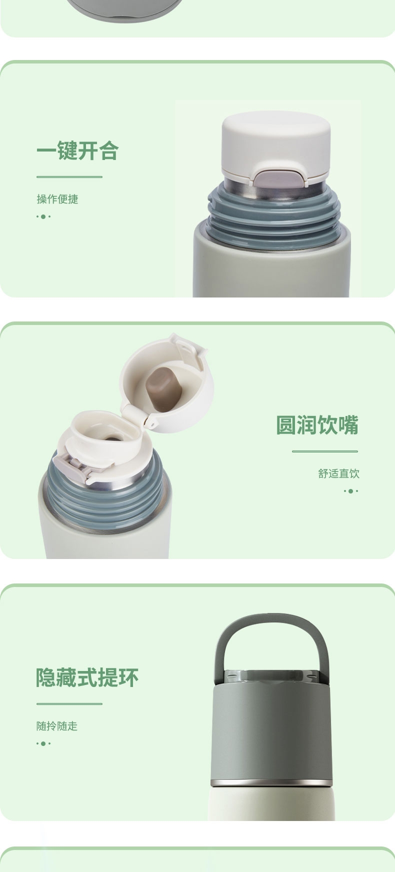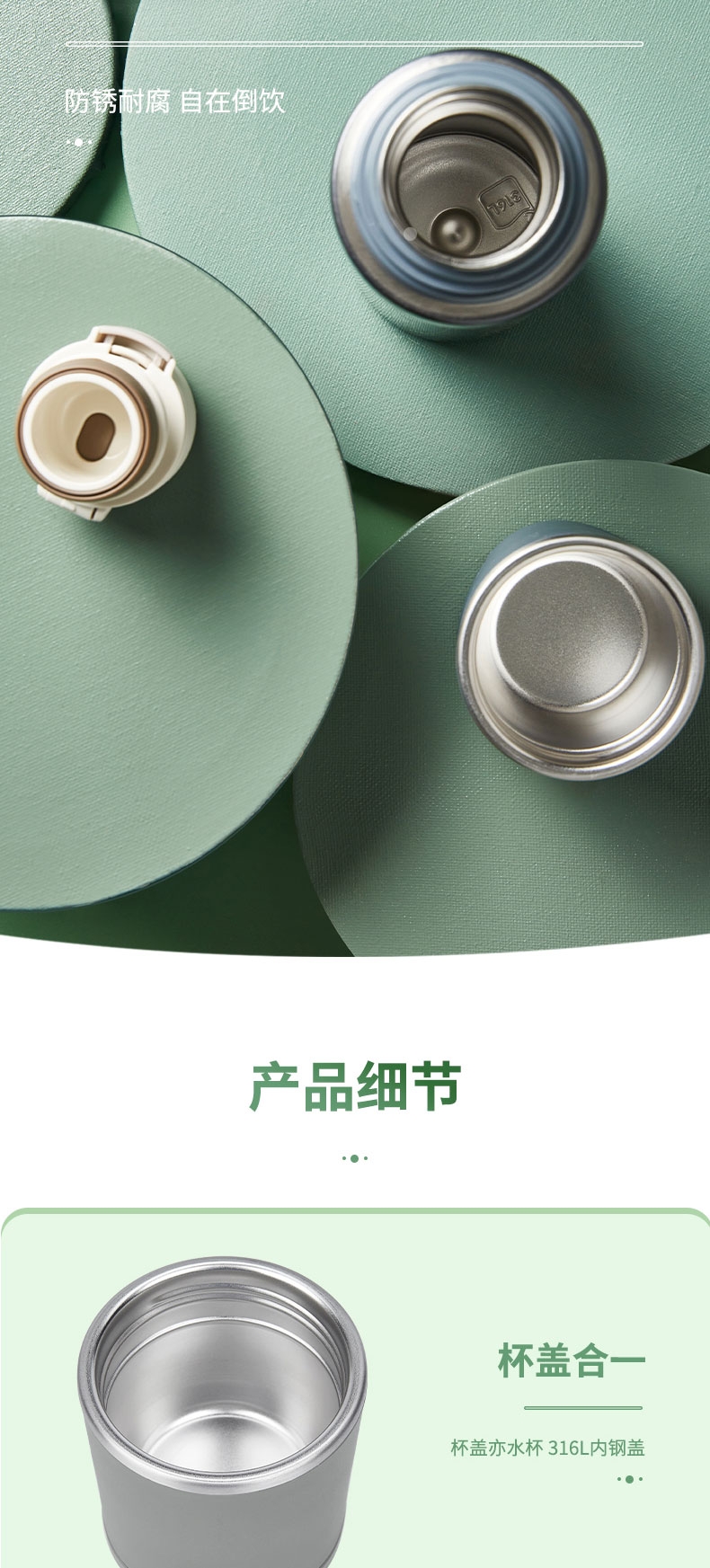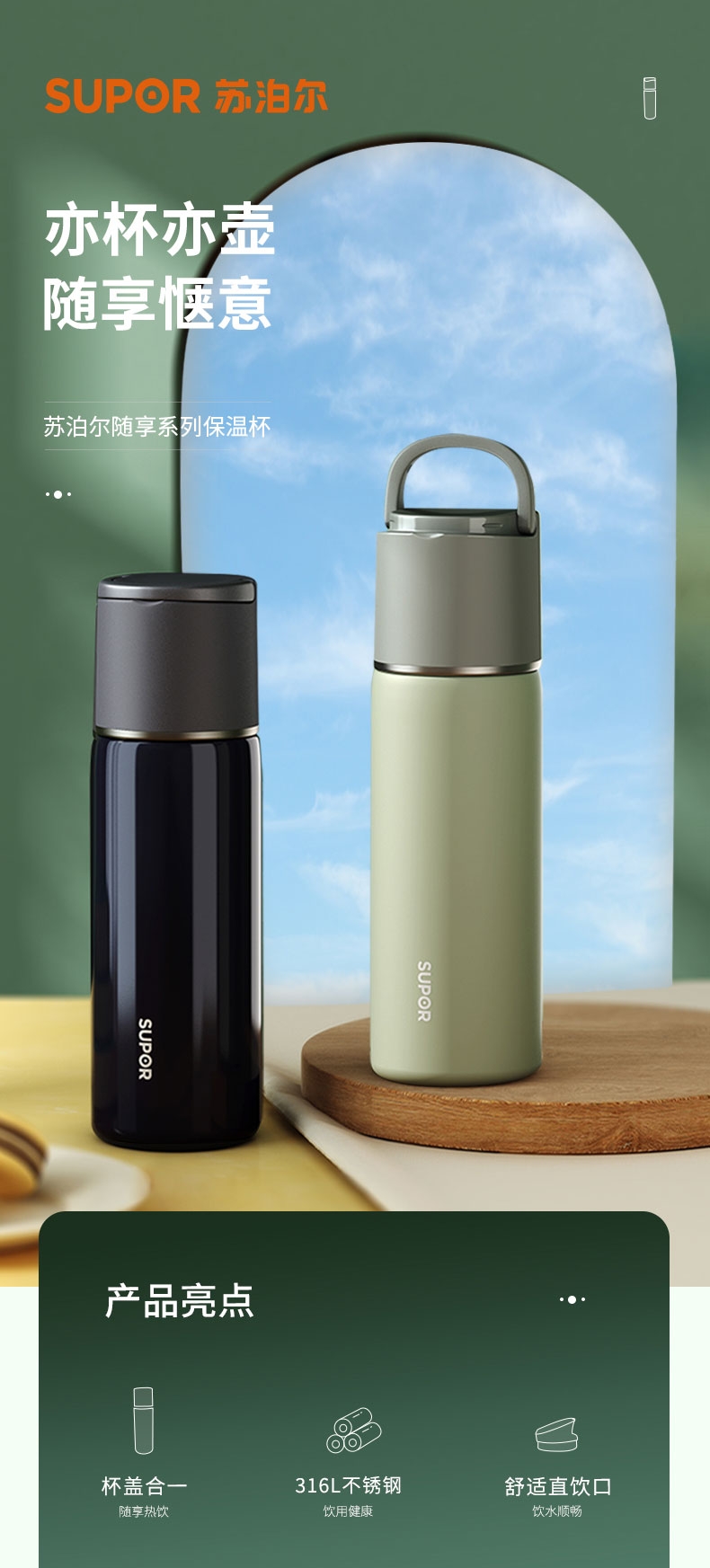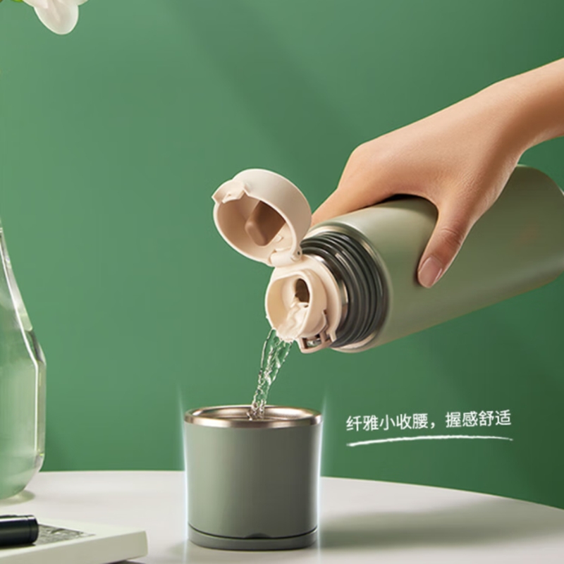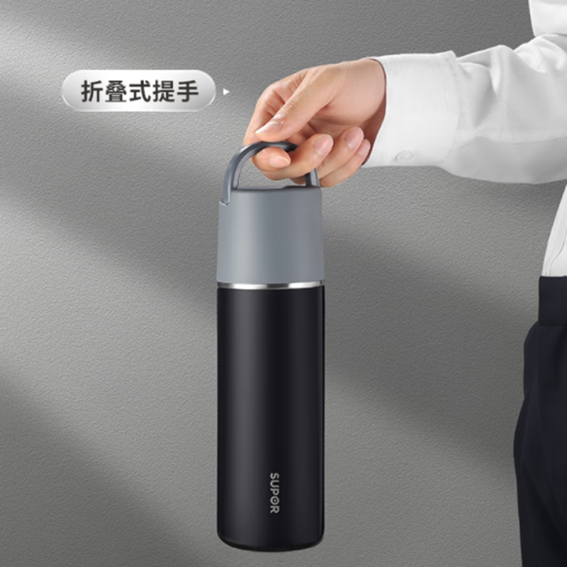 一杯双饮,杯盖合一,随享热饮;;舒适直饮口,饮水顺畅 隐藏式提环,轻松随行;内钢盖,安心饮水