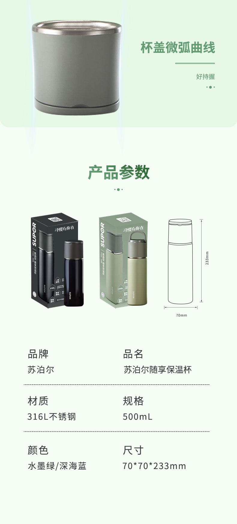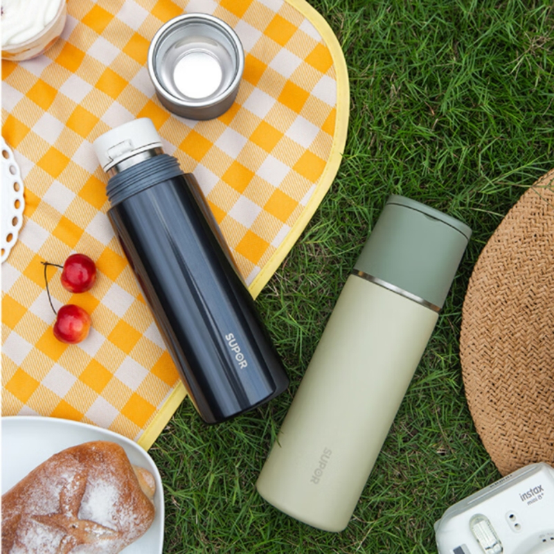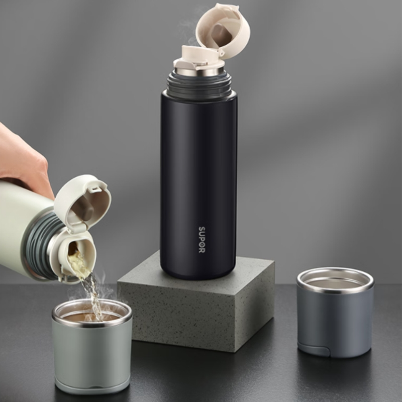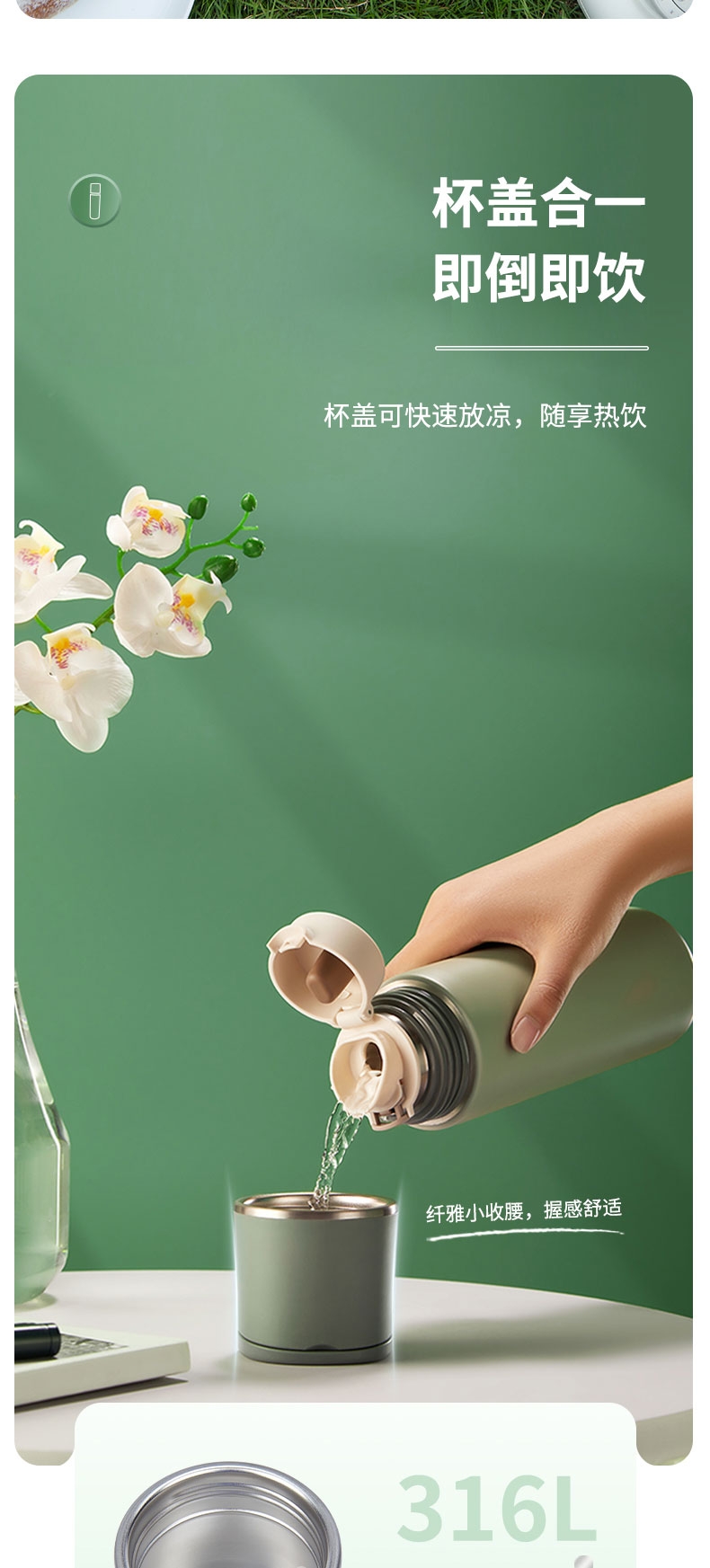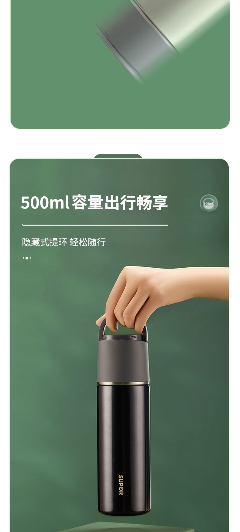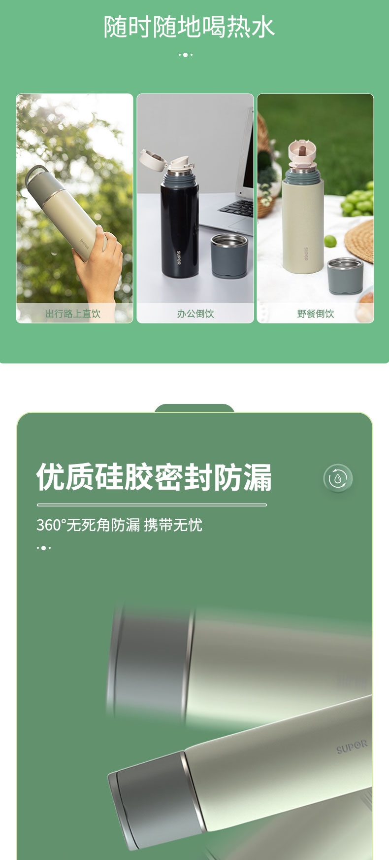 一杯双饮,杯盖合一,随享热饮;;舒适直饮口,饮水顺畅 隐藏式提环,轻松随行;内钢盖,安心饮水