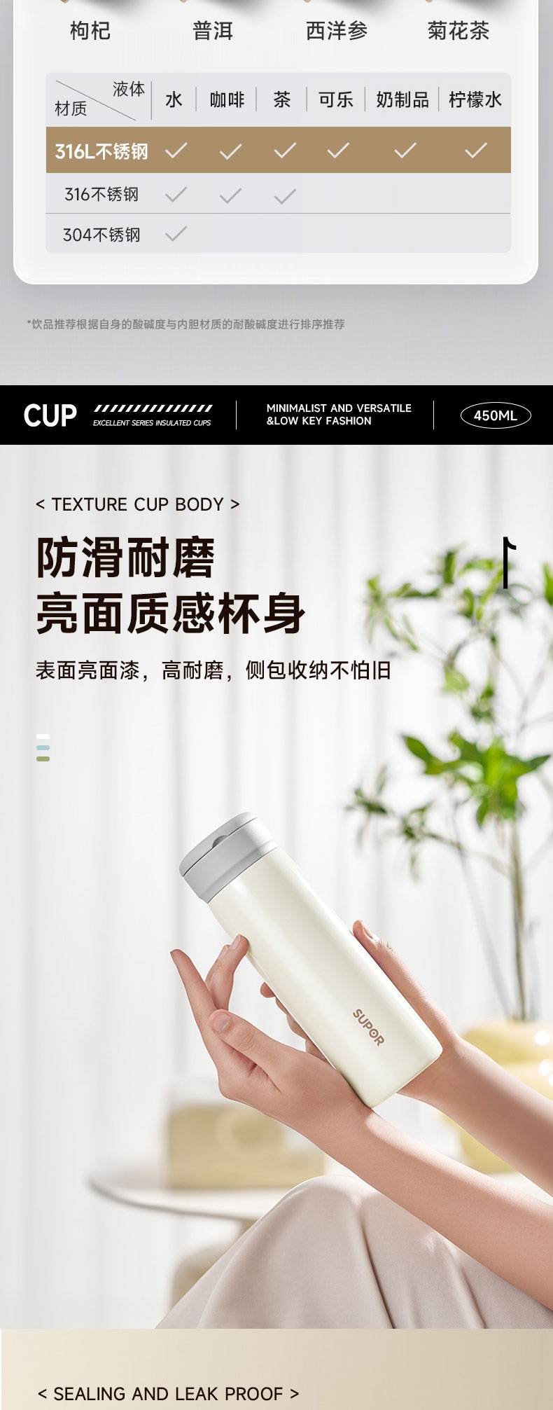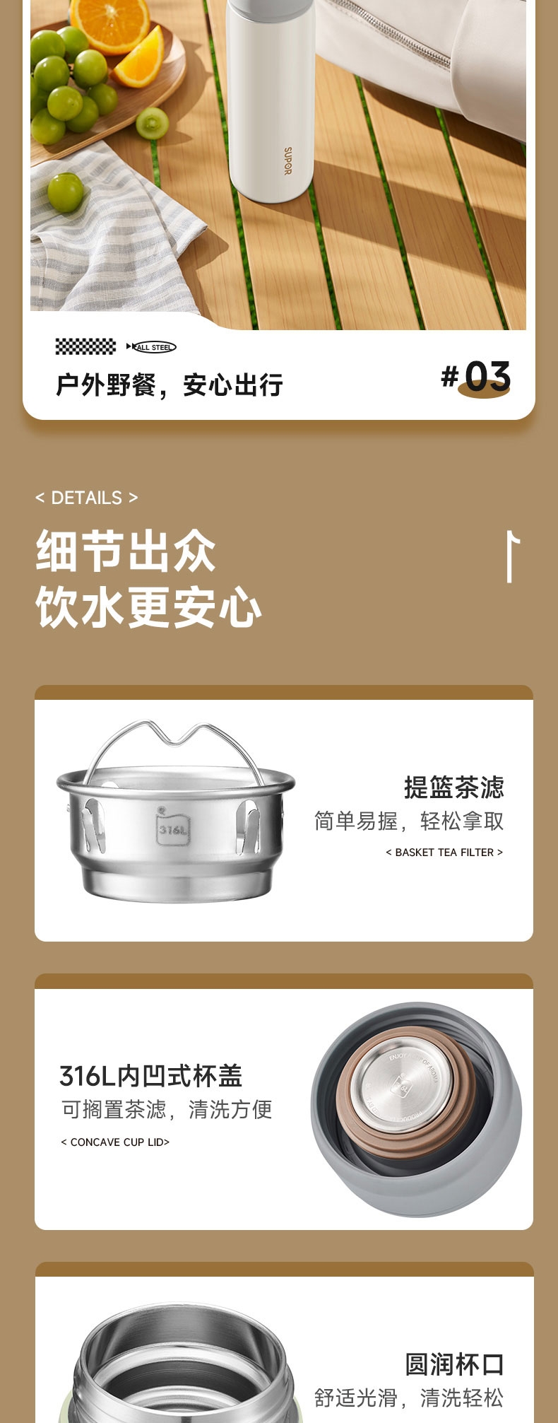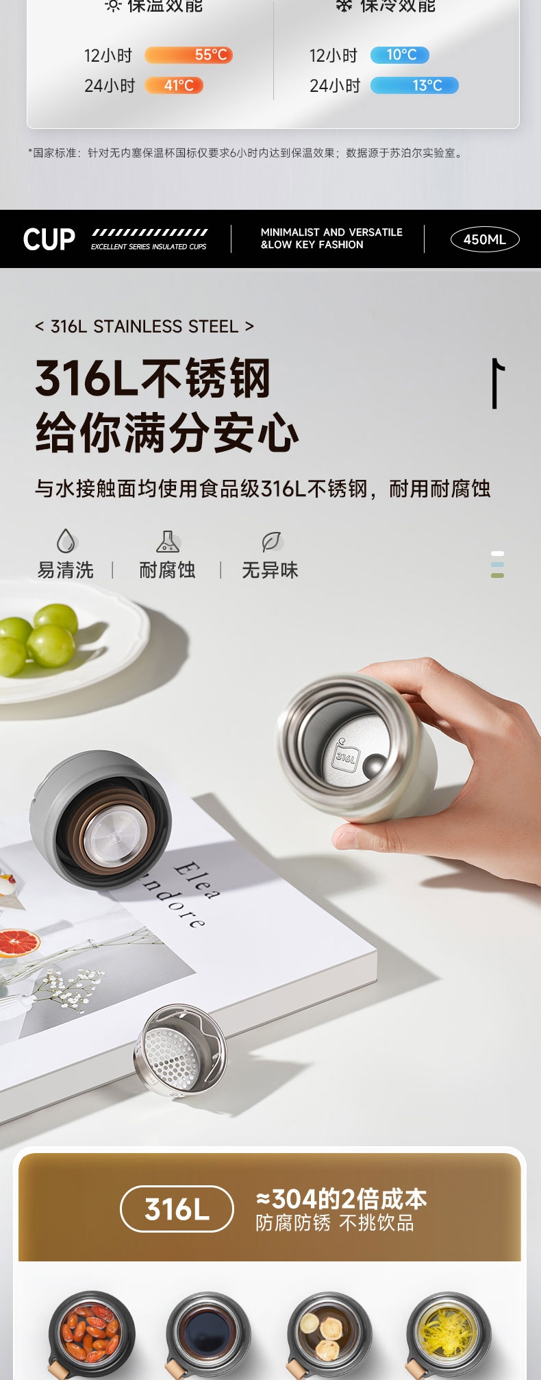 316L不锈钢,耐磨耐用耐腐蚀;密封设计,倒置不漏;双层真空,隔绝温度流失