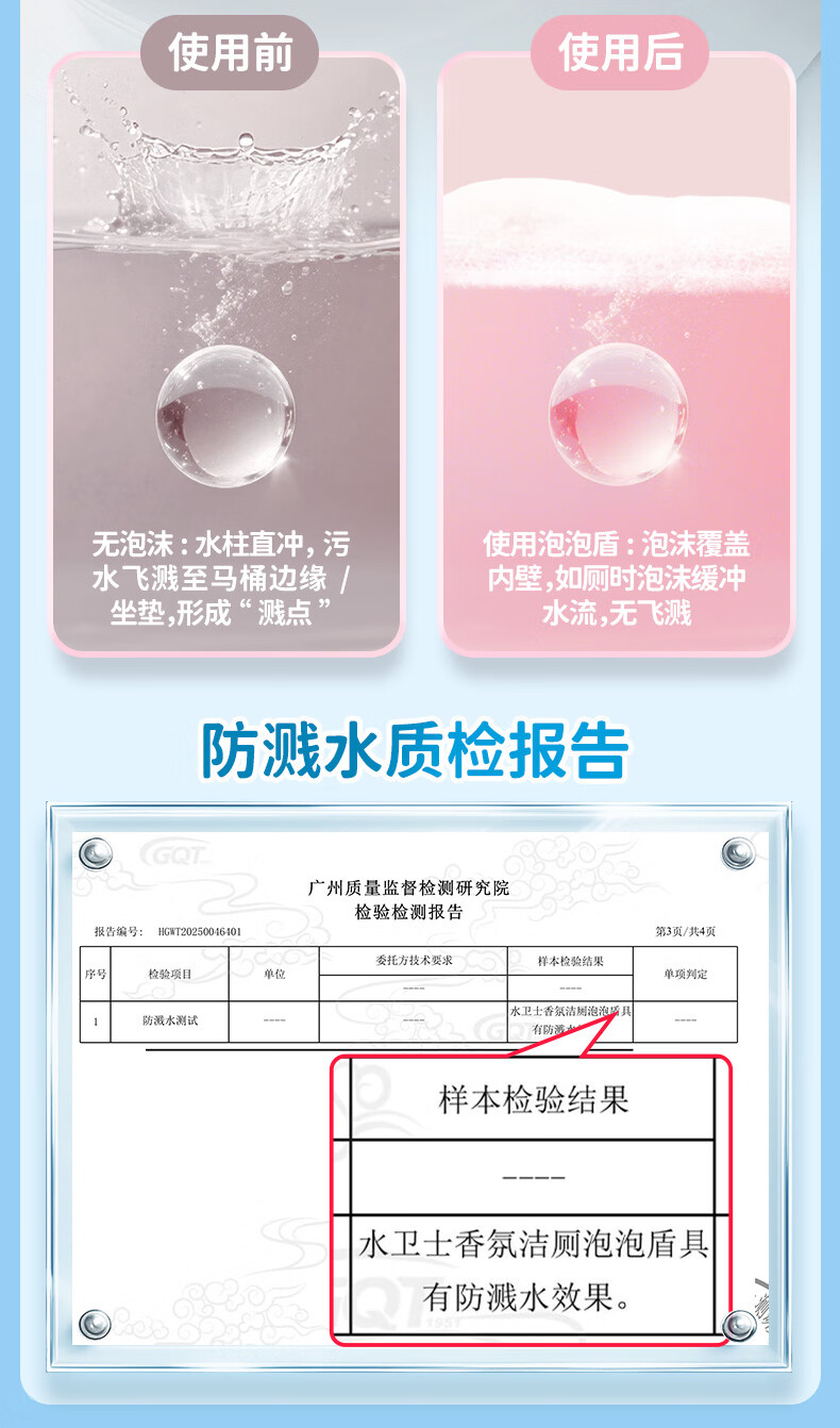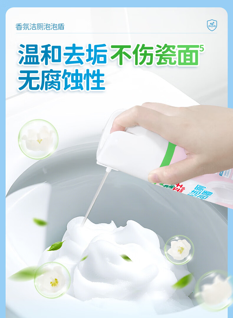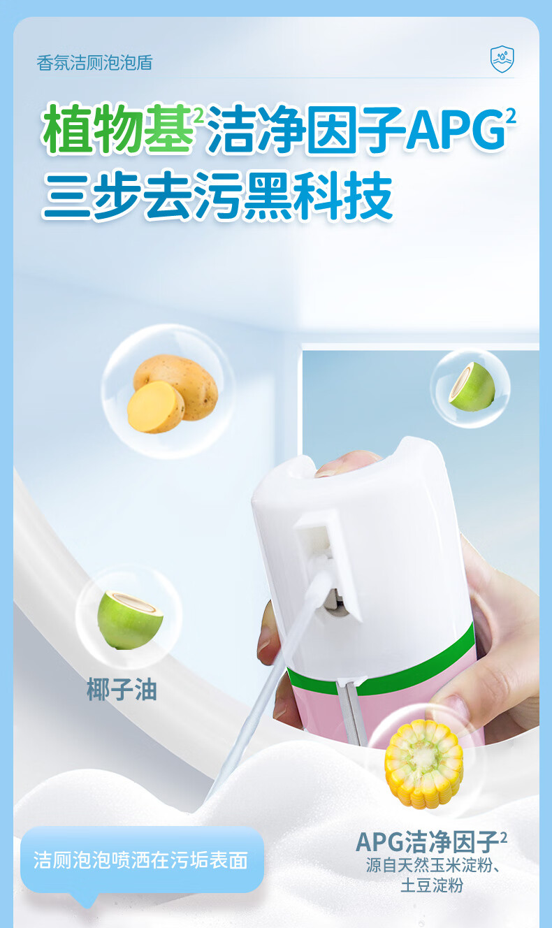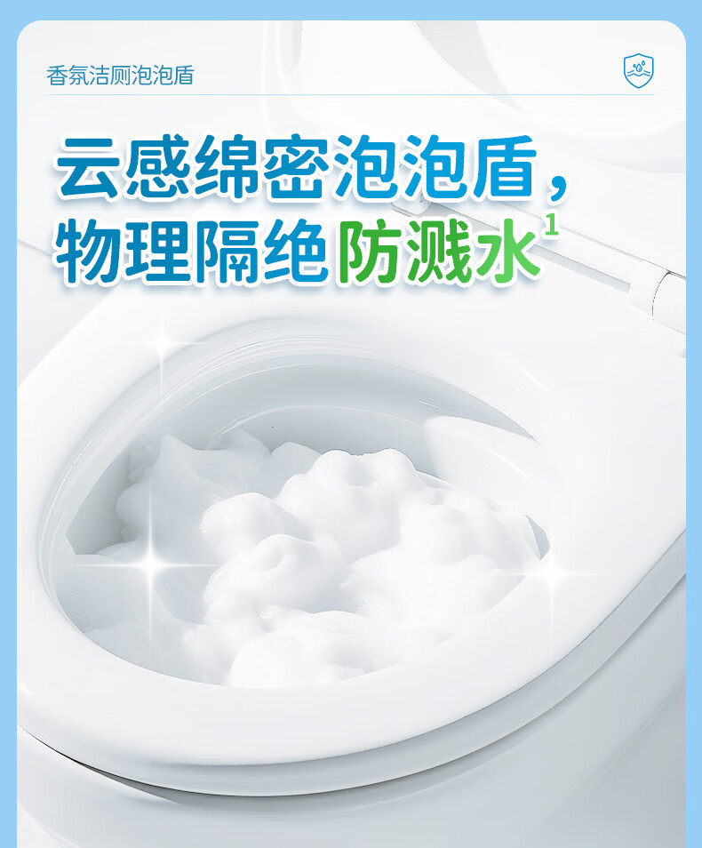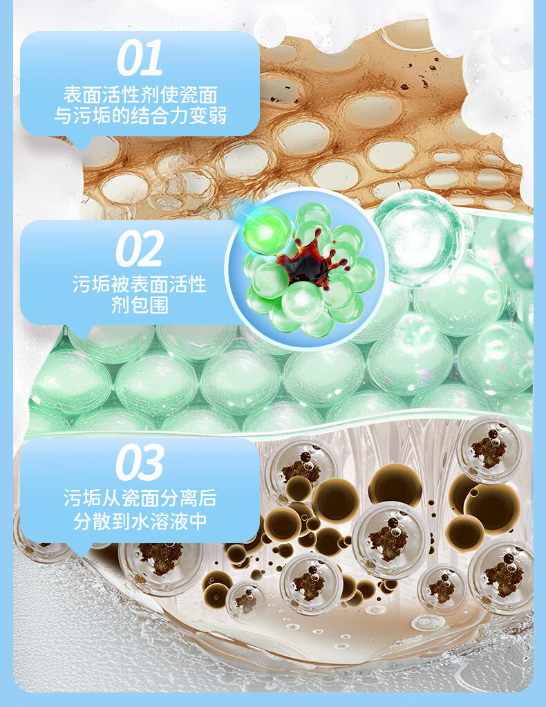 云感绵密泡泡盾,物理隔绝防溅水;植物基洁净因子APG²,三步去污黑科技;温和去垢,不伤瓷面,无腐蚀性