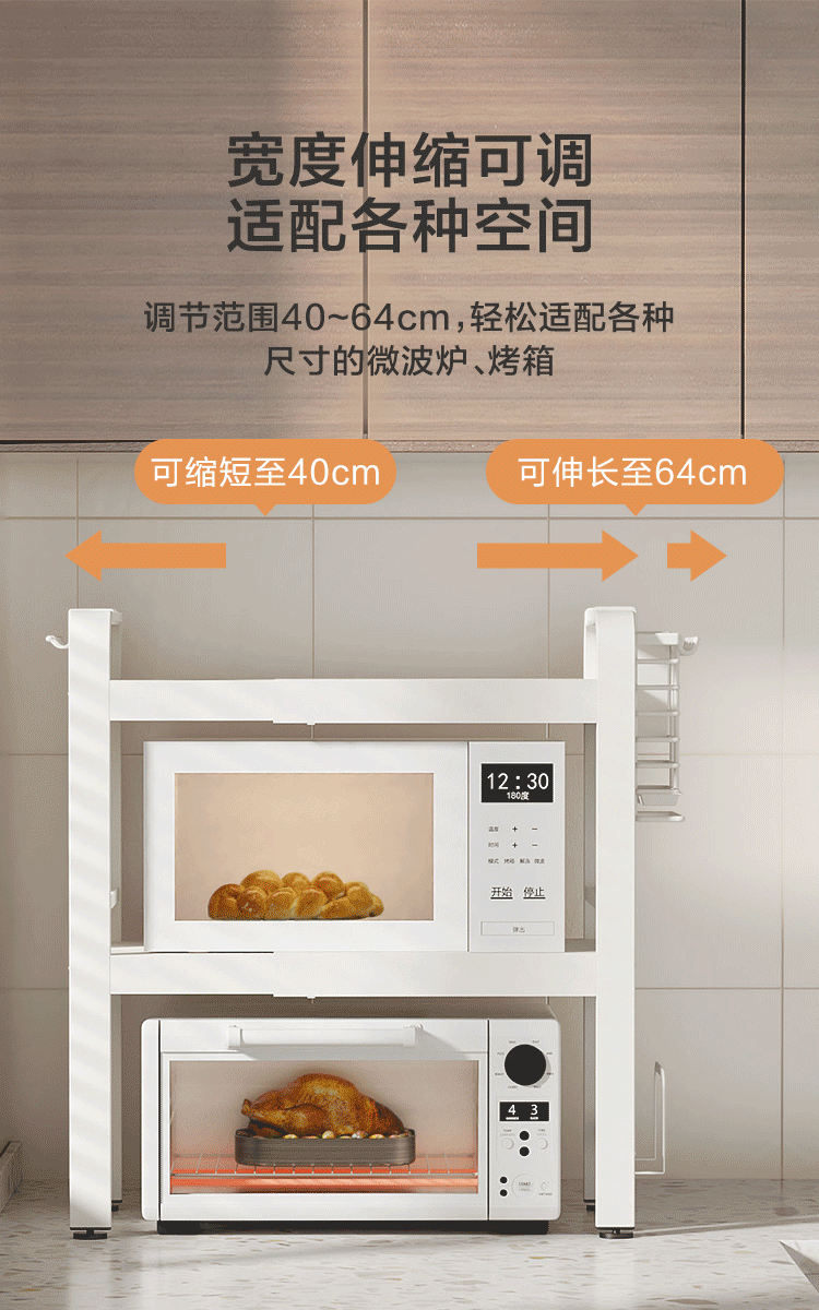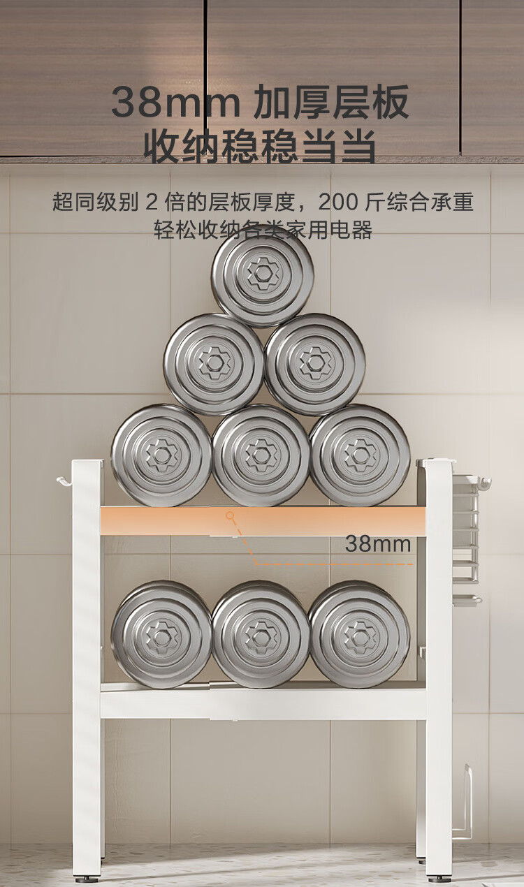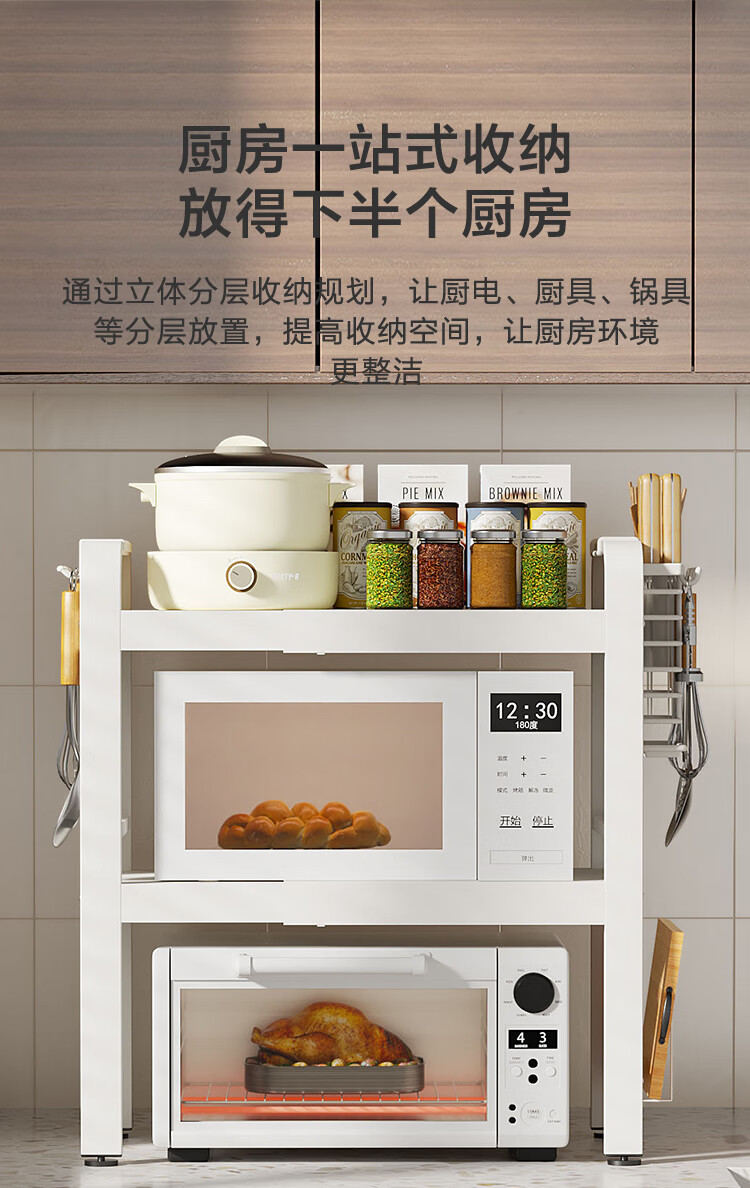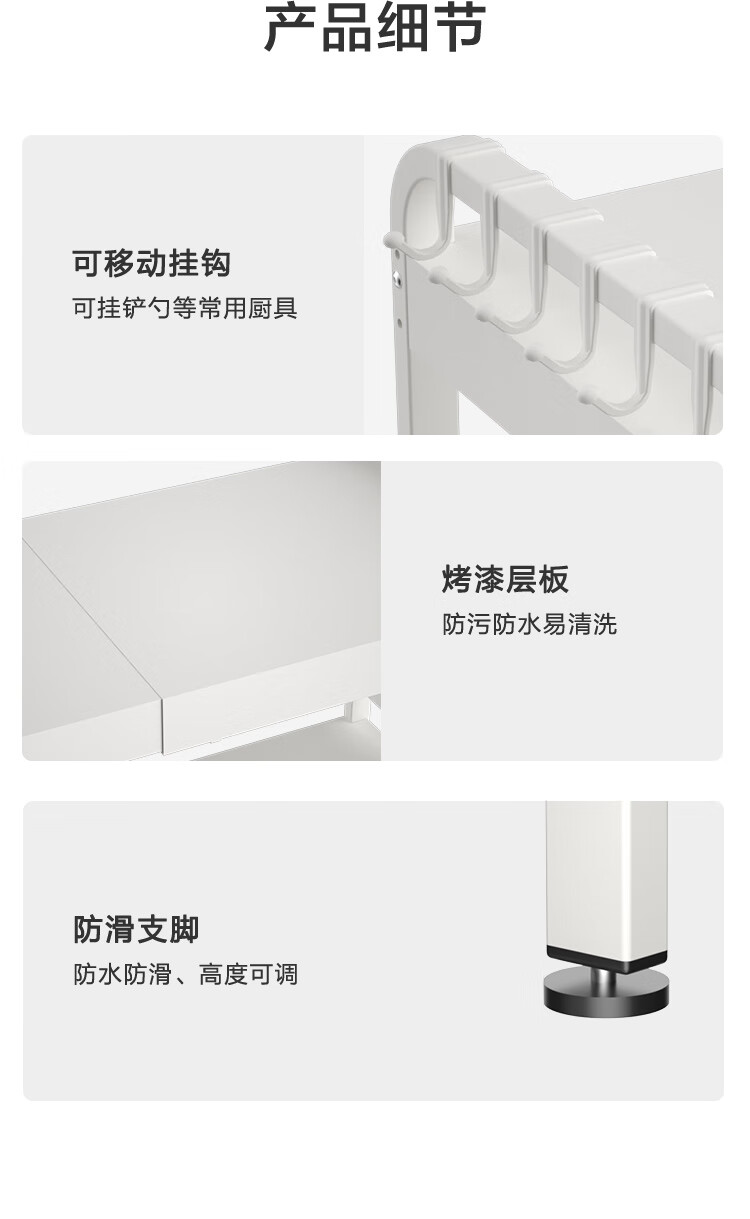 厨房十站式收纳放得下半个厨房;38mm 加厚层板收纳稳稳当当;宽度伸缩可调适配各种空间