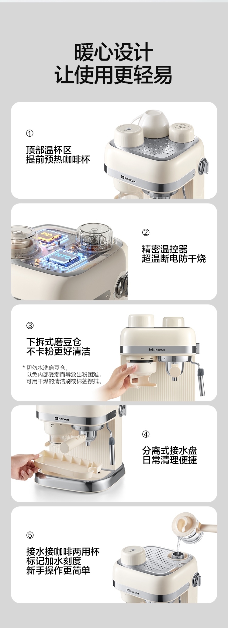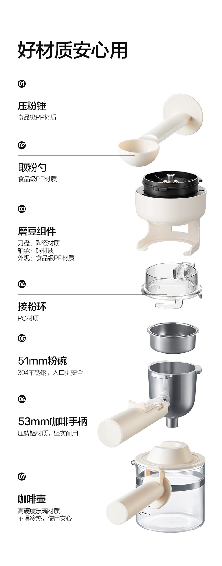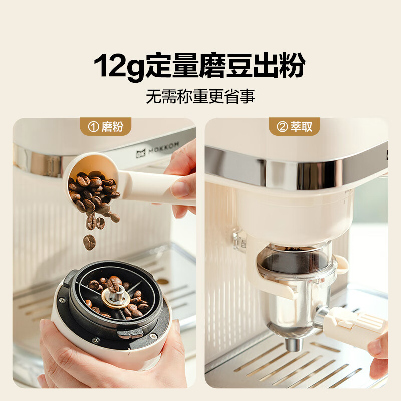 研磨萃取一体,两步做杯好咖啡;小豆仓定量,磨豆精准出粉,无需称重更加省事;一键磨豆,免调节档位。即按即磨,出粉迅速