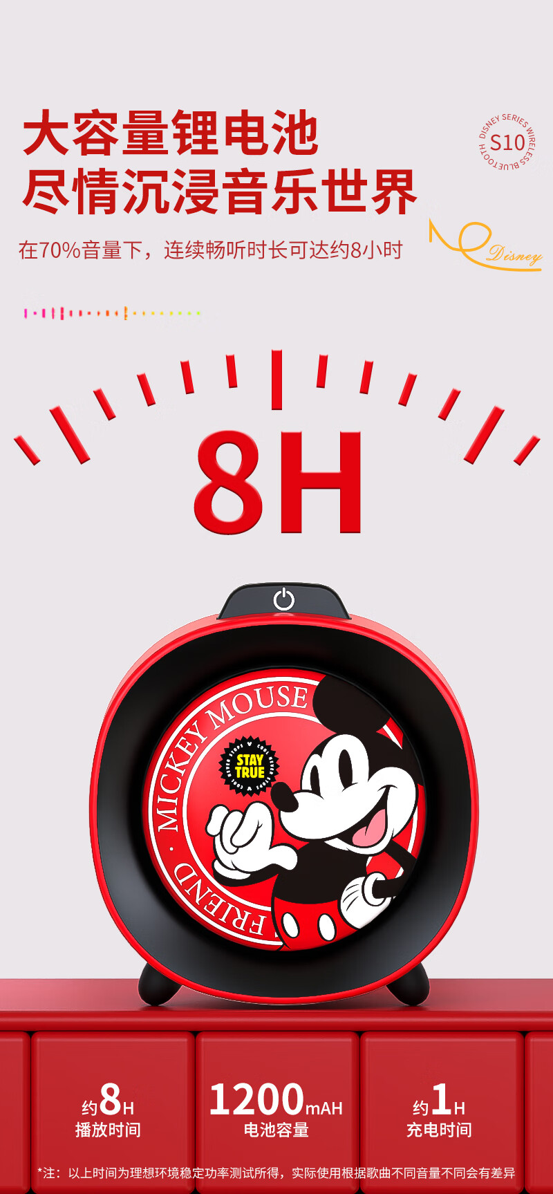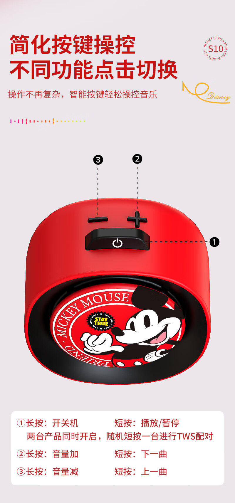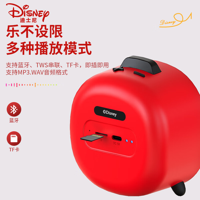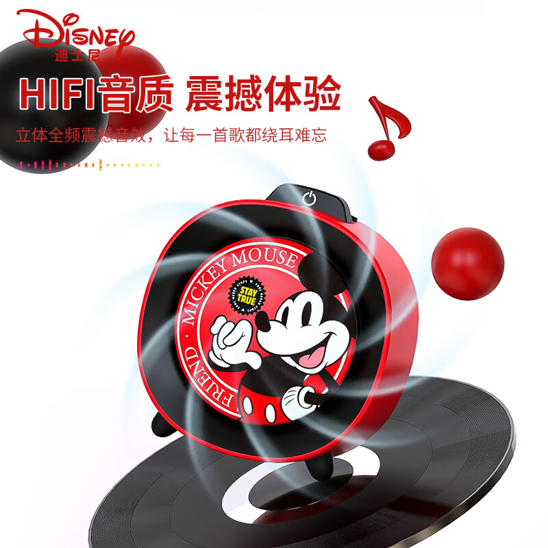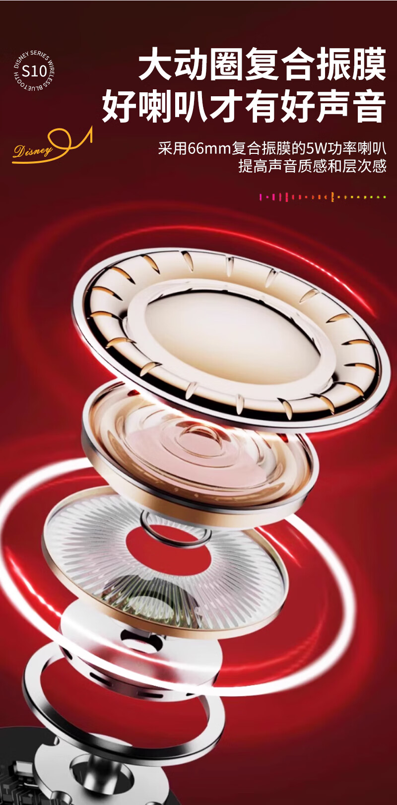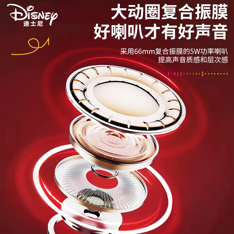 迪士尼正版授权,时尚潮流外观设计,圆润小巧;66mm全频动圈喇叭,劲享hifi音质;支持2个TWS连接,秒变立体声2.0小影院