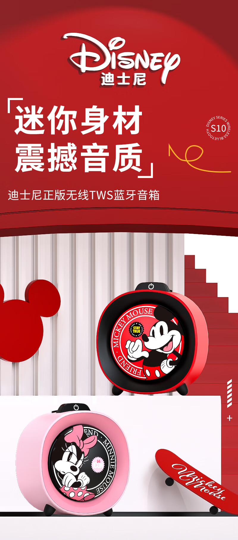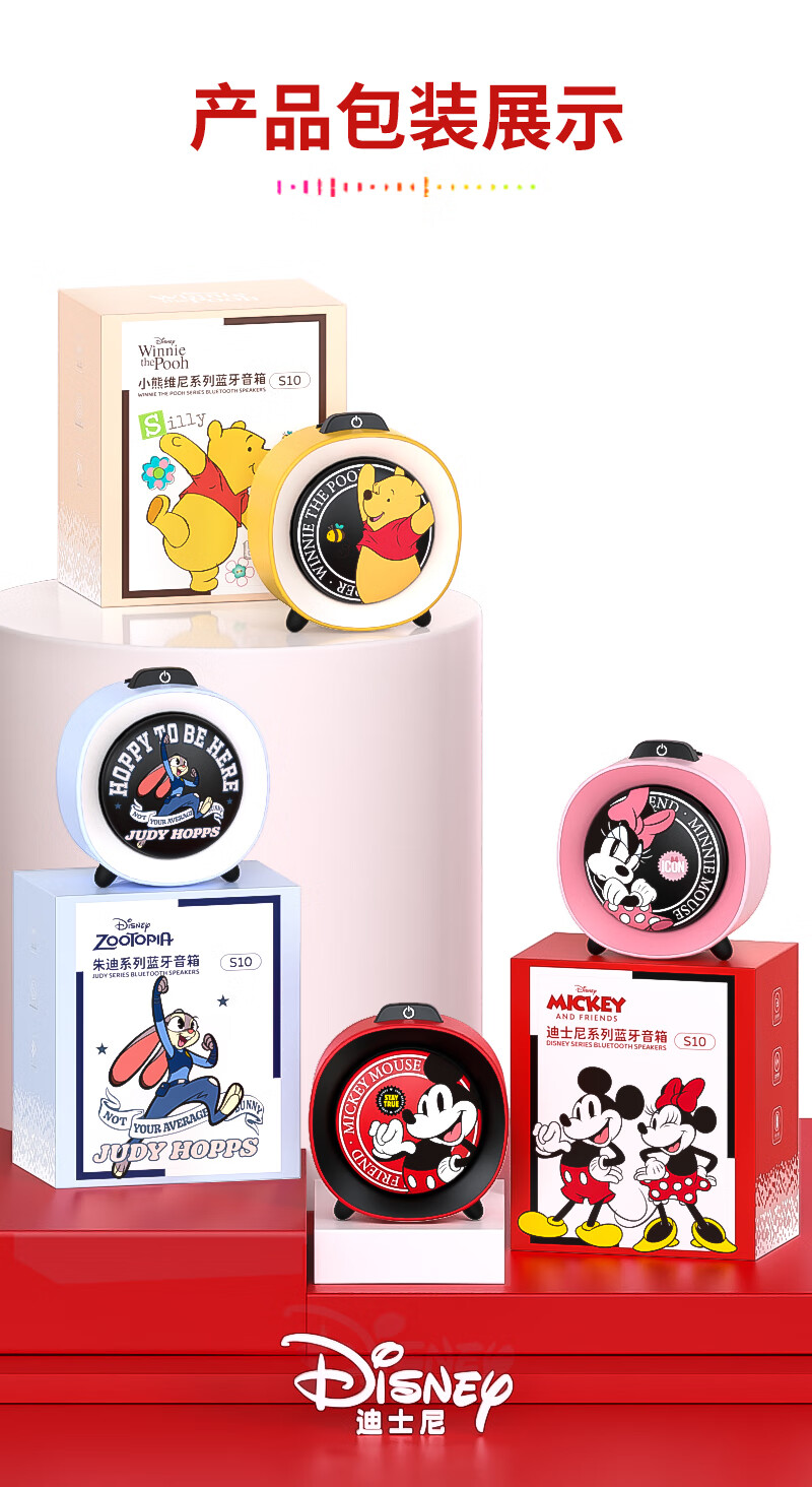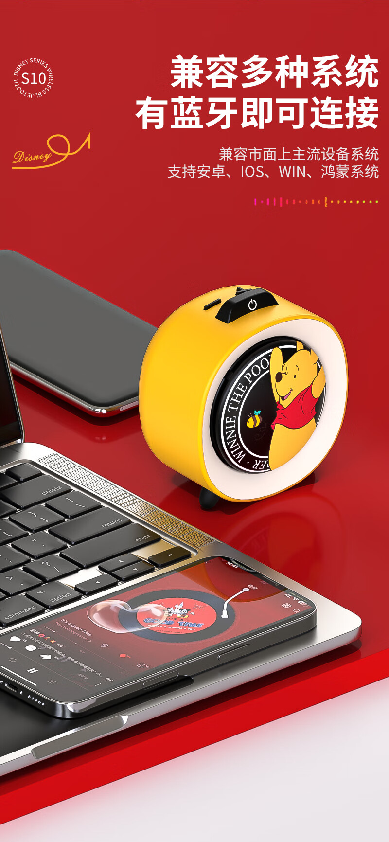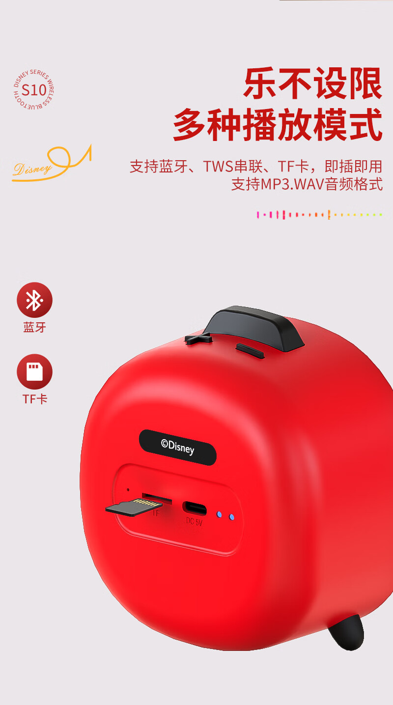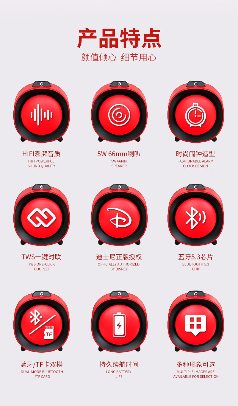 迪士尼正版授权,时尚潮流外观设计,圆润小巧;66mm全频动圈喇叭,劲享hifi音质;支持2个TWS连接,秒变立体声2.0小影院