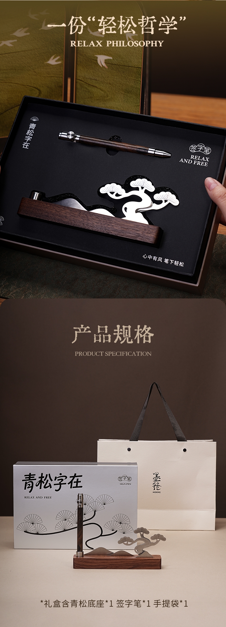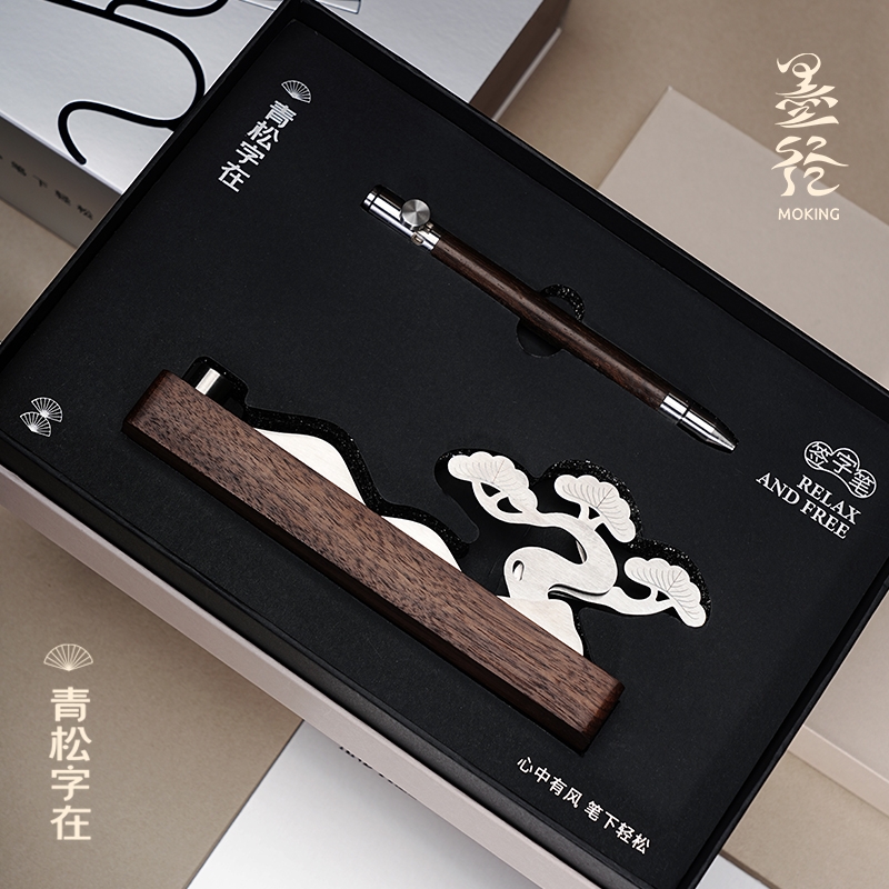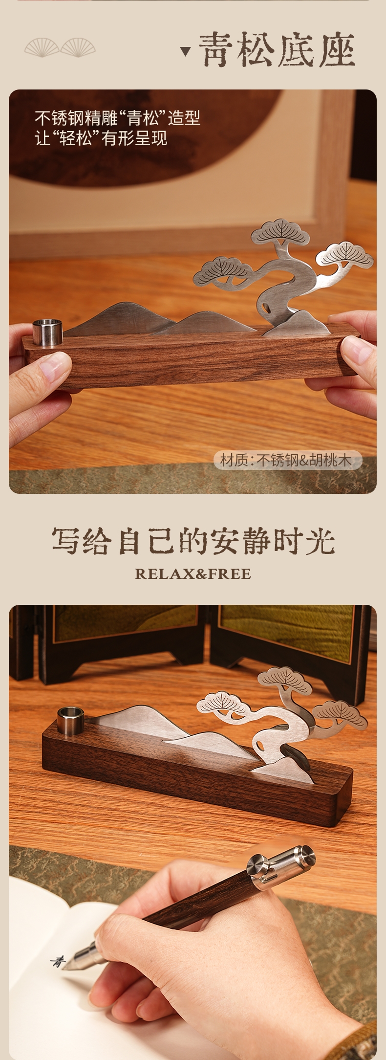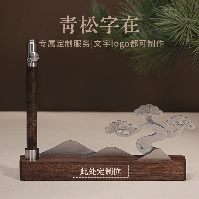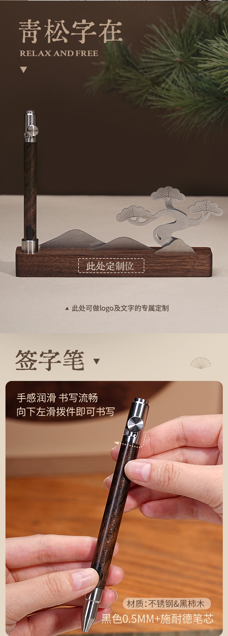 材质:青松底座——胡桃木+不锈钢 签字笔——黑柿木+不锈钢