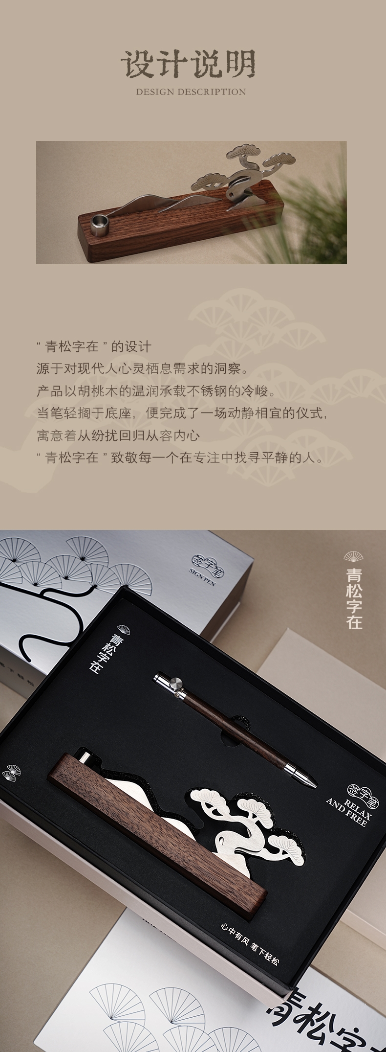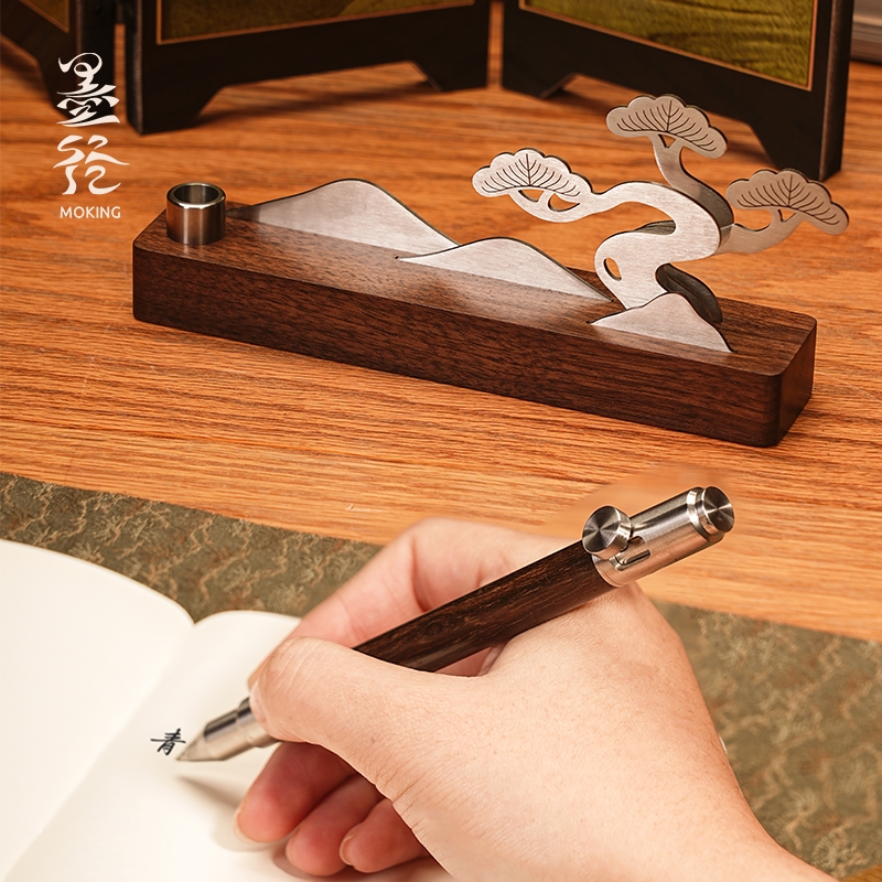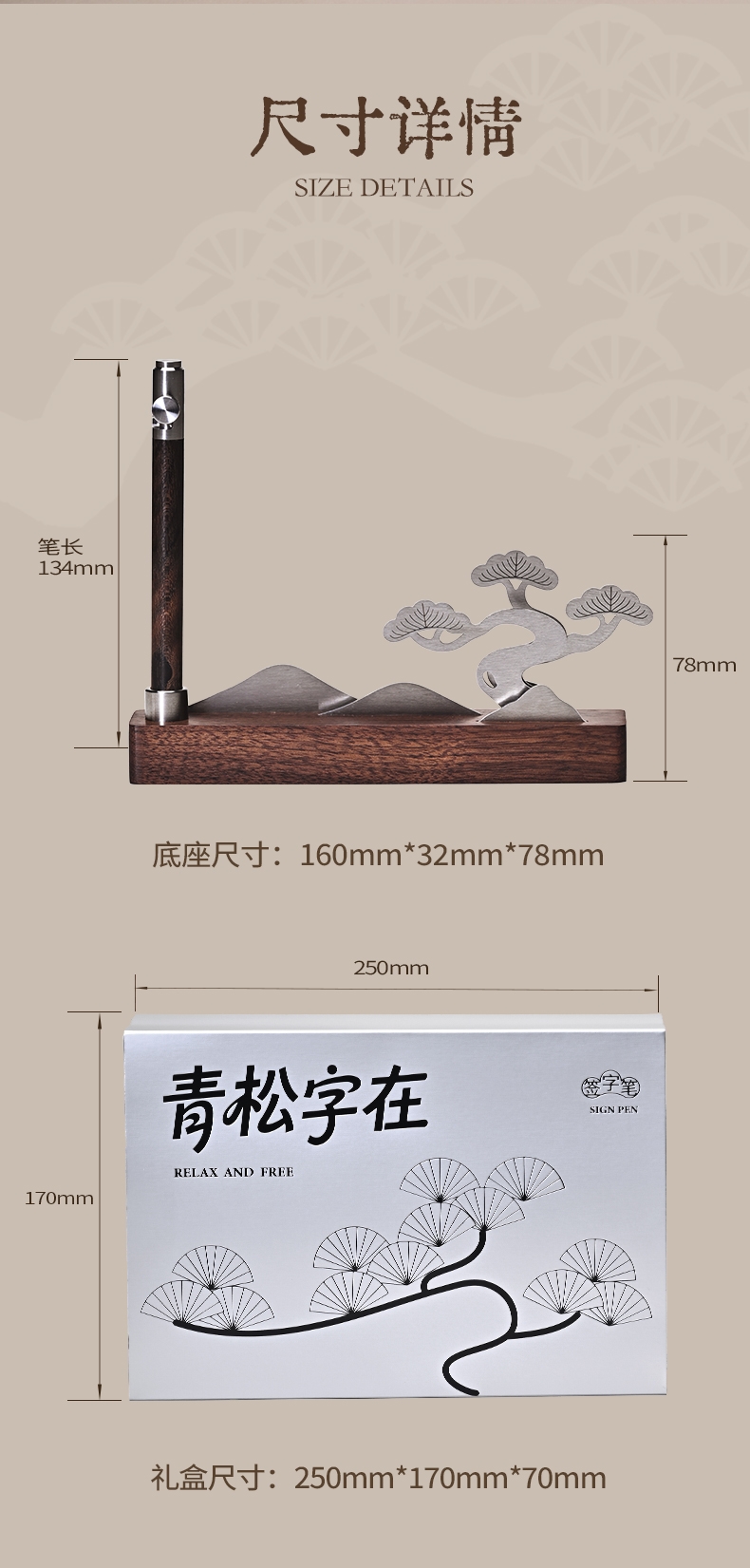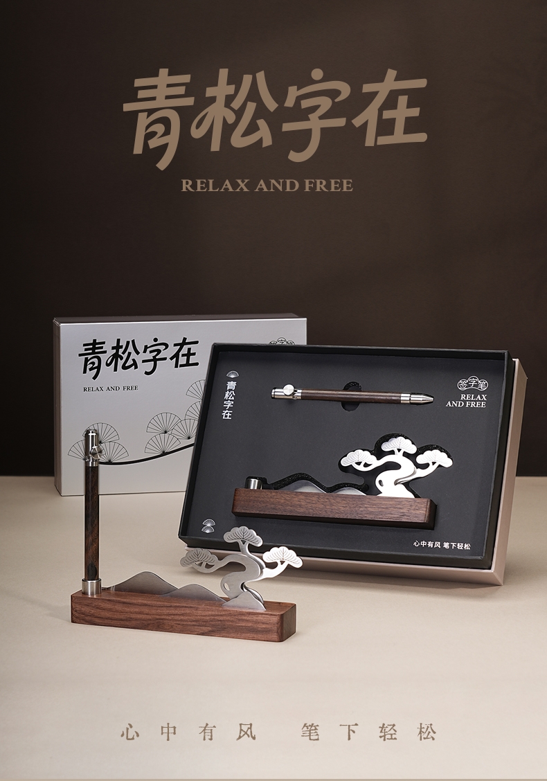 材质:青松底座——胡桃木+不锈钢 签字笔——黑柿木+不锈钢