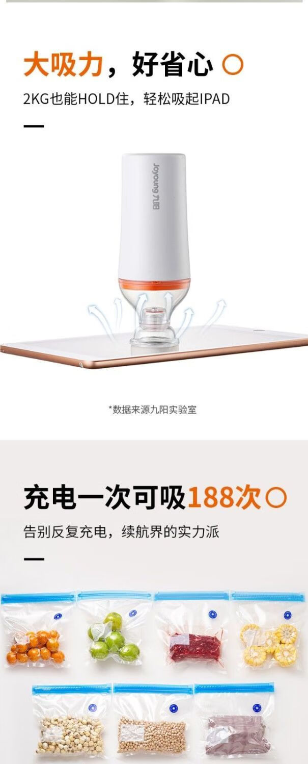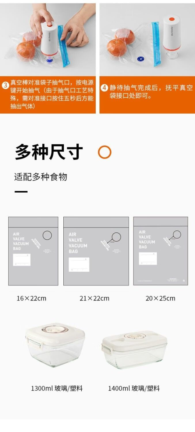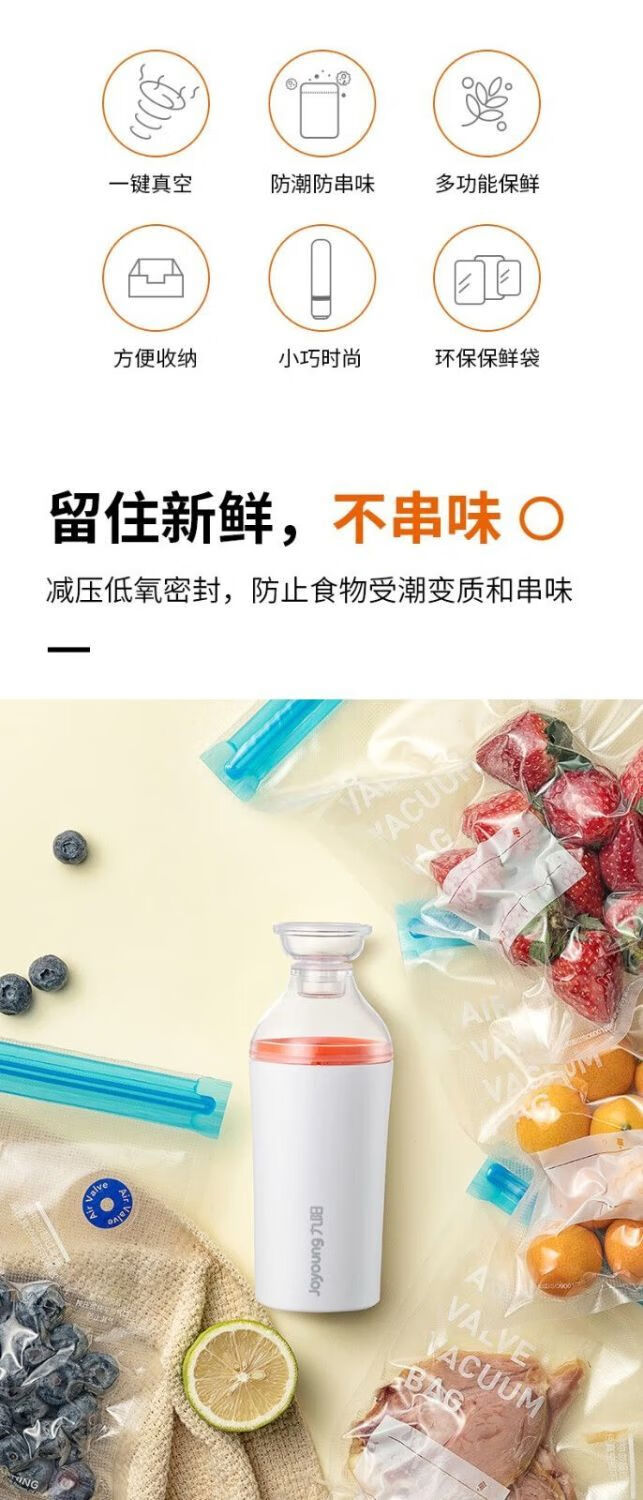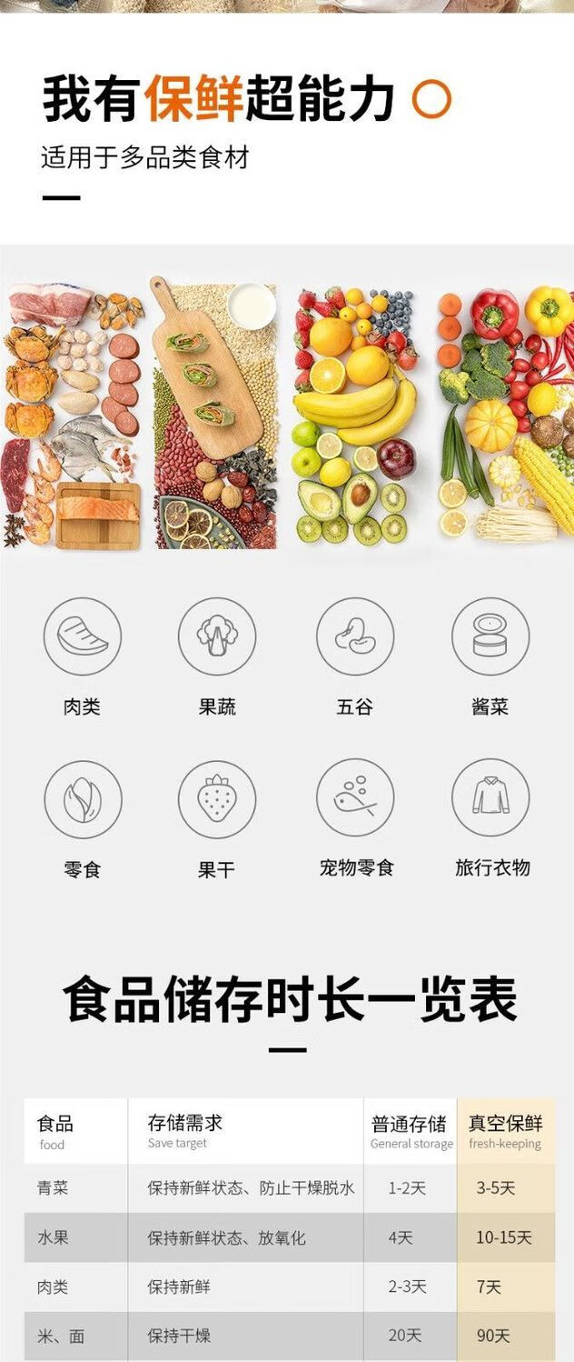 一键锁鲜,防腐防潮防串味;减压低氧密封,防止食物受潮变质和串味;大吸力,好省心