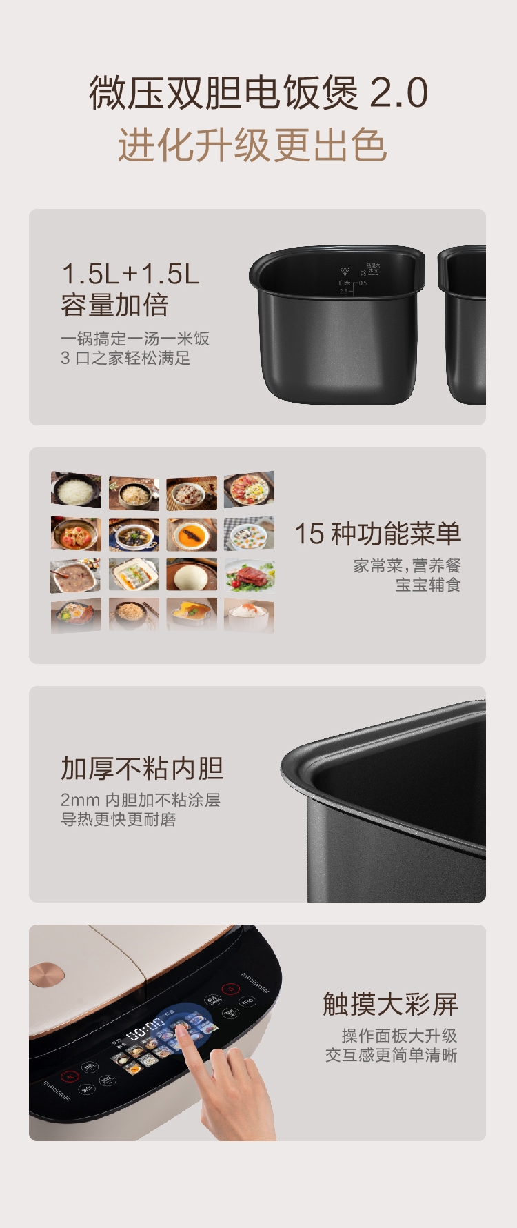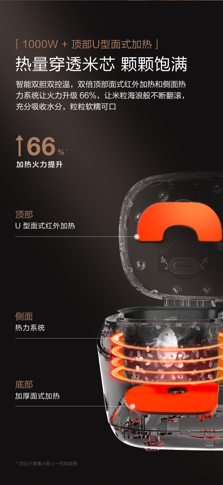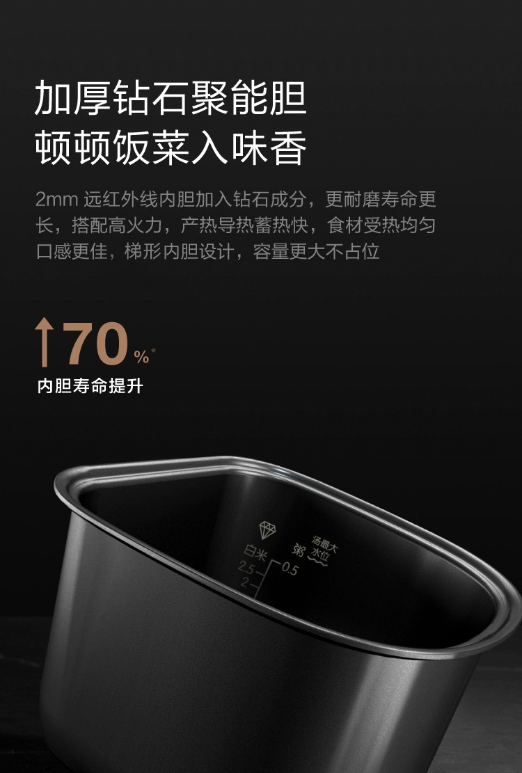 智能双控焖煮;齐享饭香汤浓;加厚钻石聚能胆 顿顿饭菜入味香