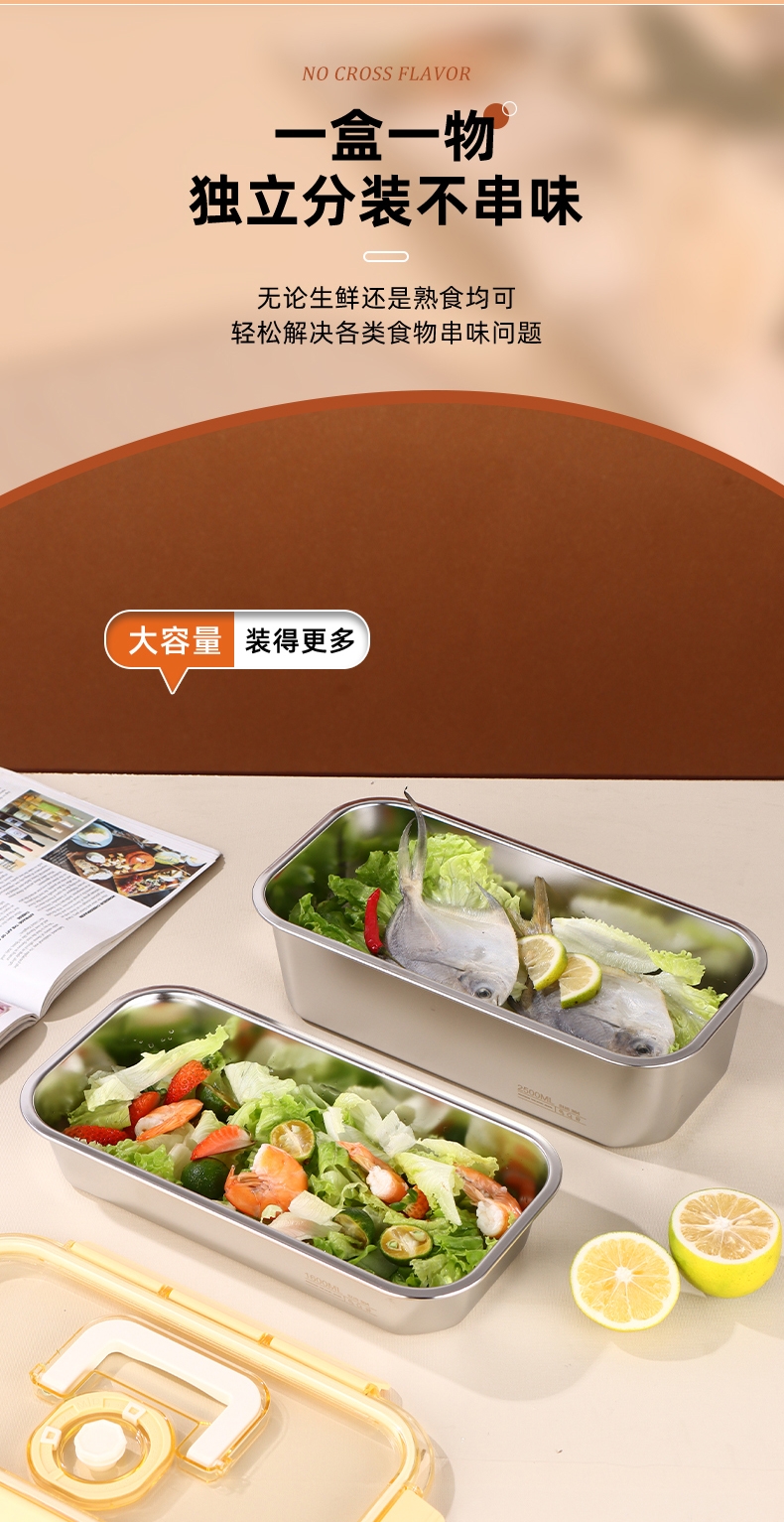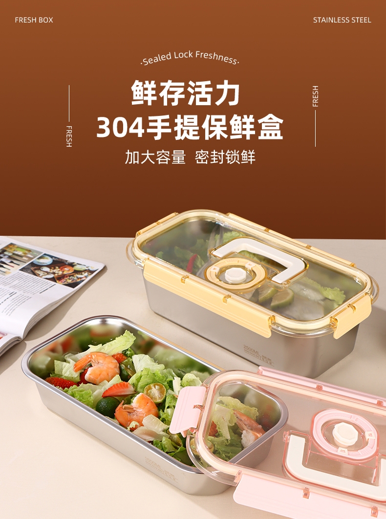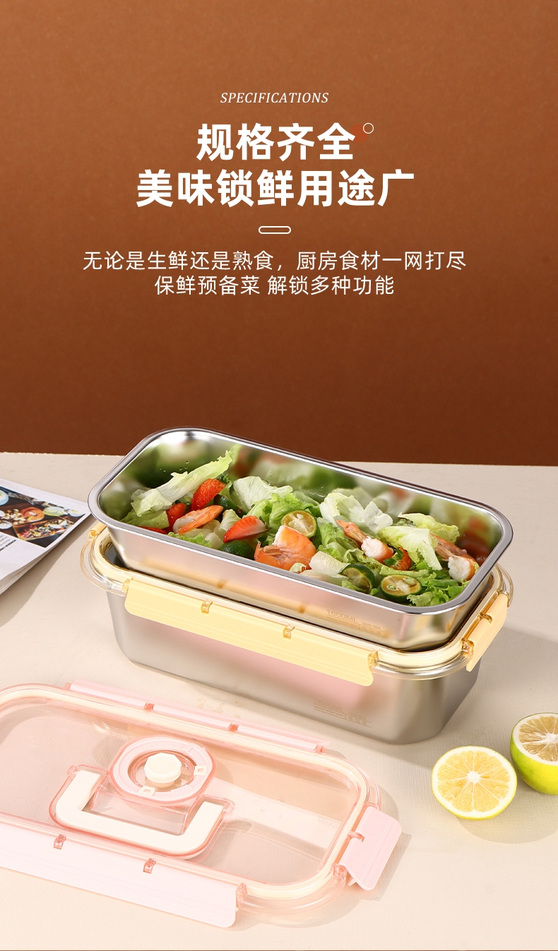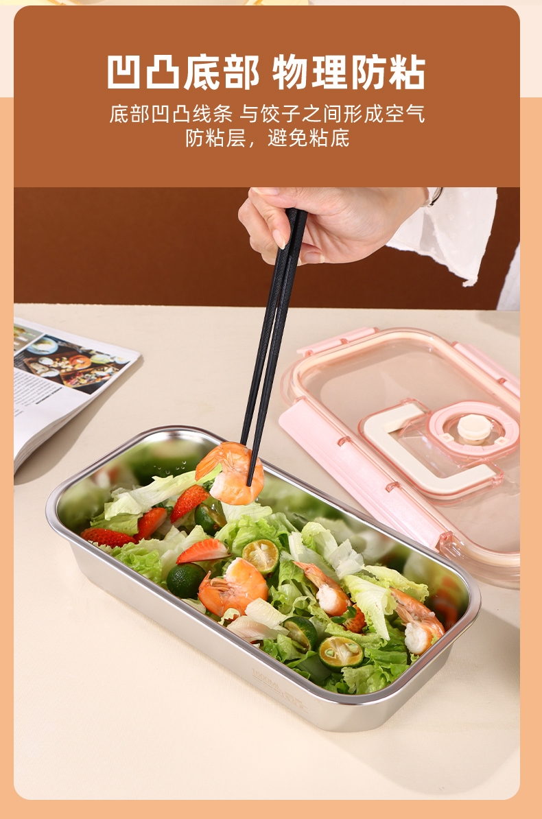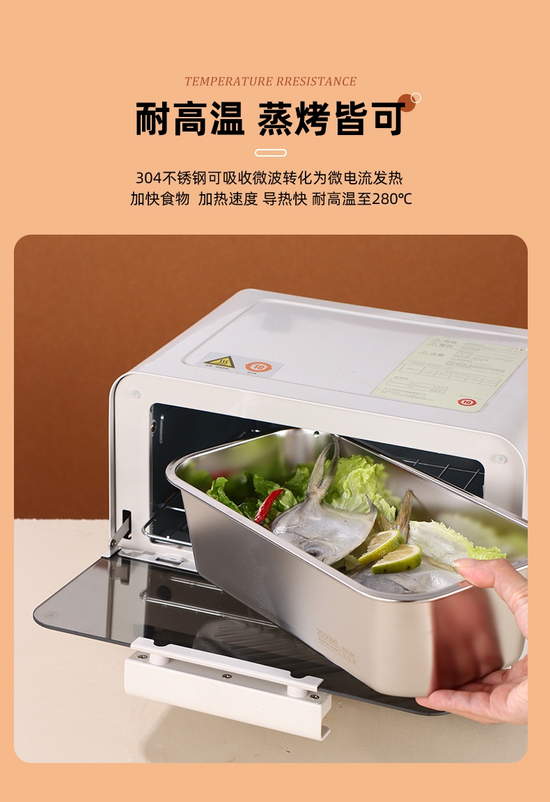 采用食品级SUS304钢+PC食品级材;食品级安全,新鲜看得见;可光波烤箱 +保鲜