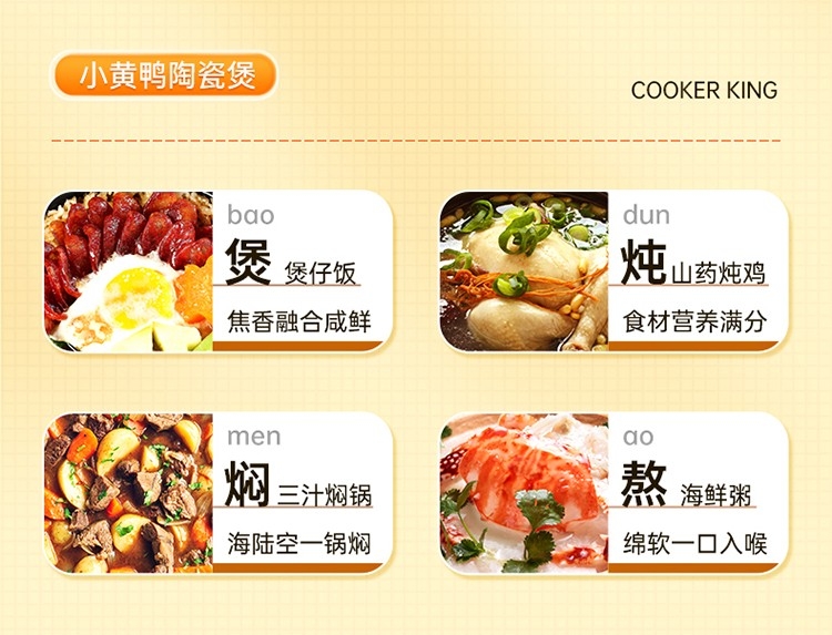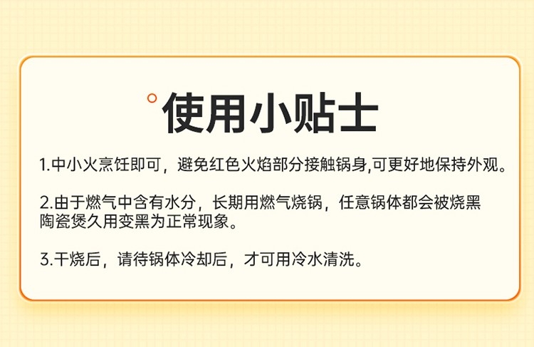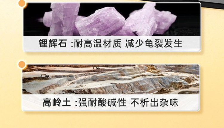 精选双矿石 坚固耐用;烧裂焕新 不易脱色;煲炖焖熬