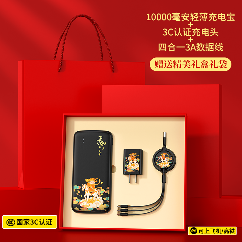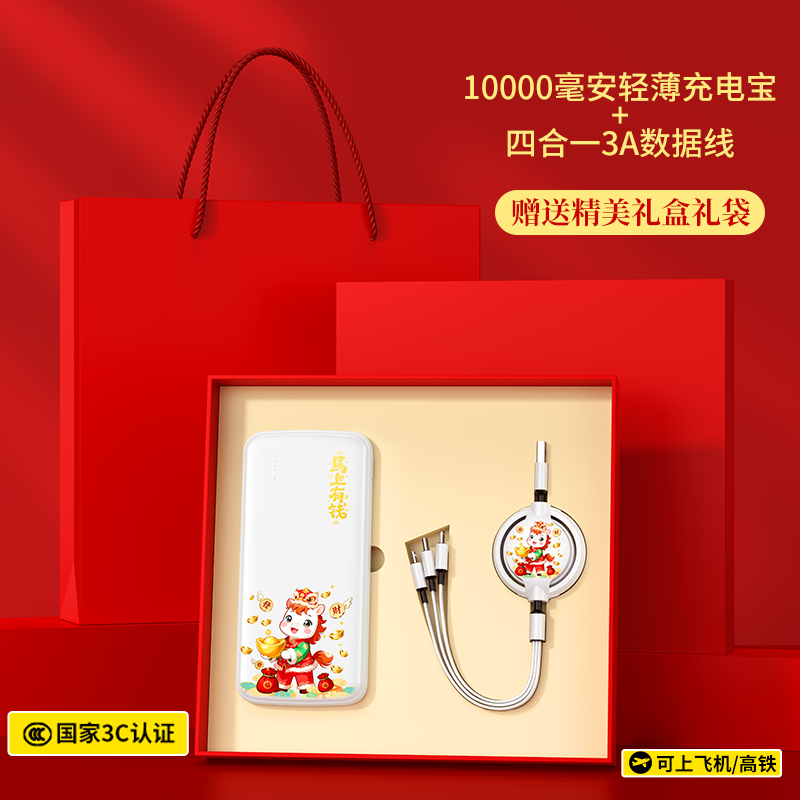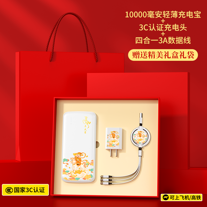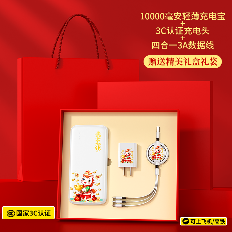 配置清单:1000毫安轻薄充电宝*1,3C认证充电头,四合一3A数据线*1,包装礼盒*1,礼品袋*1