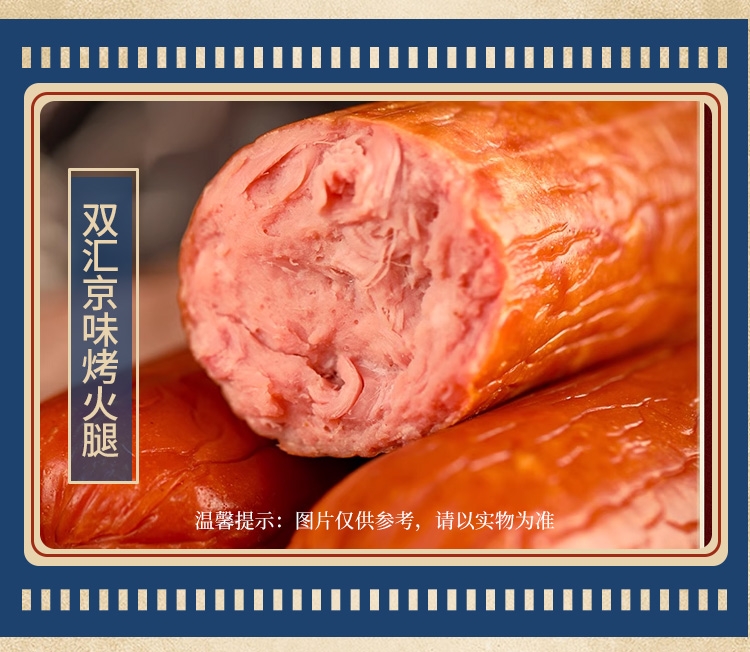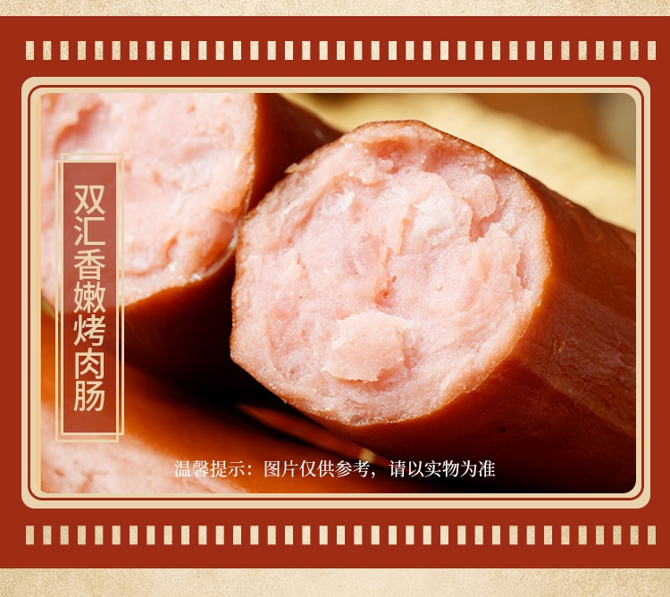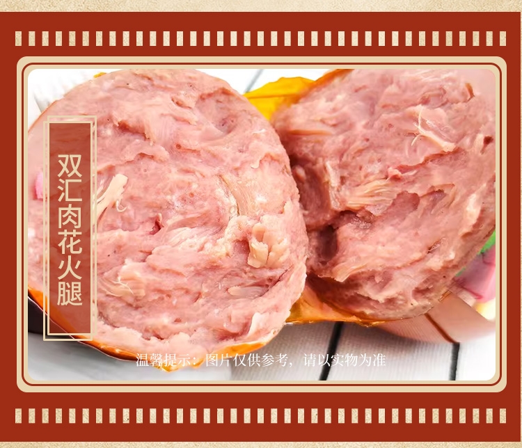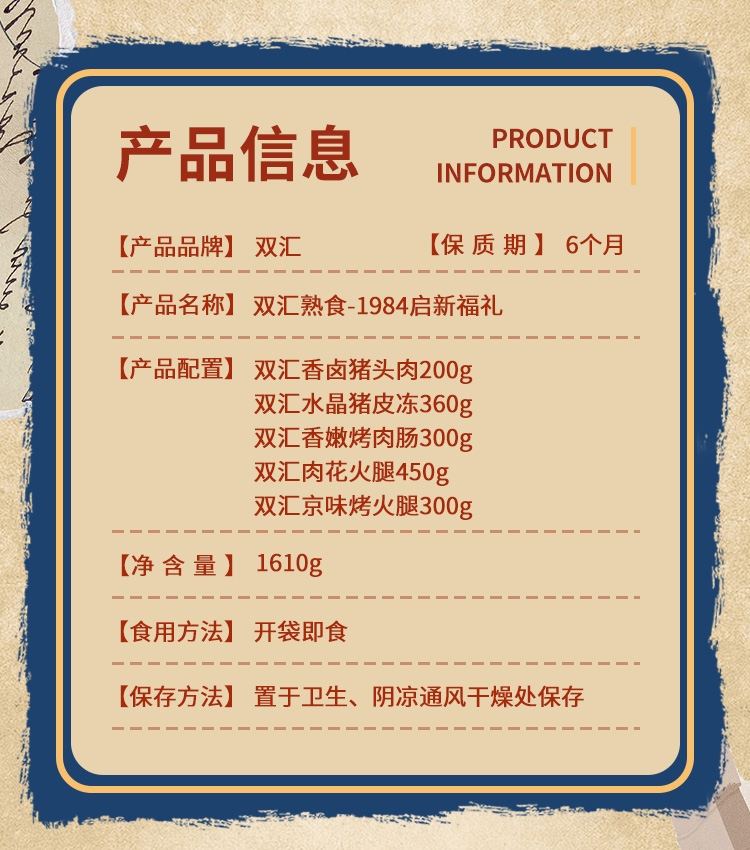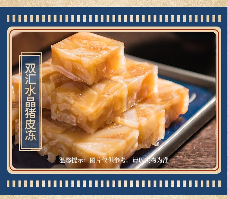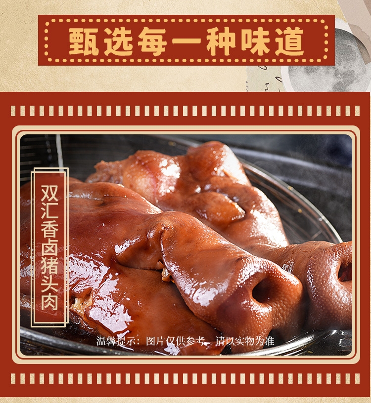 内配:双汇香卤猪头肉200g 双汇水晶猪皮冻360g 双汇香嫩烤肉肠300g 双汇肉花火腿450g 双汇京味烤火腿300g
