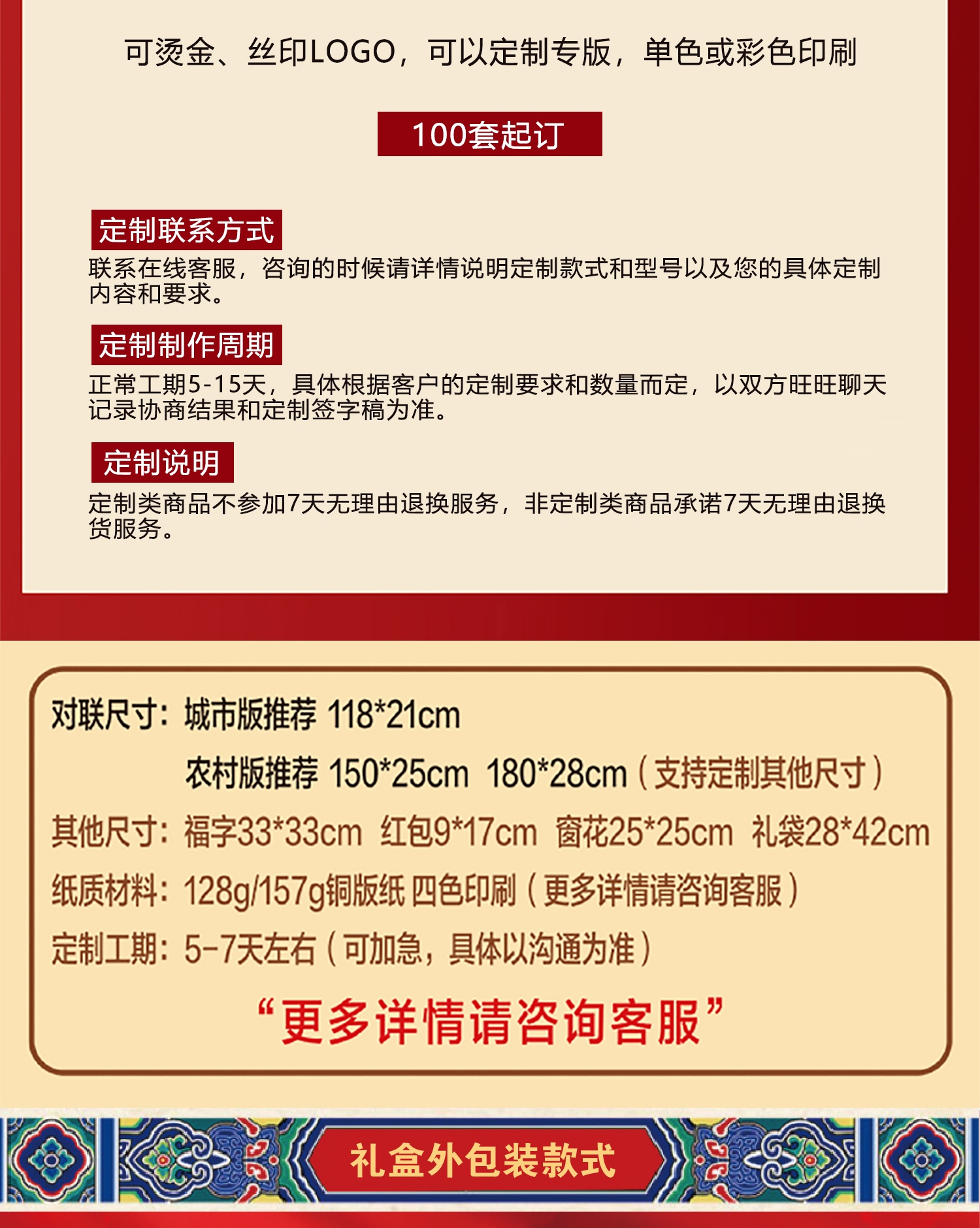 配置清单:对联*2,窗花*2,红包*5,横批*1,礼盒*1