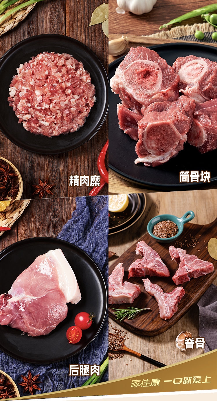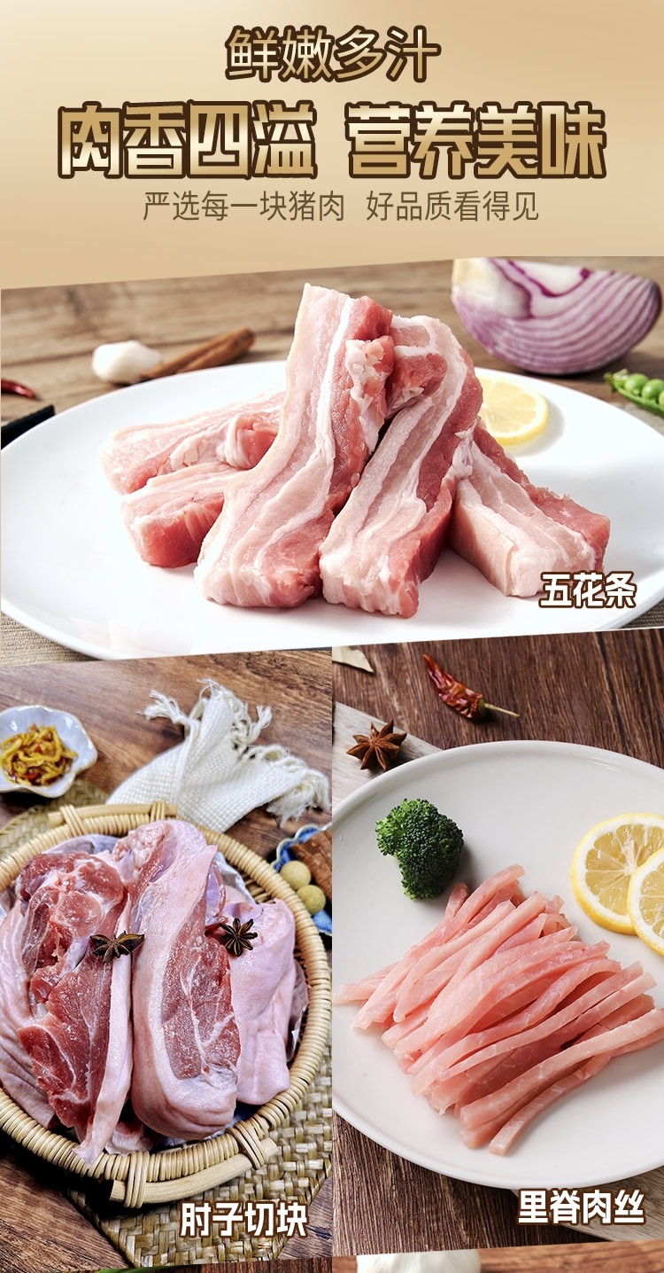 配置清单:亚麻籽猪冻筒骨块700g 亚麻籽猪冻肘子切块800g 亚麻籽猪冻精选五花条450g 亚麻籽猪冻里脊肉丝240g 亚麻籽猪冻脊骨380g 亚麻籽猪冻精肉糜320g 亚麻籽猪冻后腿肉280g
