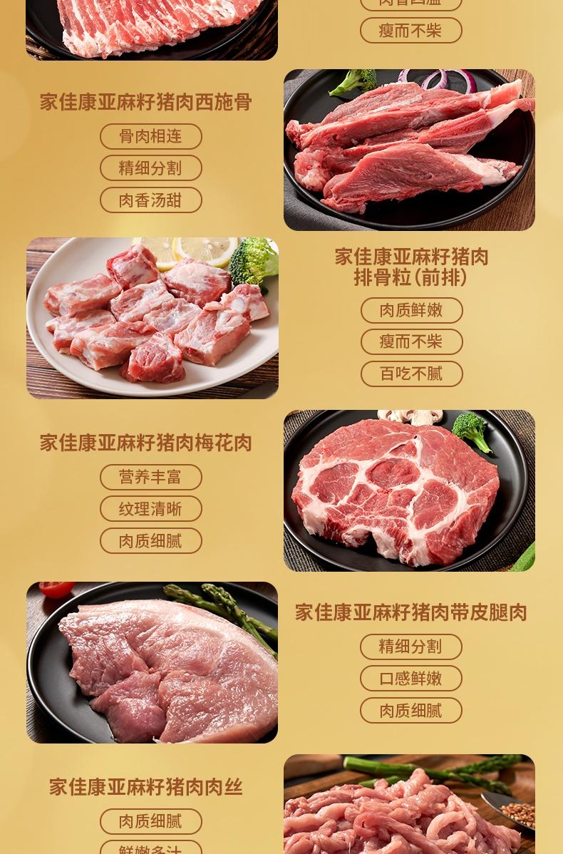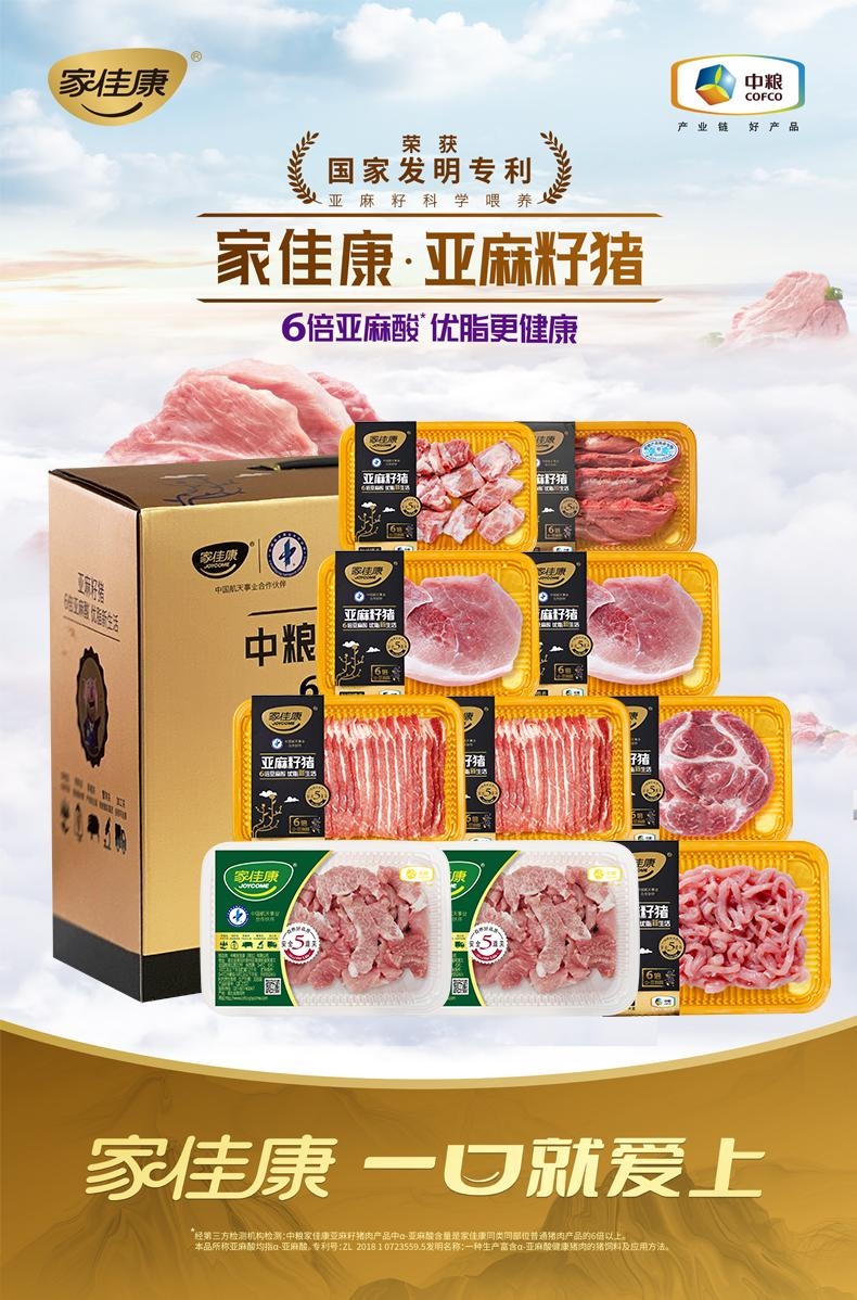 配置清单:中粮家佳康亚麻籽猪肉小排粒250g 中粮家佳康亚麻籽猪肉西施骨400g 中粮家佳康亚麻籽猪梅花肉400g 中粮家佳康亚麻籽猪肉日式涮烤腩肉片180g*2 中粮家佳康日式松板肉200g*2 中粮家佳康亚麻籽猪肉带皮腿肉280g*2 中粮家佳康亚麻籽猪肉肉丝200g