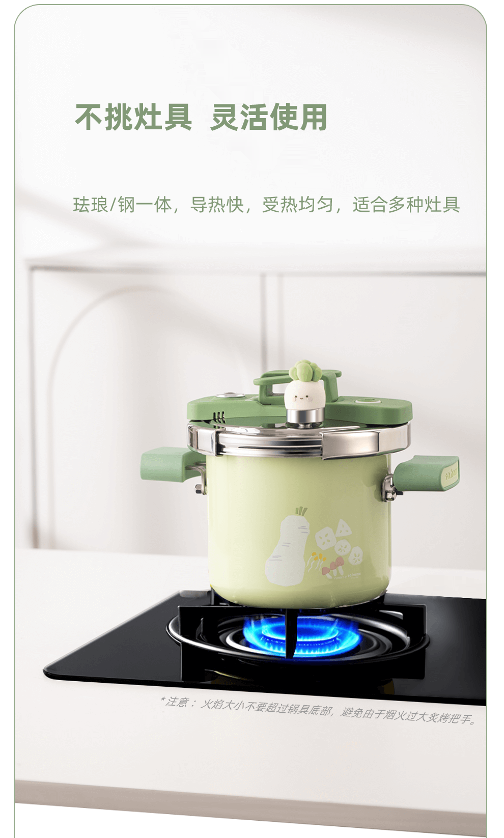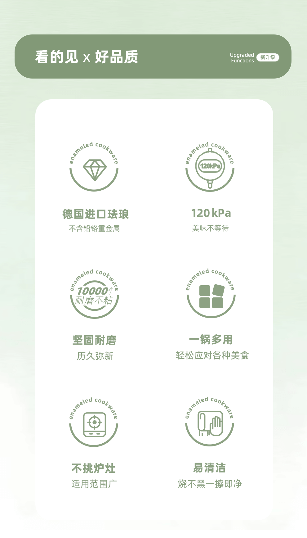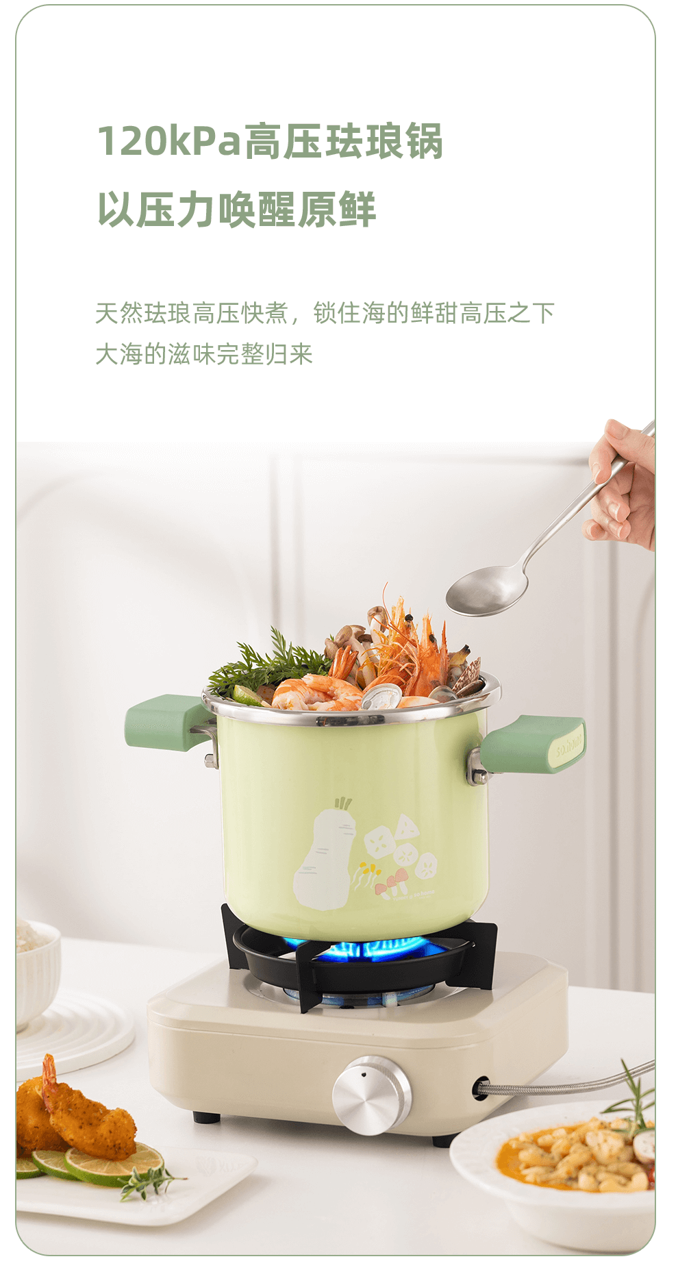 德国进口珐琅,品质卓越;120KPA的高压设计;专利旋转开并,安全便捷