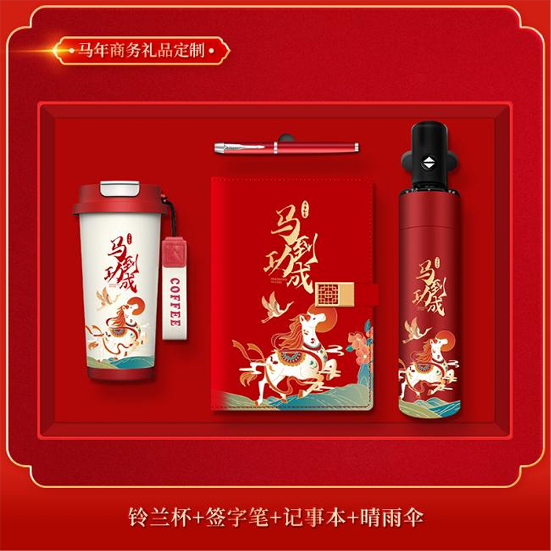 四件套配置:500ml铃兰杯+A5平装本+金属笔+雨伞