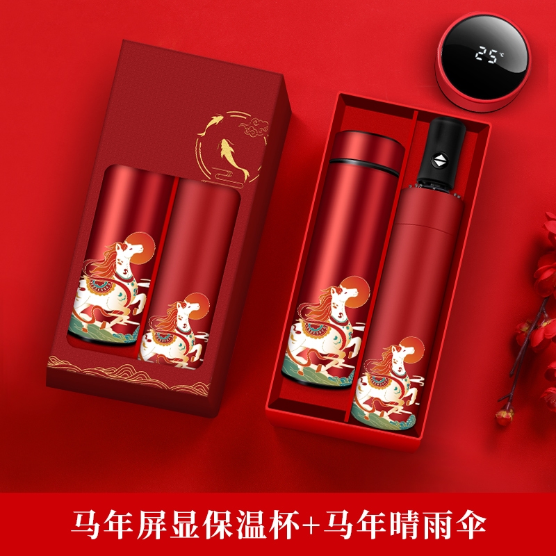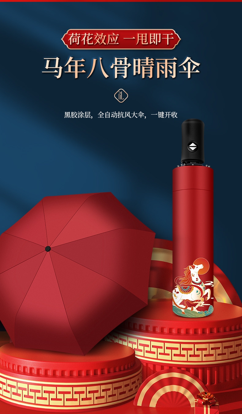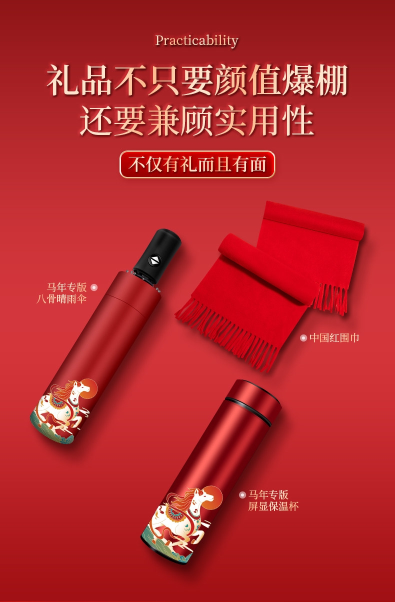 黑胶涂层,全自动抗风大伞,一键开收;荷花效应 一甩即干;马年屏显保温杯,实时显示 避免烫伤