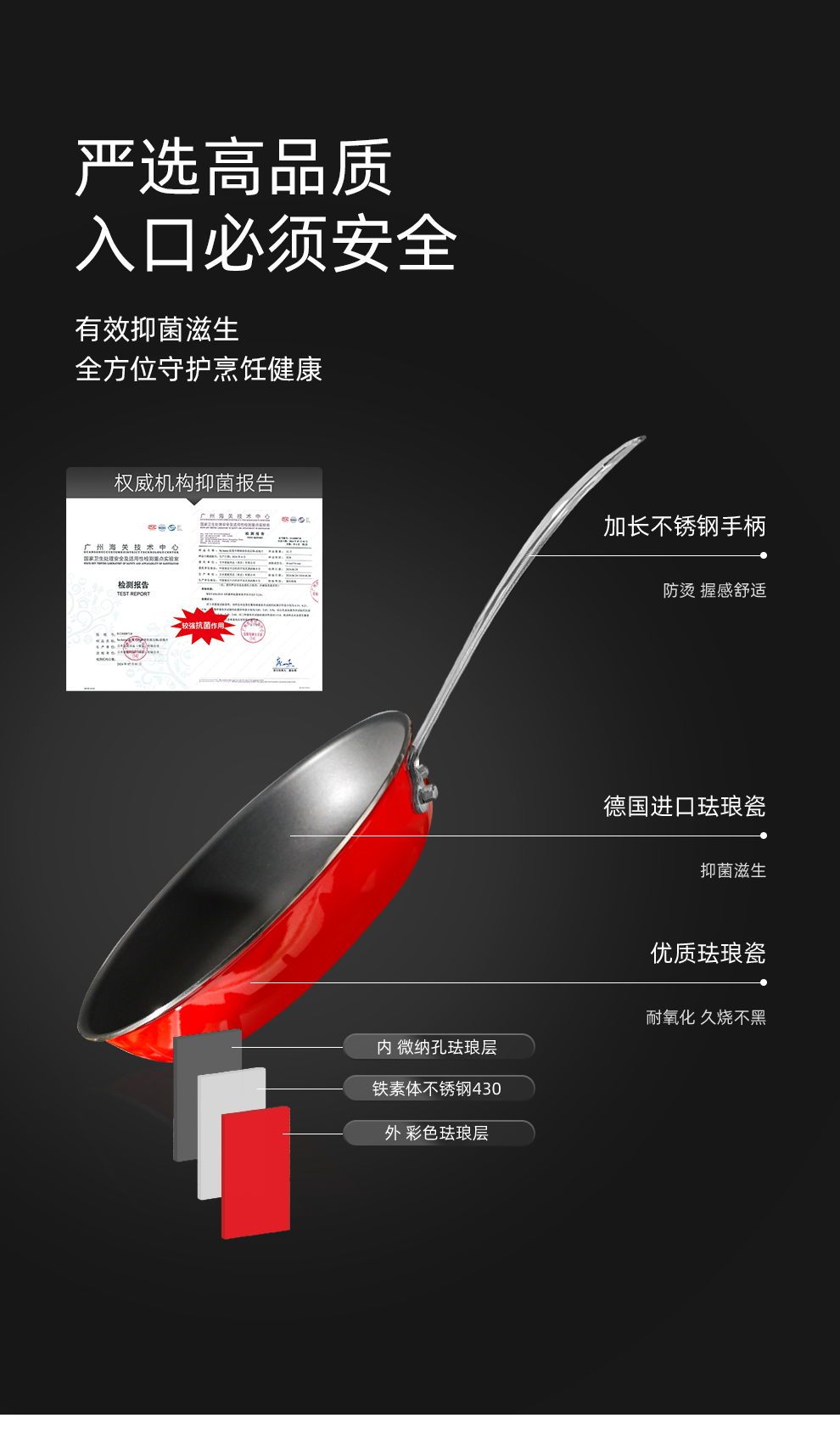 材质:锅身:珐琅、430系列不锈钢;把手:201不锈钢
