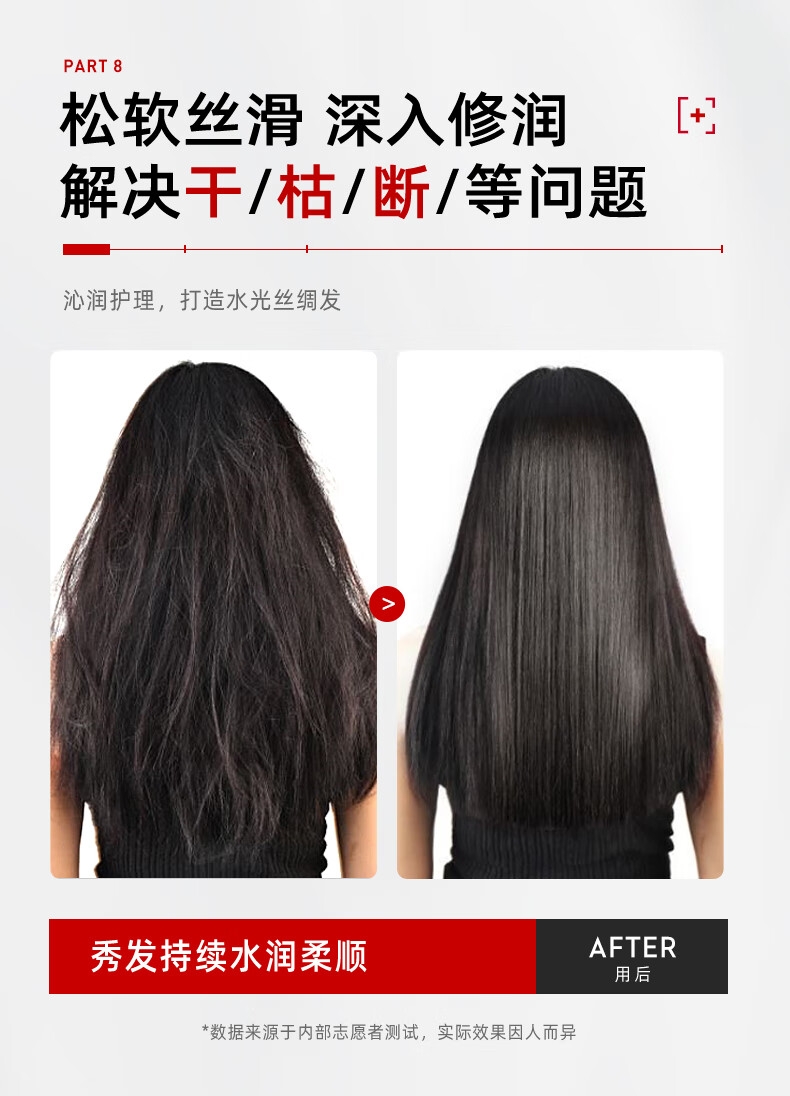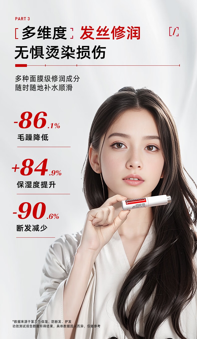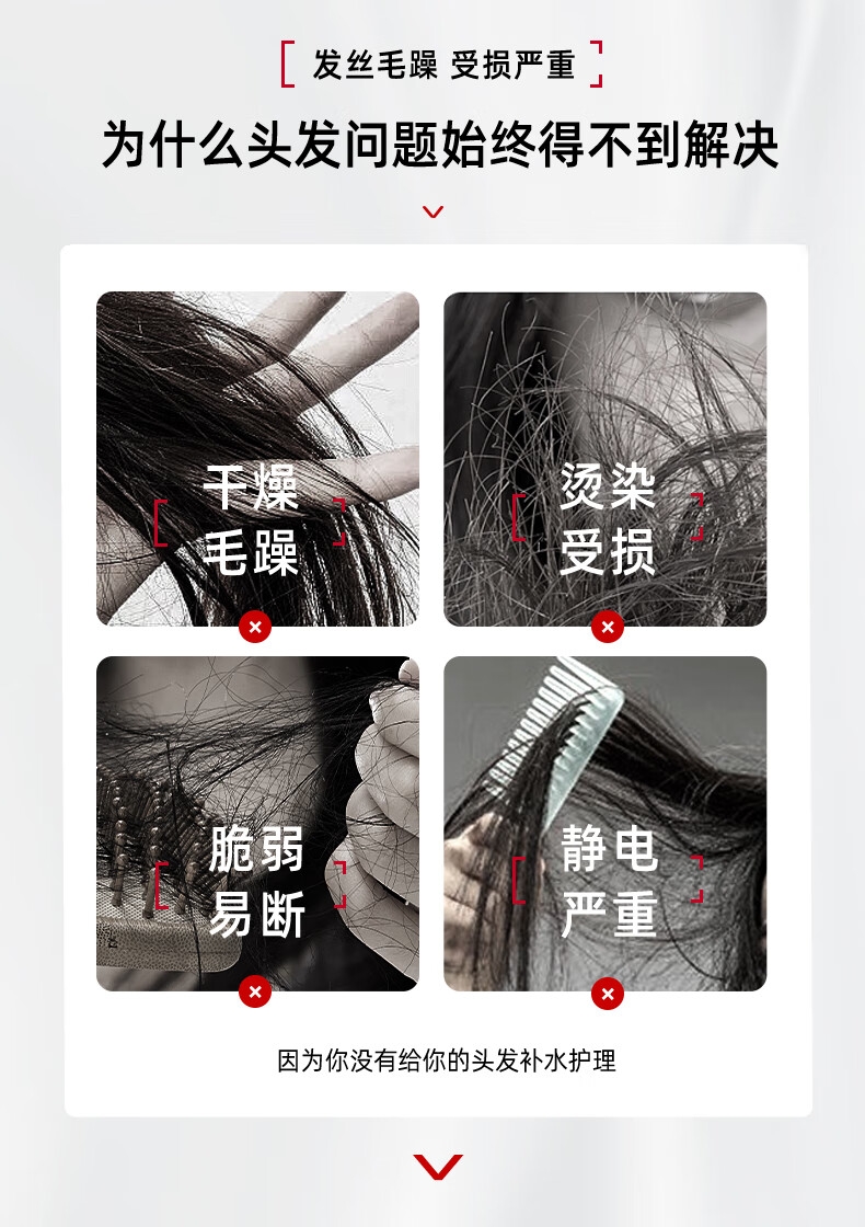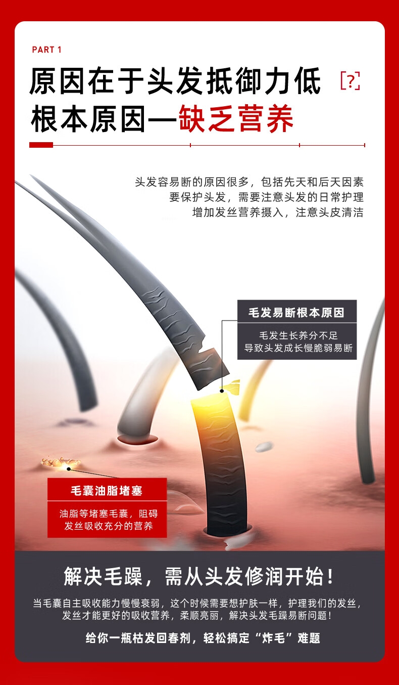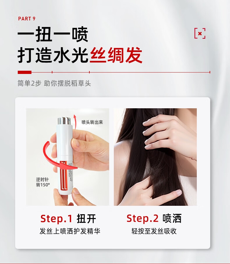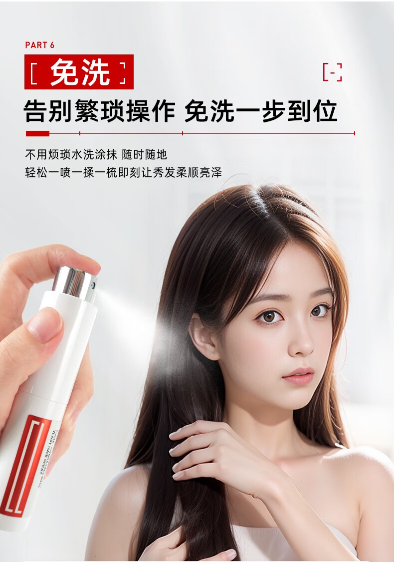 水润柔顺 丝滑亮泽秀发,头发的“保湿器’;修润养护 多重精华渗入发丝,润护发芯防断发;免冲免洗 懒人常备护发应急