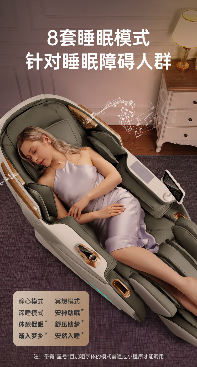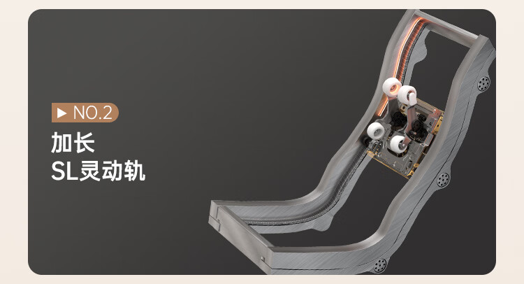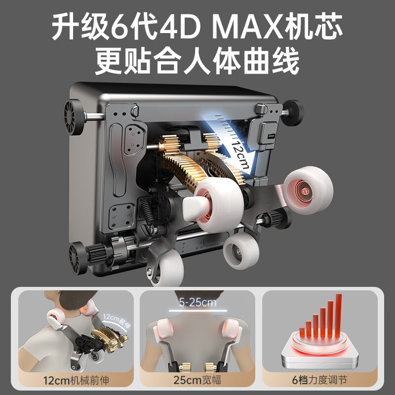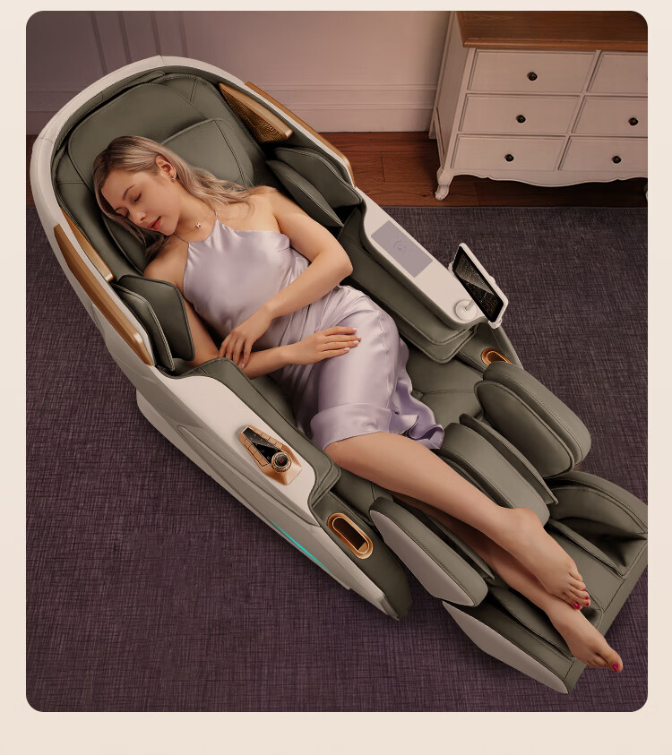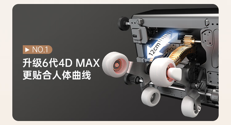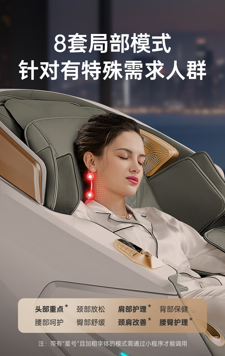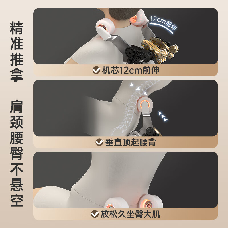 4D齿轮机芯:前推12cm,6档力度可调;超长SL轨道:从颈肩延伸至腰臀,全身按摩无死角;24套专属按摩程序,植入自主研发DAR睡眠管理系统;加高小腿气囊揉搓.小腿肚滚轮刮痧.足底3段式滚轮