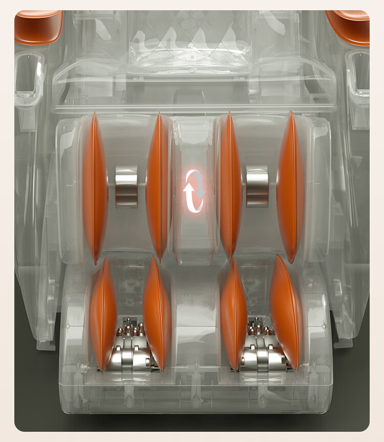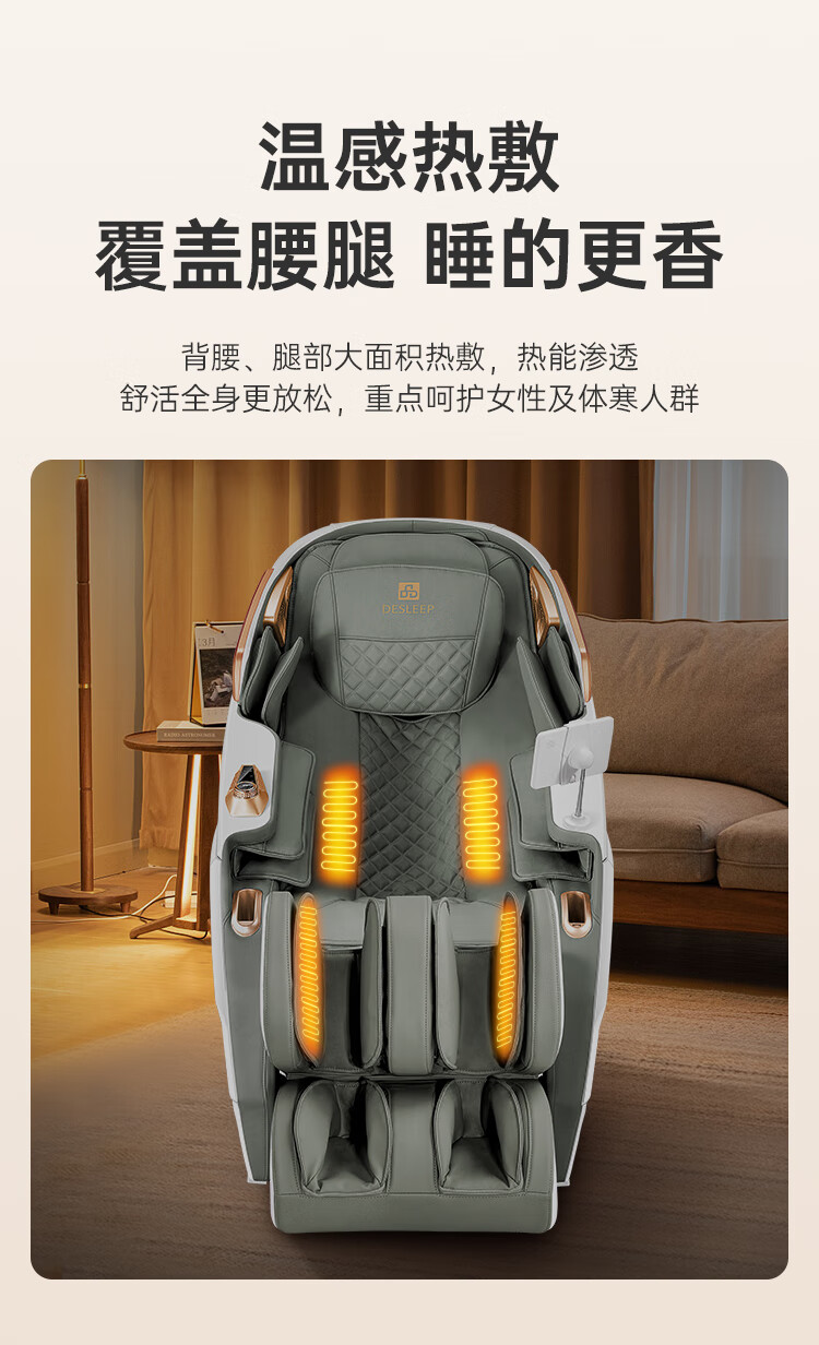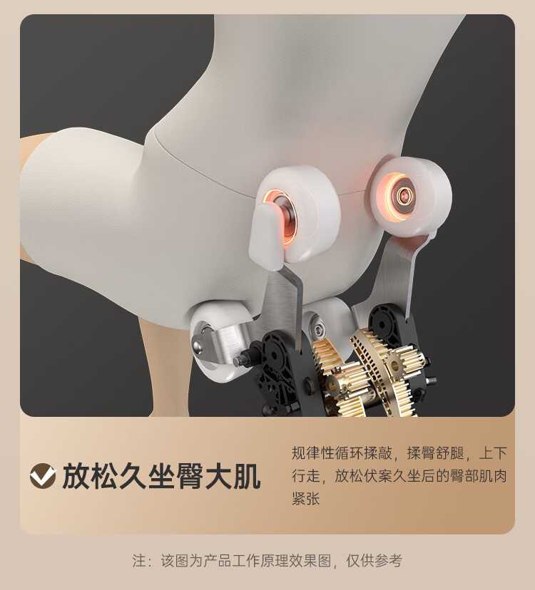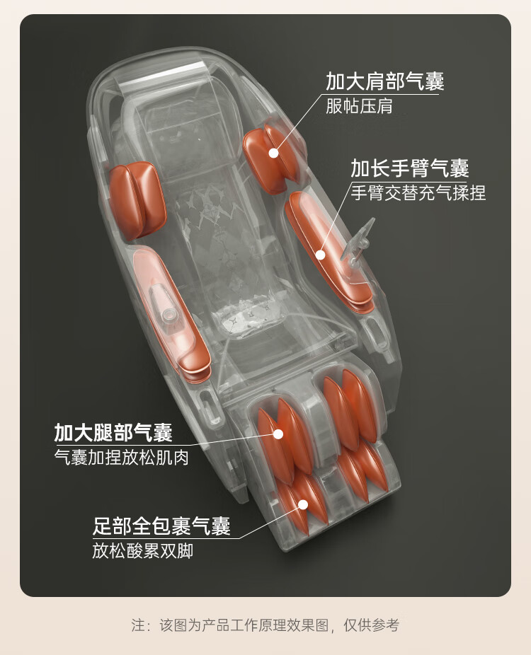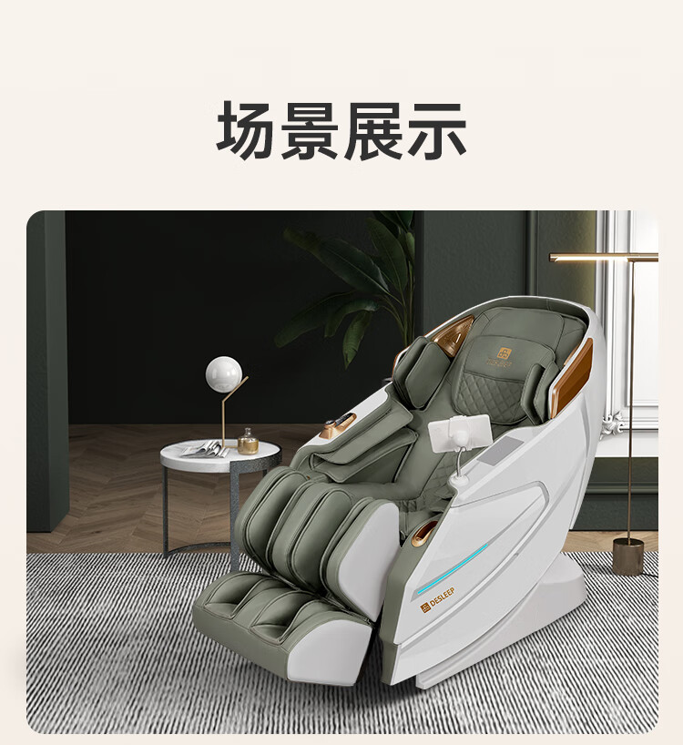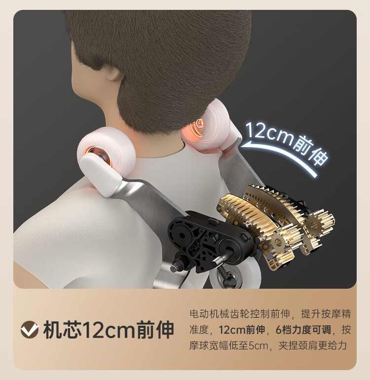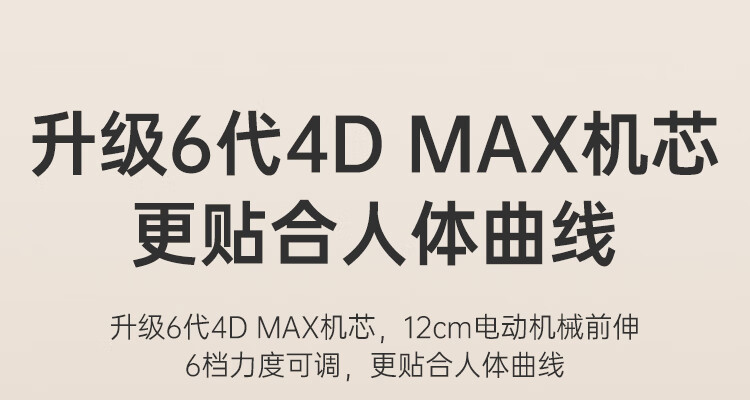 4D齿轮机芯:前推12cm,6档力度可调;超长SL轨道:从颈肩延伸至腰臀,全身按摩无死角;24套专属按摩程序,植入自主研发DAR睡眠管理系统;加高小腿气囊揉搓.小腿肚滚轮刮痧.足底3段式滚轮