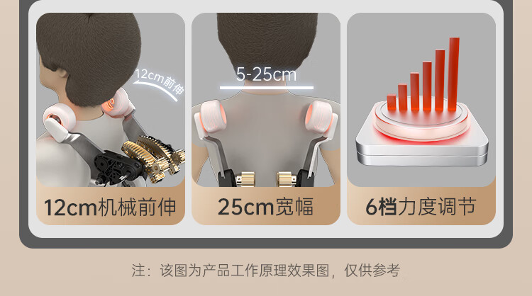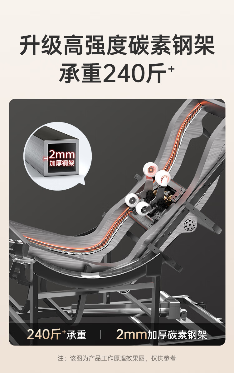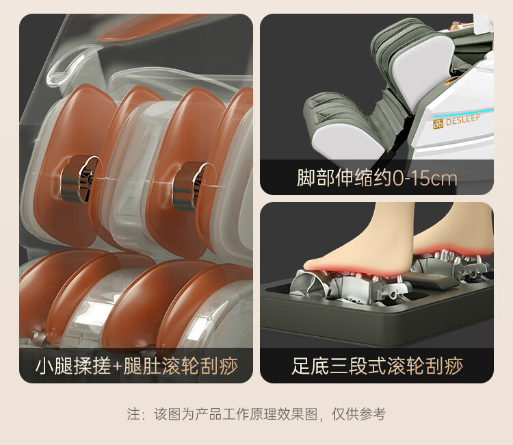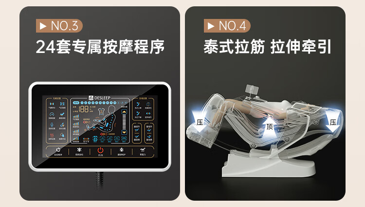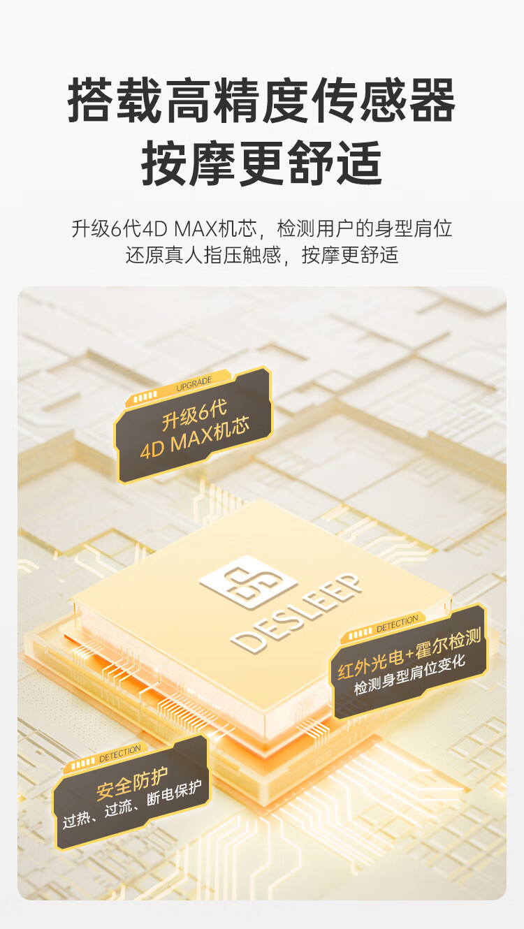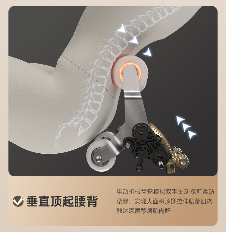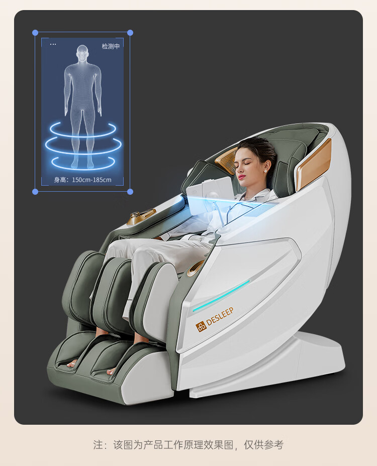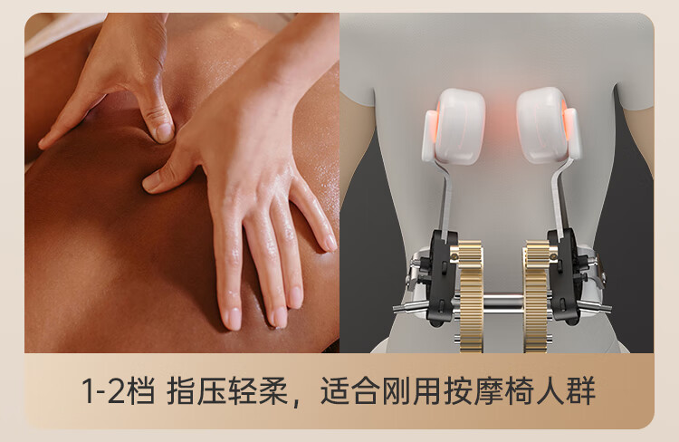 4D齿轮机芯:前推12cm,6档力度可调;超长SL轨道:从颈肩延伸至腰臀,全身按摩无死角;24套专属按摩程序,植入自主研发DAR睡眠管理系统;加高小腿气囊揉搓.小腿肚滚轮刮痧.足底3段式滚轮