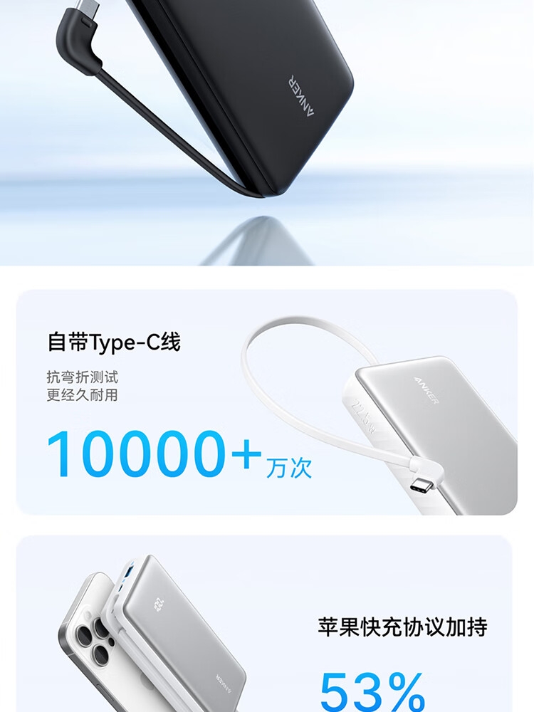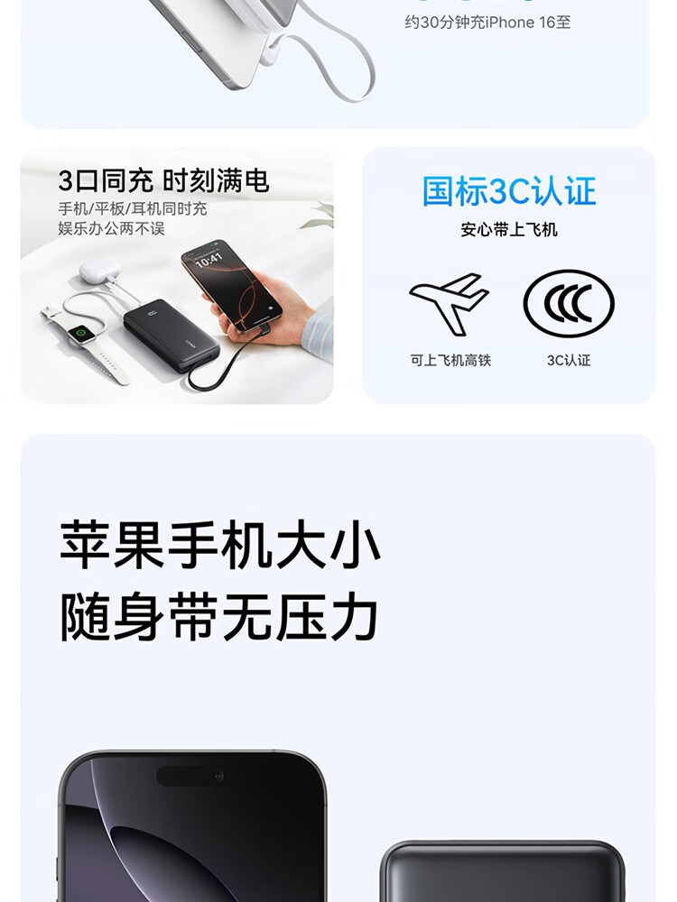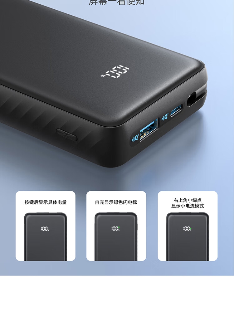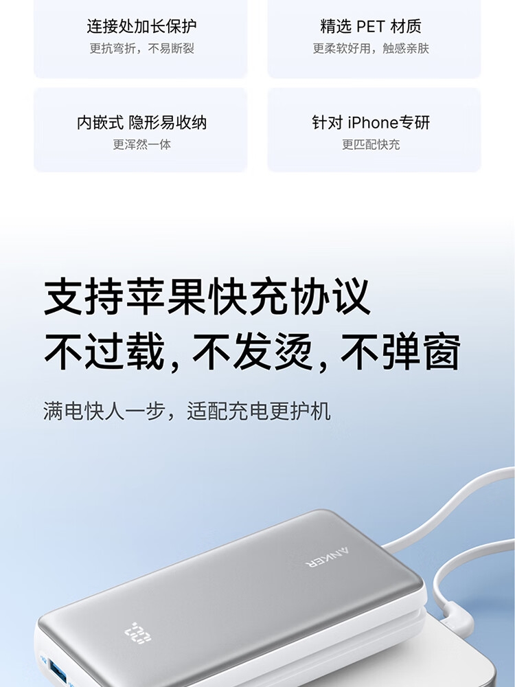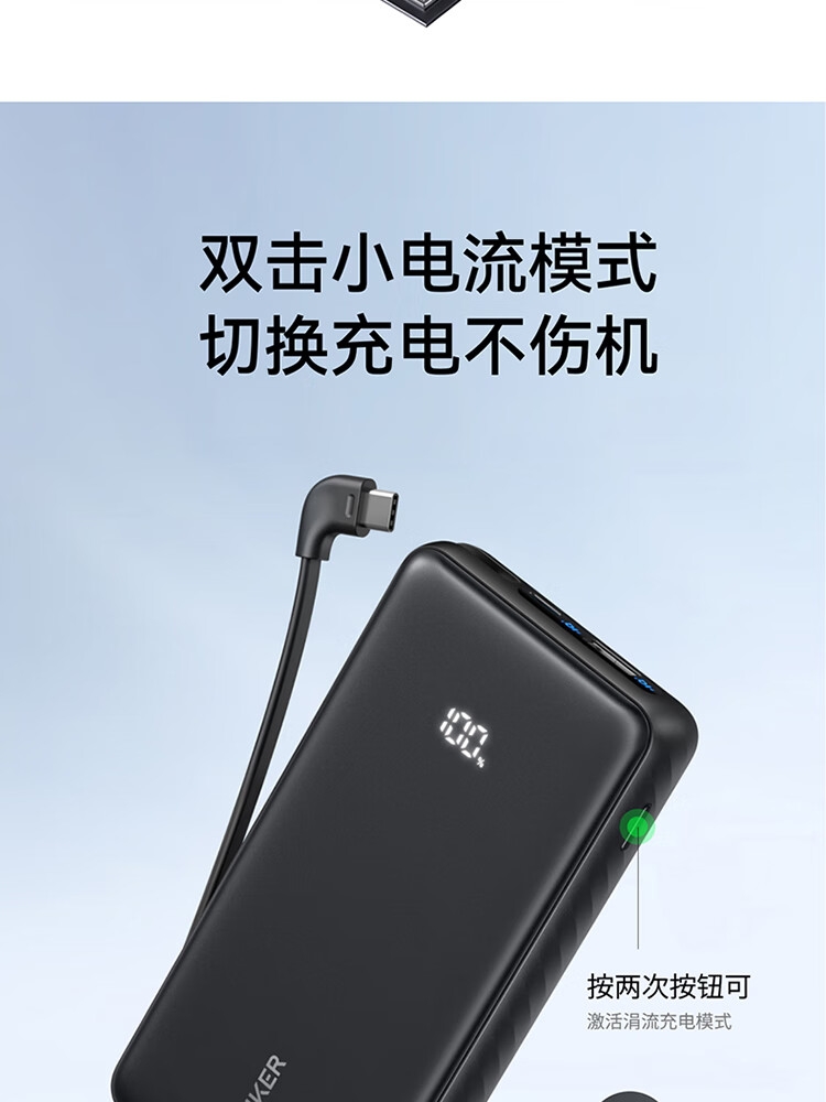 自带Type-c内嵌线,出门无需带线,方便更护线;支持苹果快充协议,不过载,不发烫,不弹窗;双击小电流模式,切换充电不伤机;智能温控技术,实时监测,主动降温,快充更安心