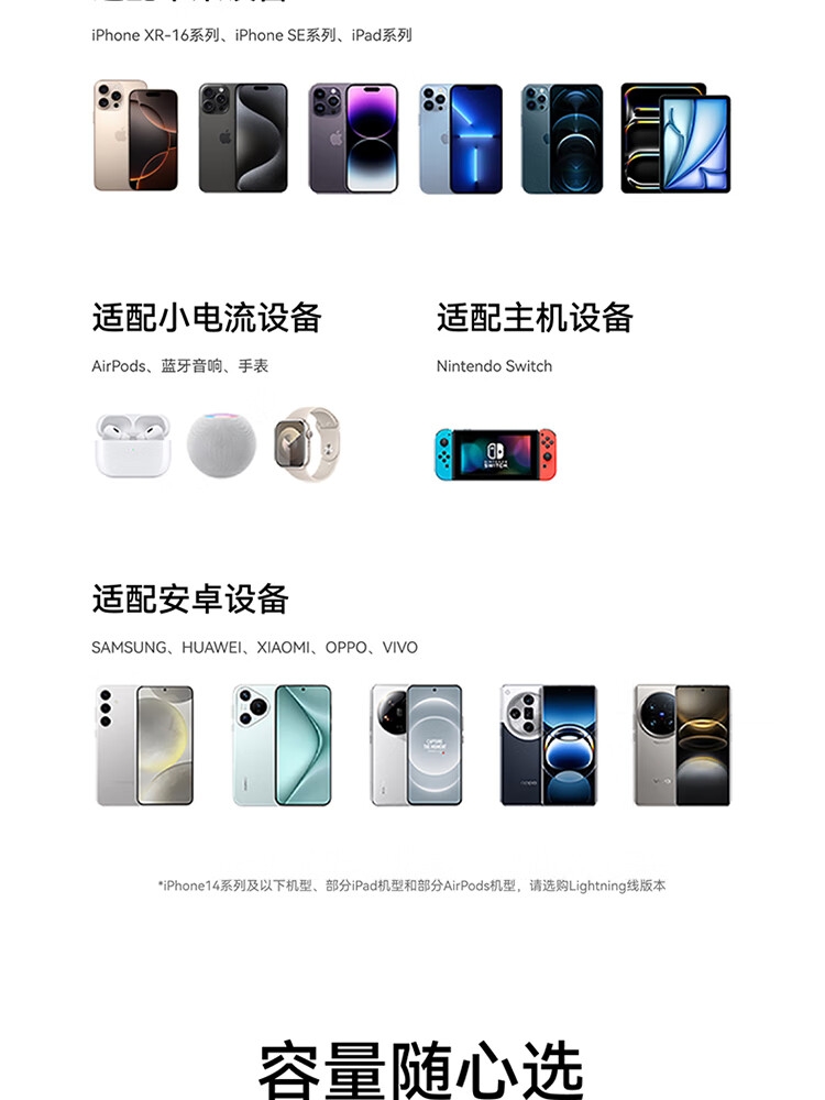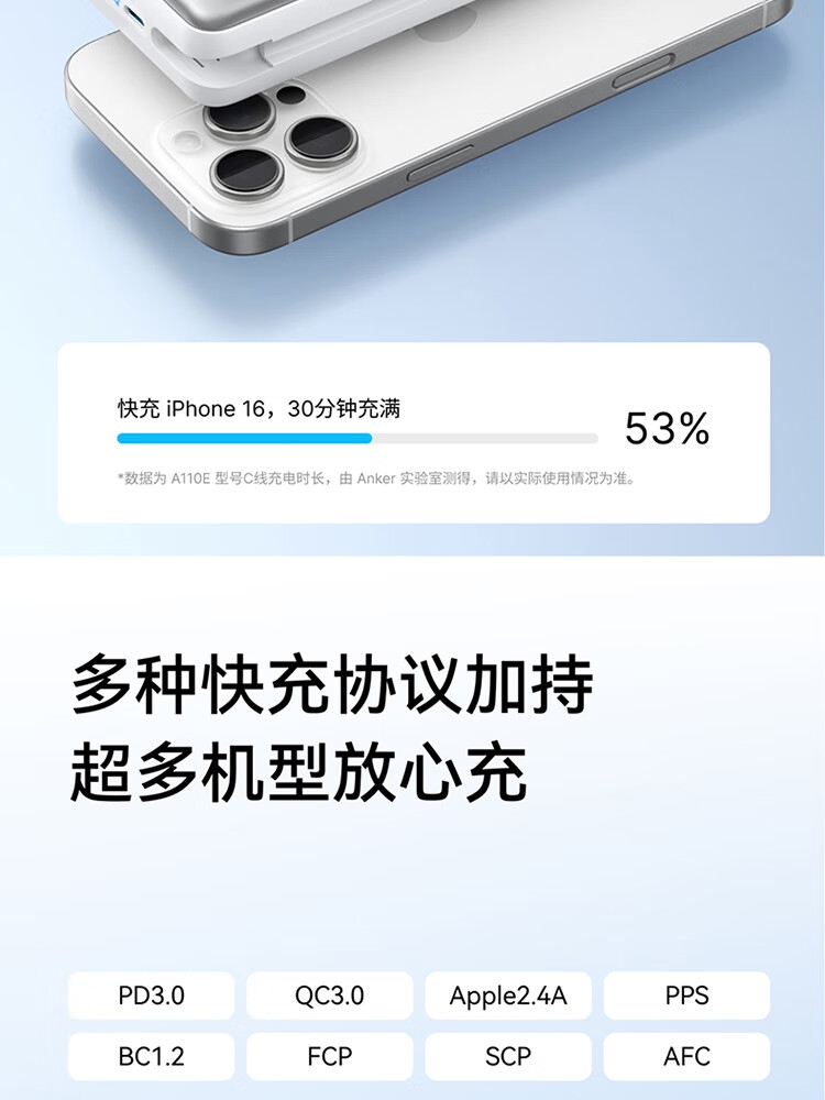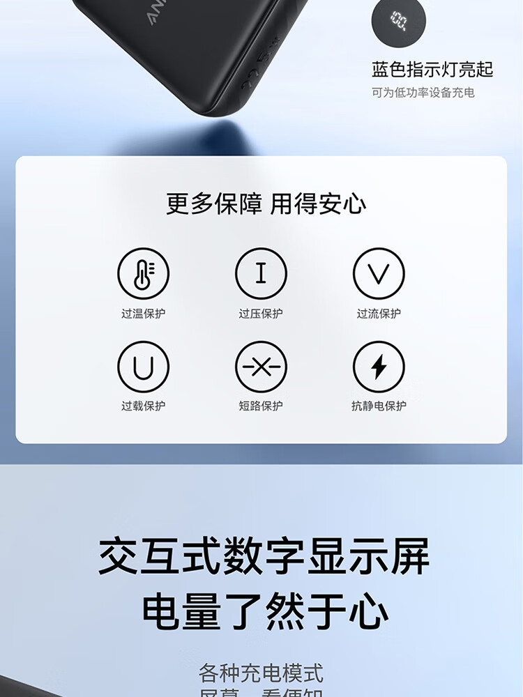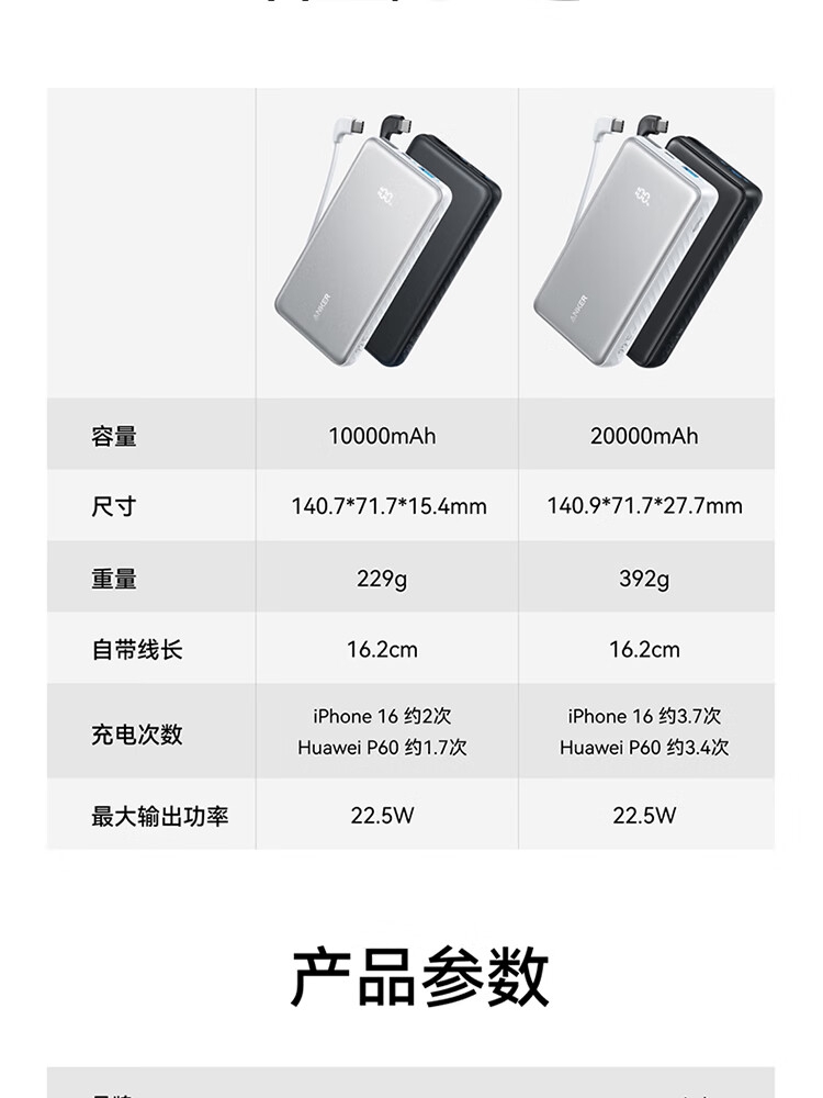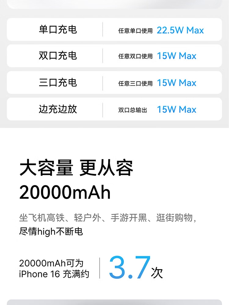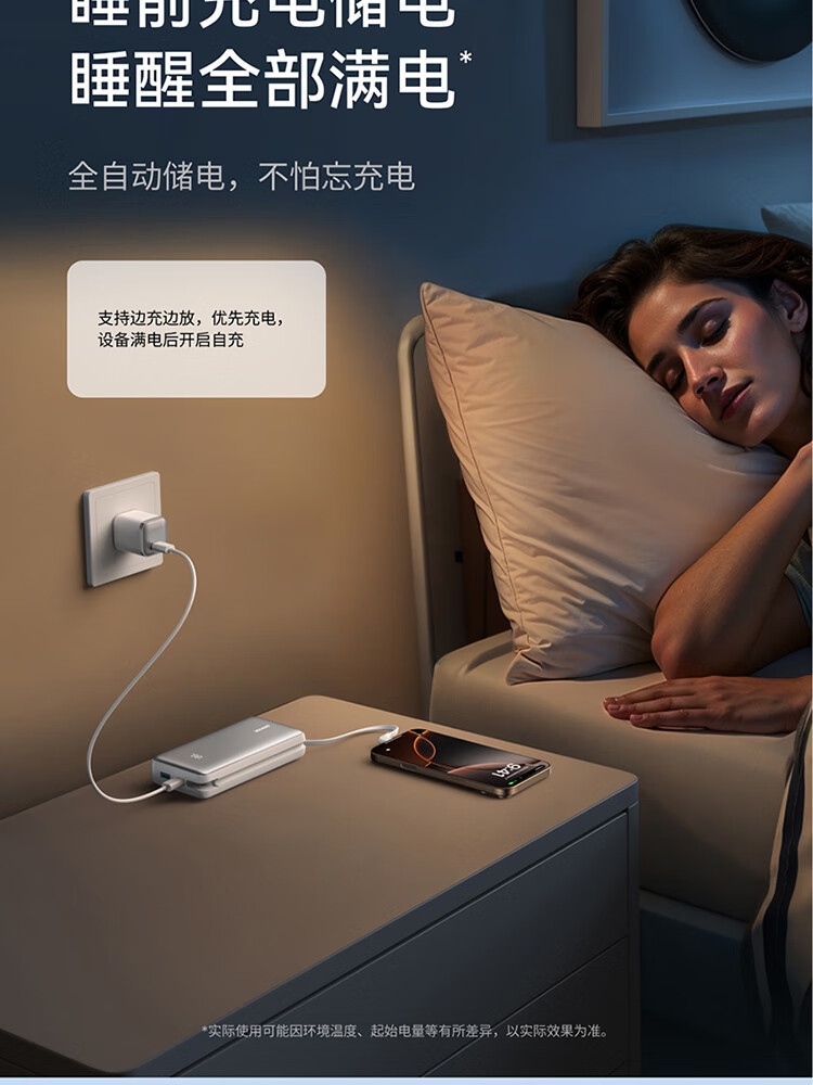 自带Type-c内嵌线,出门无需带线,方便更护线;支持苹果快充协议,不过载,不发烫,不弹窗;双击小电流模式,切换充电不伤机;智能温控技术,实时监测,主动降温,快充更安心