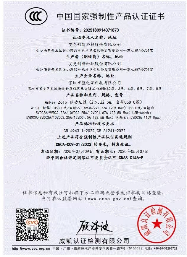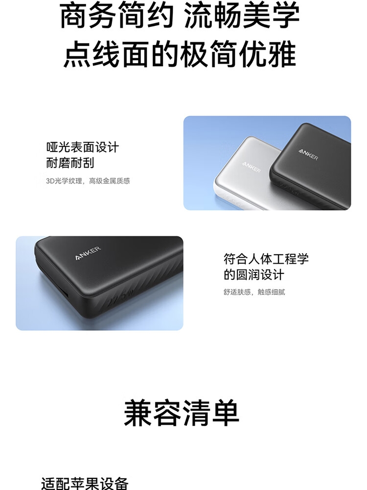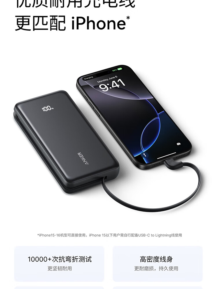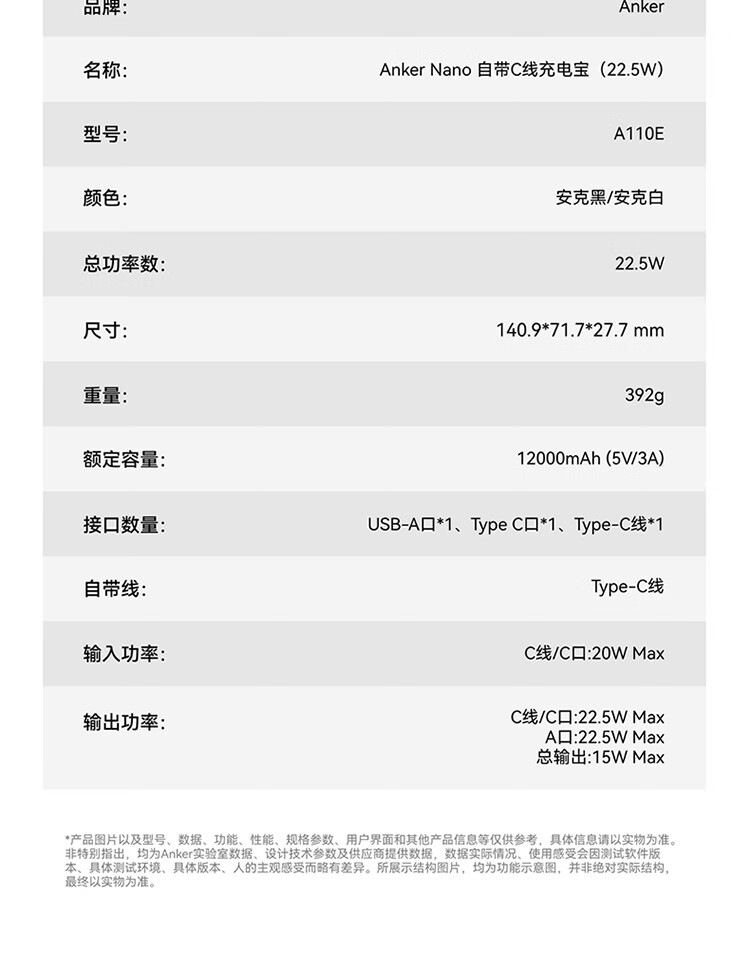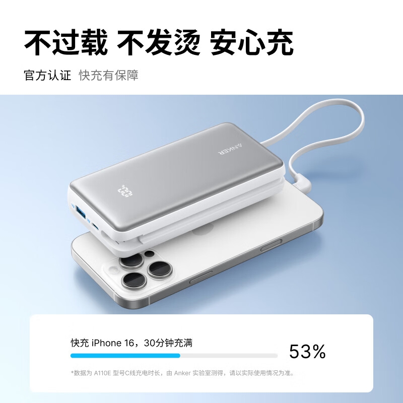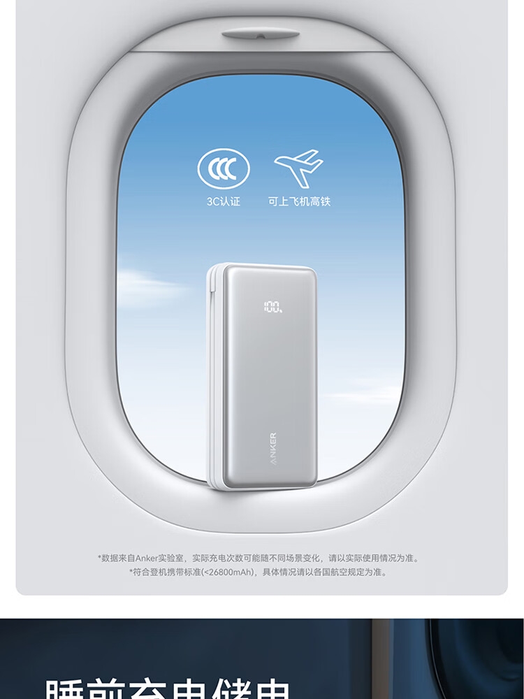 安克 2万毫安自带C线快充充电宝A110E