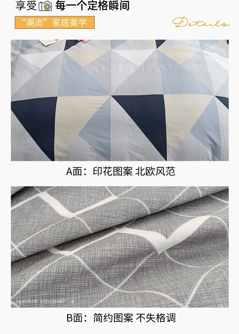 AB双版印花,清爽的印花设计,清新淡雅;天然棉花具有较好的染色效果;纤维强度高手感柔软透气性强,不易起球,对人体无刺激