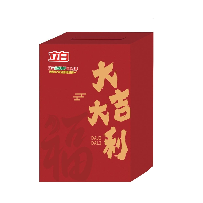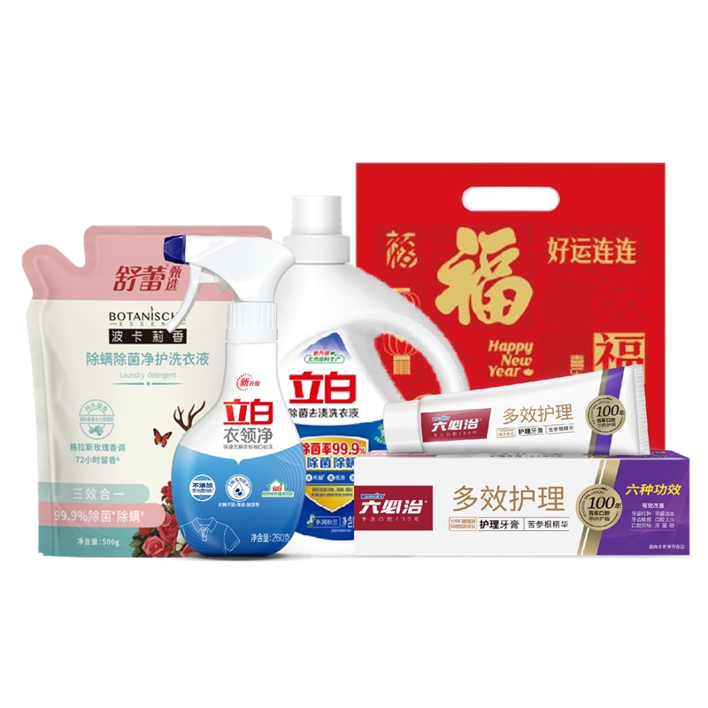 配置:立白除菌去渍洗衣液500g*1瓶 舒蕾甄选波卡莉香除螨除菌净护洗衣液-500g*1袋 立白衣领净260g*1瓶 六必治多效护理牙膏120g*1支 春联礼包*1份 对联:118x21CM --(1对)128g铜版纸 福字:33x33CM--(1张)128g铜版纸 红包:16.5x8.5CM--(5个)128g铜版纸 窗花:28x28CM一-(2张)6丝静电)