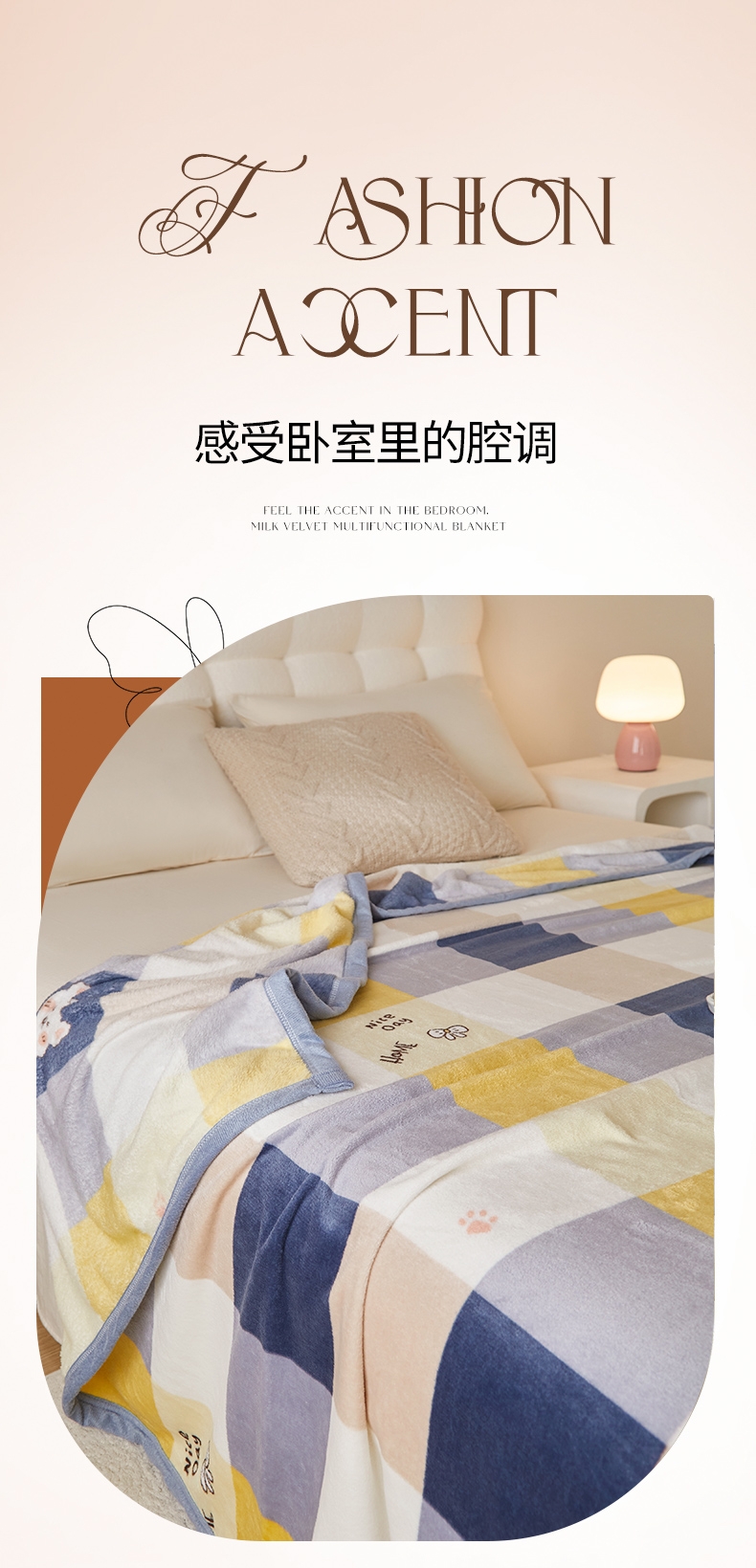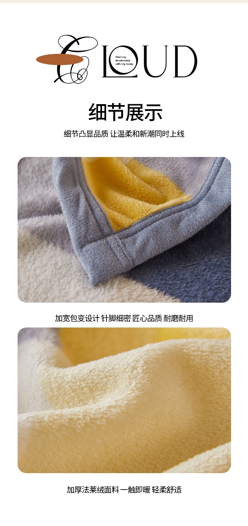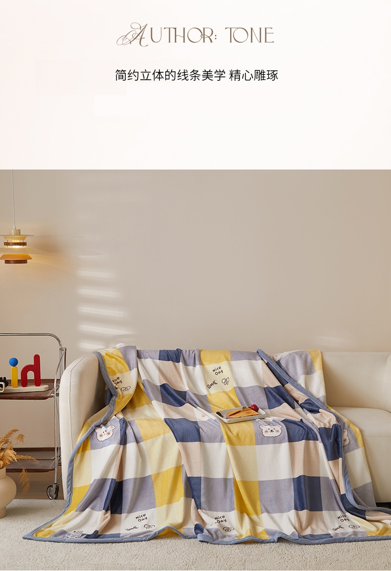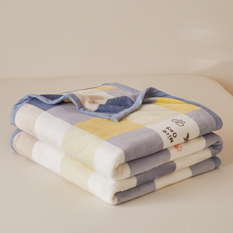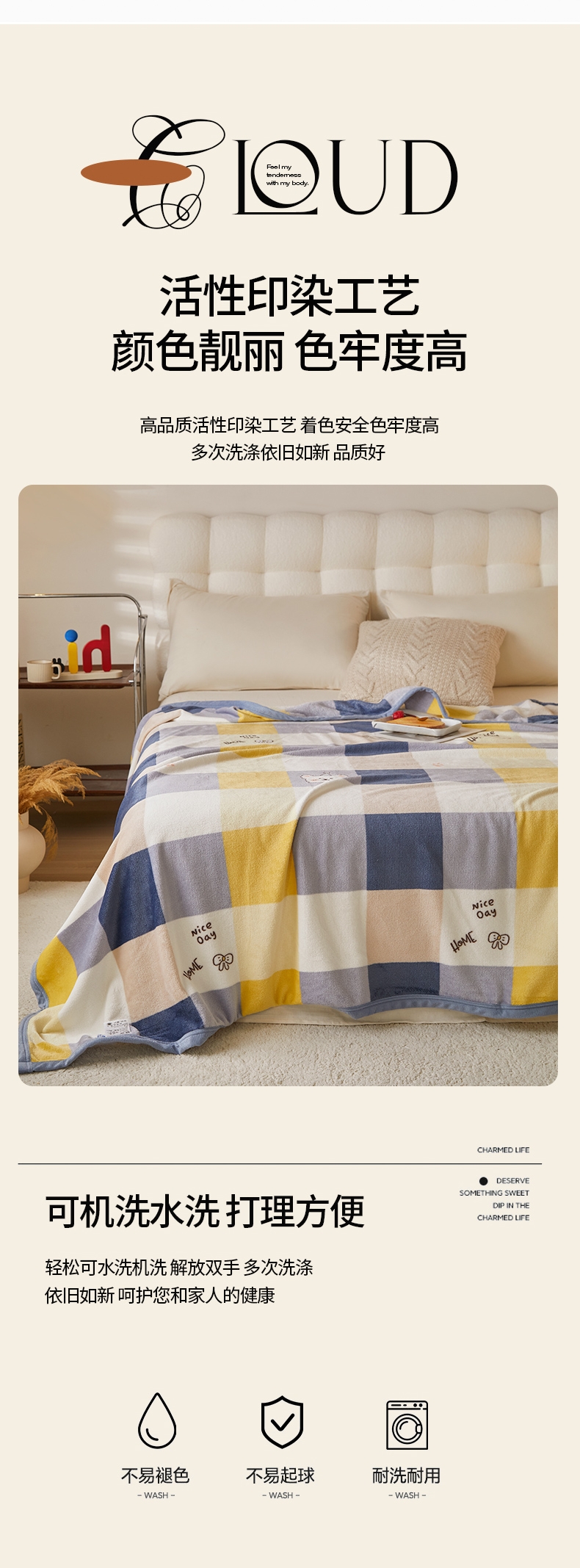 蓝白黄条纹印花设计,经典简约;绒感细腻柔软,不板结、不易掉毛;舒适透气,夏季使用不闷热,能有效帮助提高睡眠质量