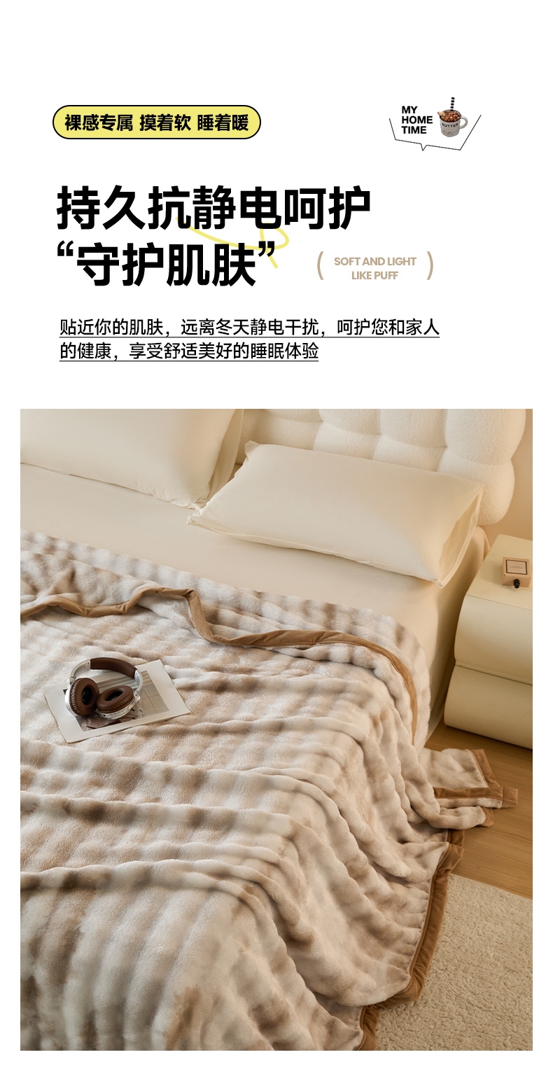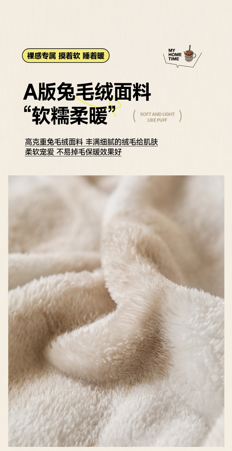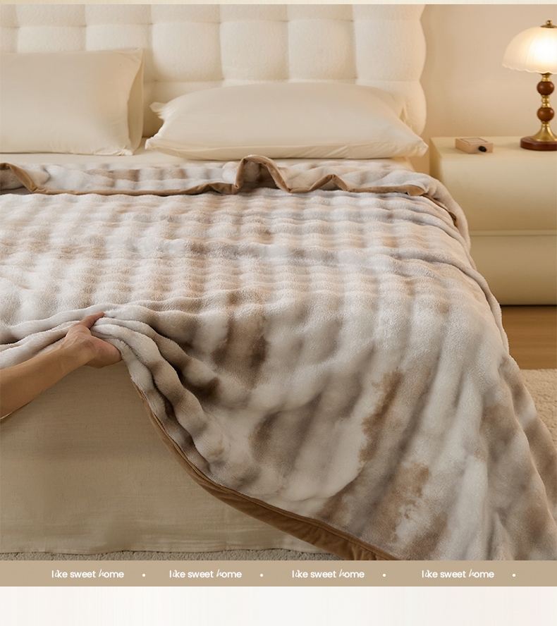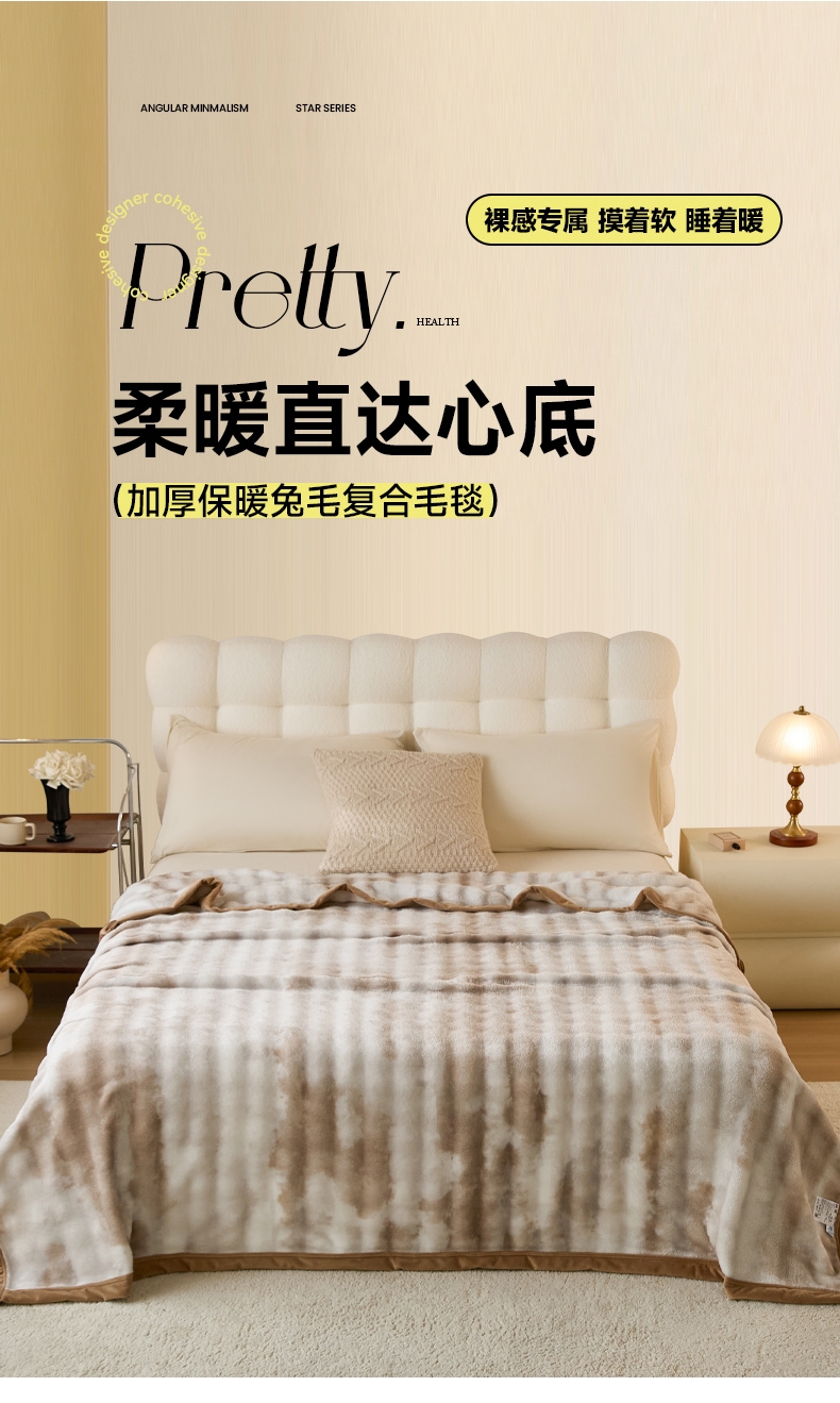 甄选优质兔毛绒原料,触感如云朵般轻柔丝滑;兔毛绒天然具备出色保暖性;毯面细腻有光泽,纹理精致大方