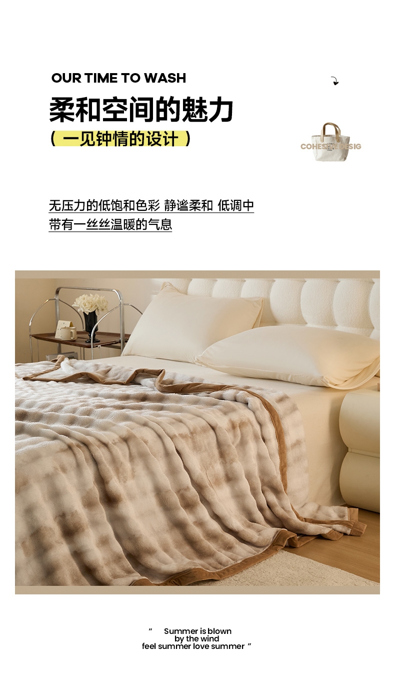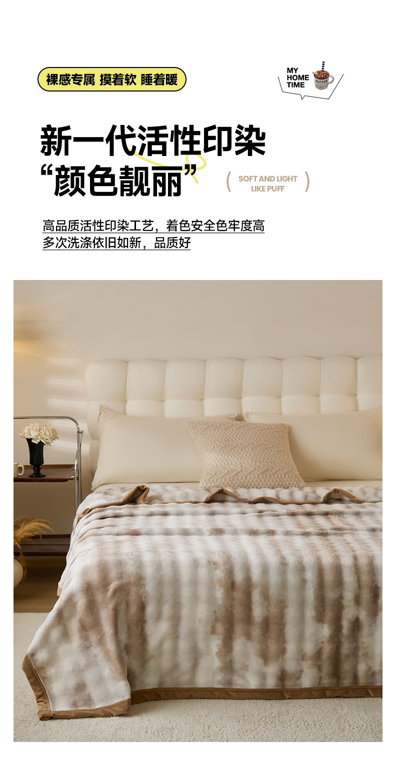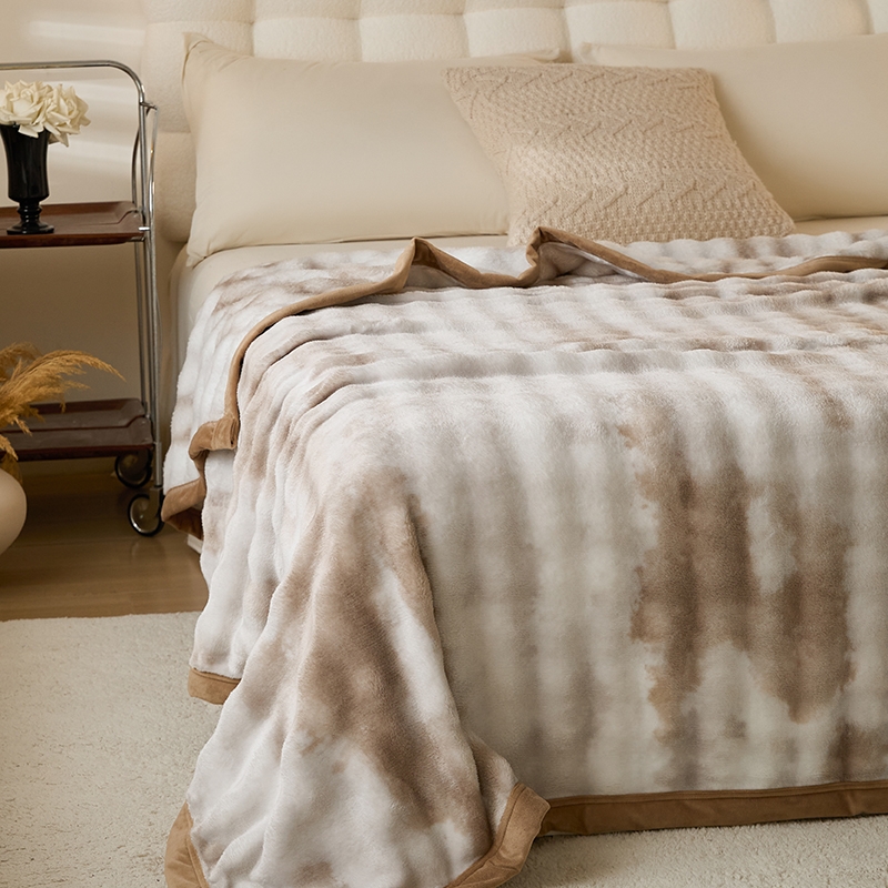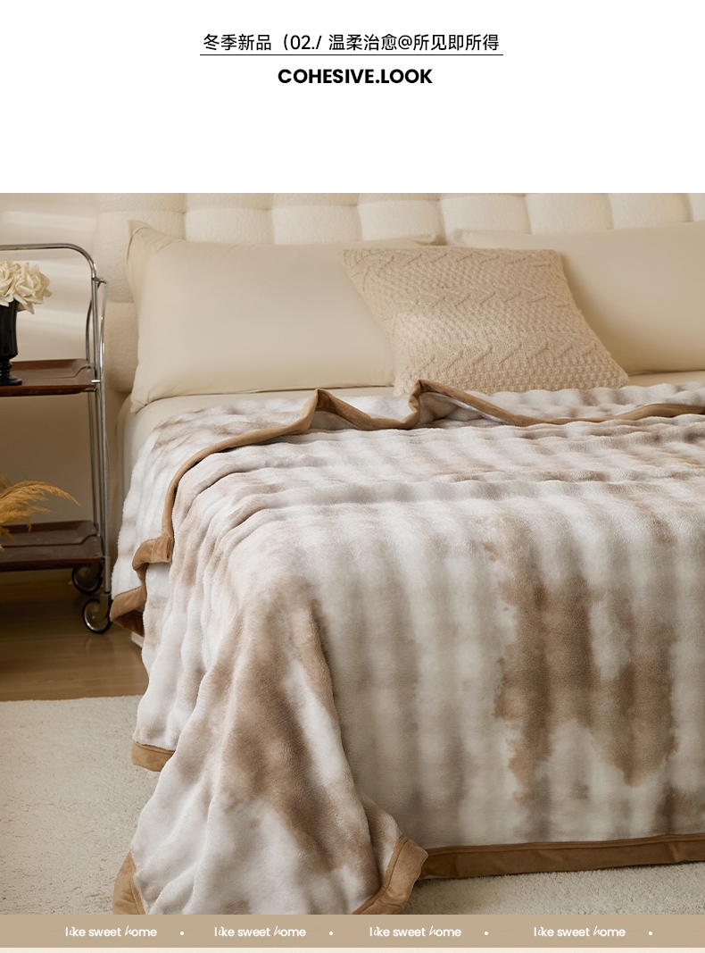 甄选优质兔毛绒原料,触感如云朵般轻柔丝滑;兔毛绒天然具备出色保暖性;毯面细腻有光泽,纹理精致大方