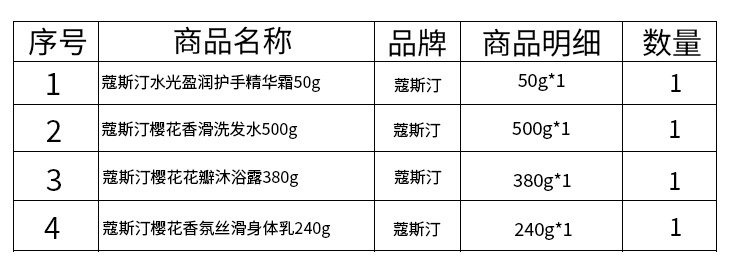 配置清单:蔻斯汀丝绒倍润护手精华霜50g*1支 蔻斯汀樱花香氛丝滑身体乳240g*1瓶 蔻斯汀樱花花瓣沐浴露380g*1瓶 蔻斯汀樱花香滑洗发水500g*1瓶