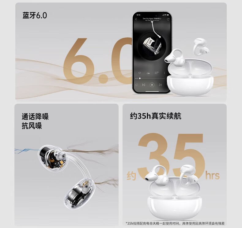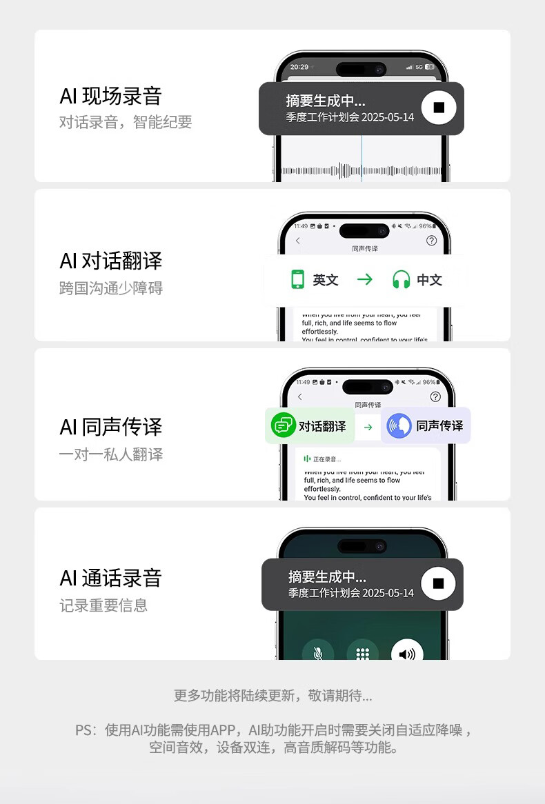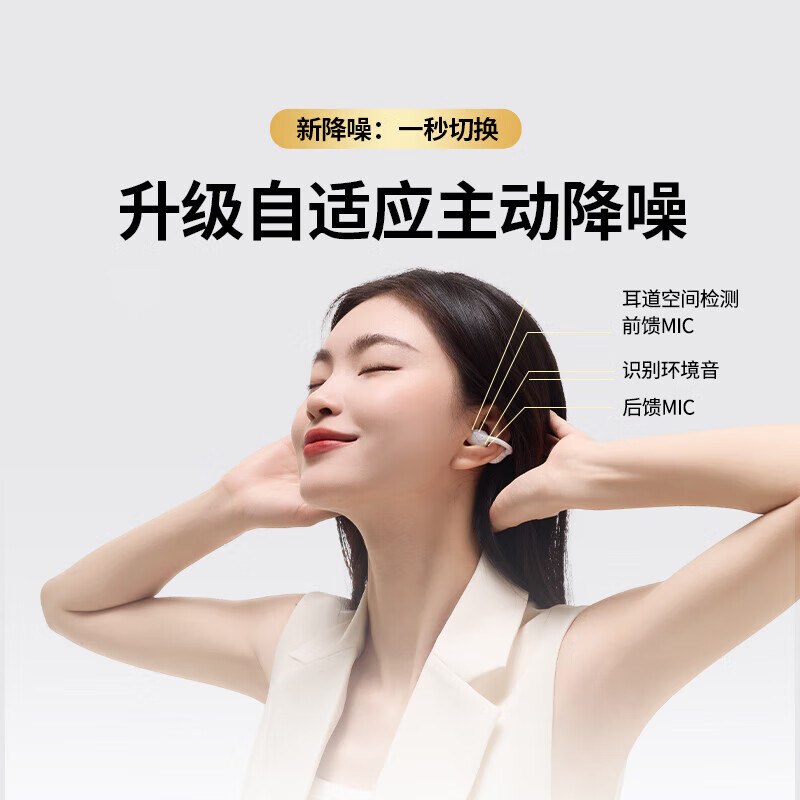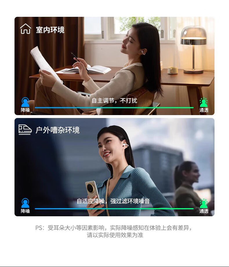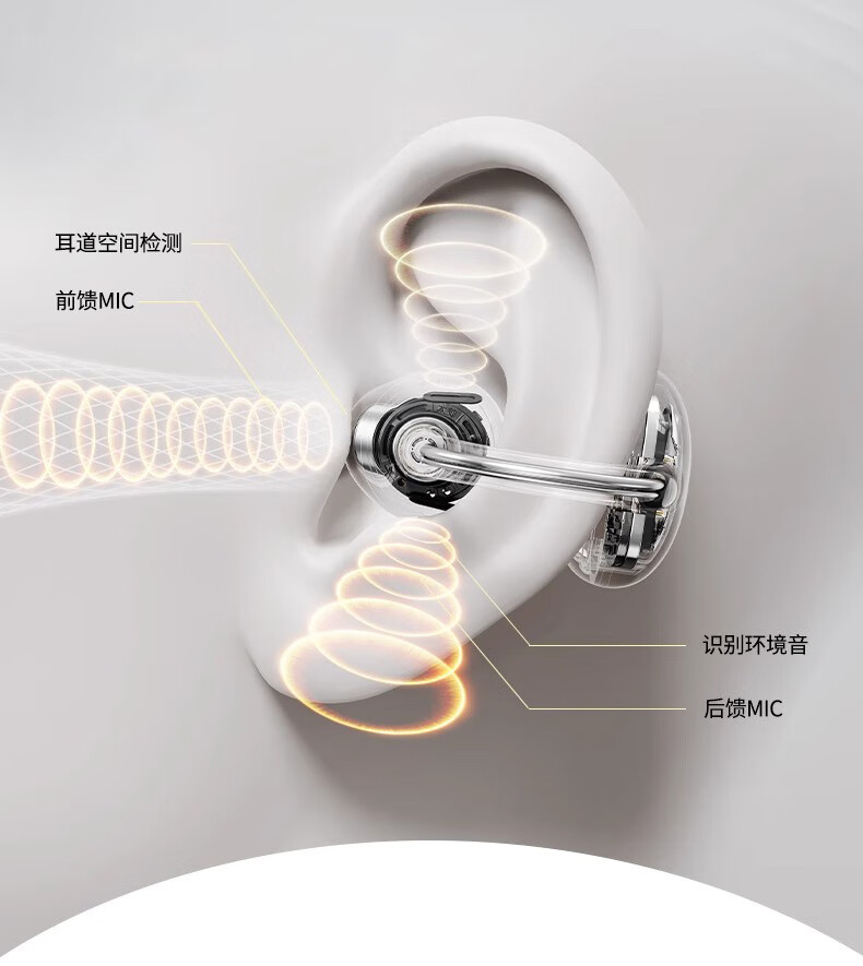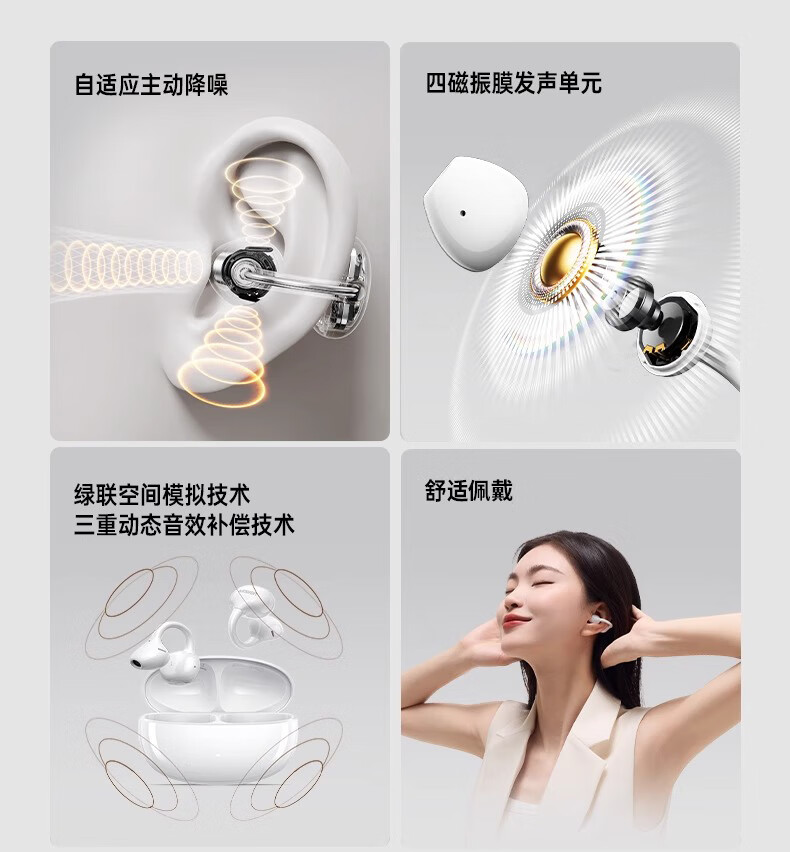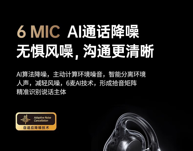 新一代蓝牙6.0技术视听/游戏超流畅;四磁振膜发声单元,黑胶级原声演绎;APP支持三种降噪程度选择,智能阻隔环境杂音时刻感