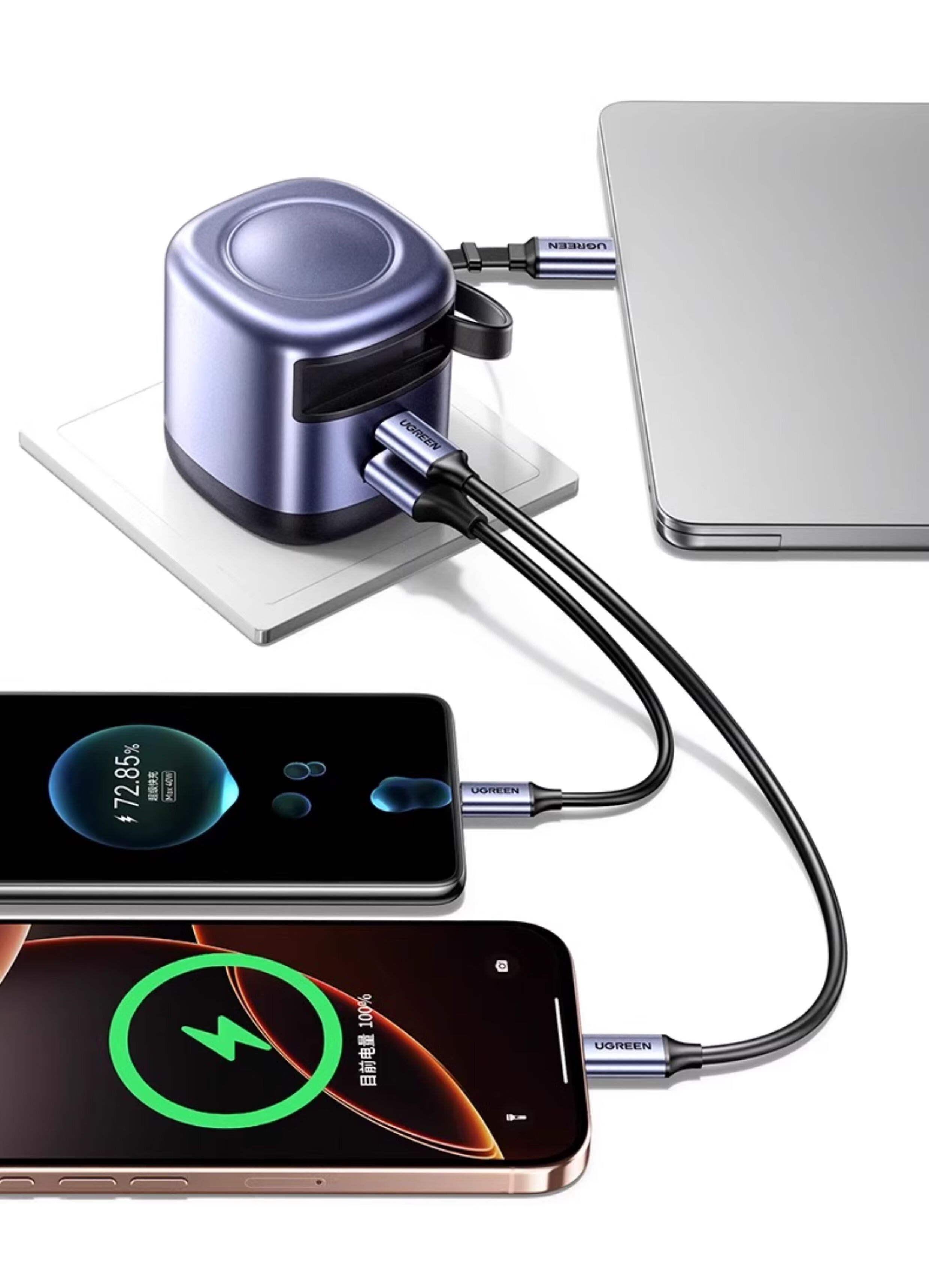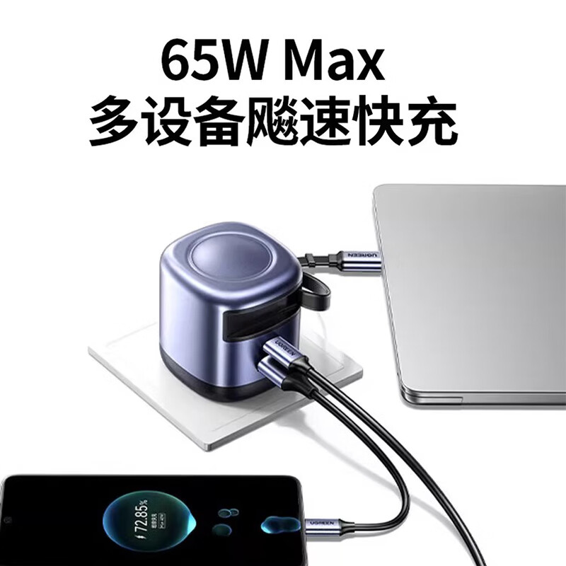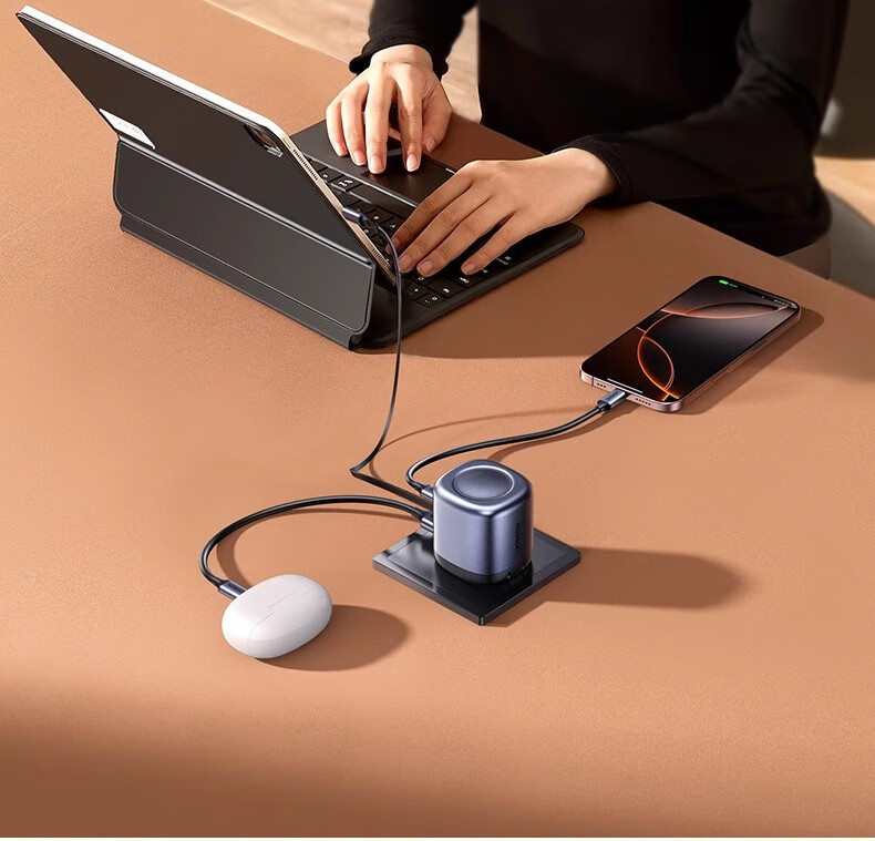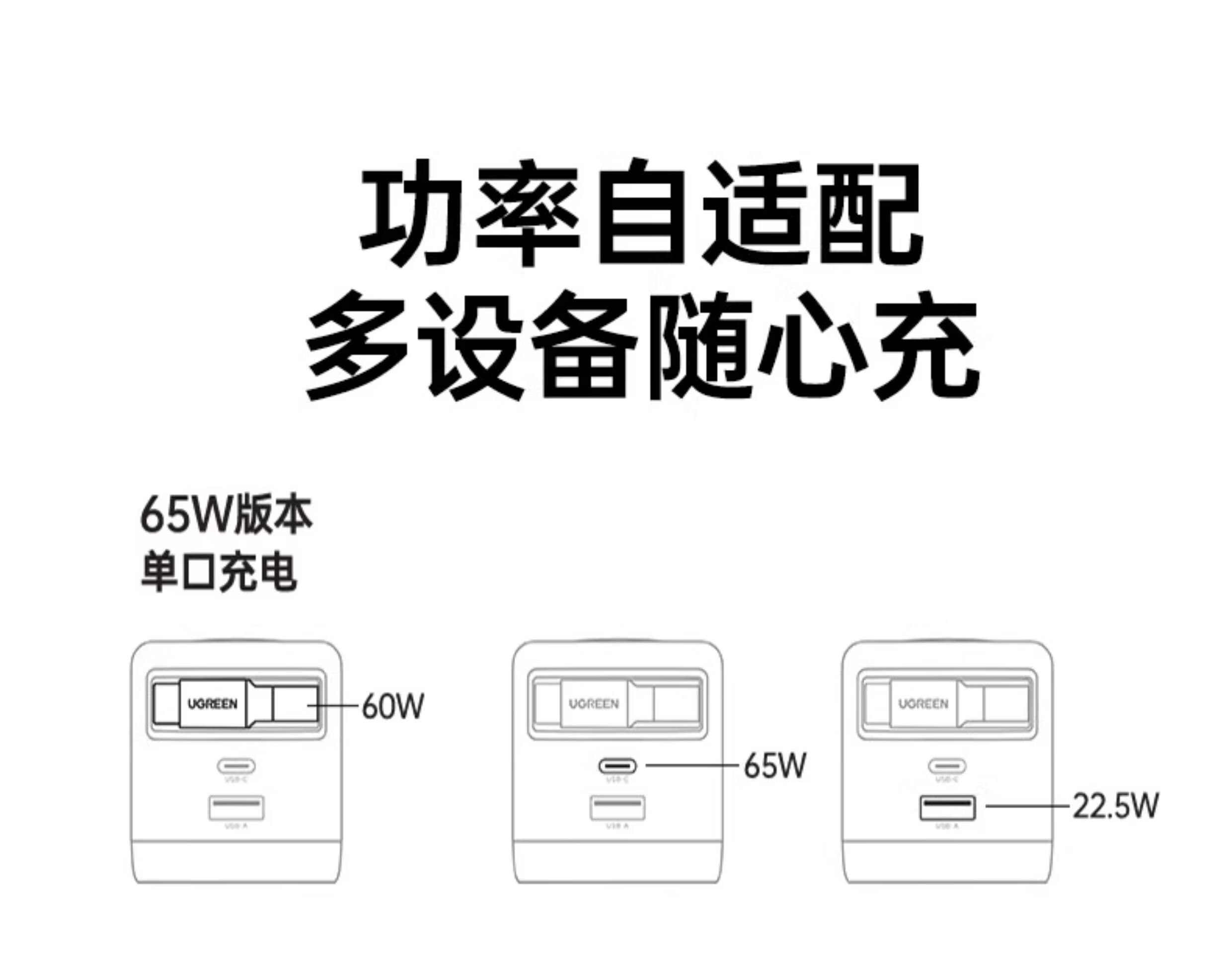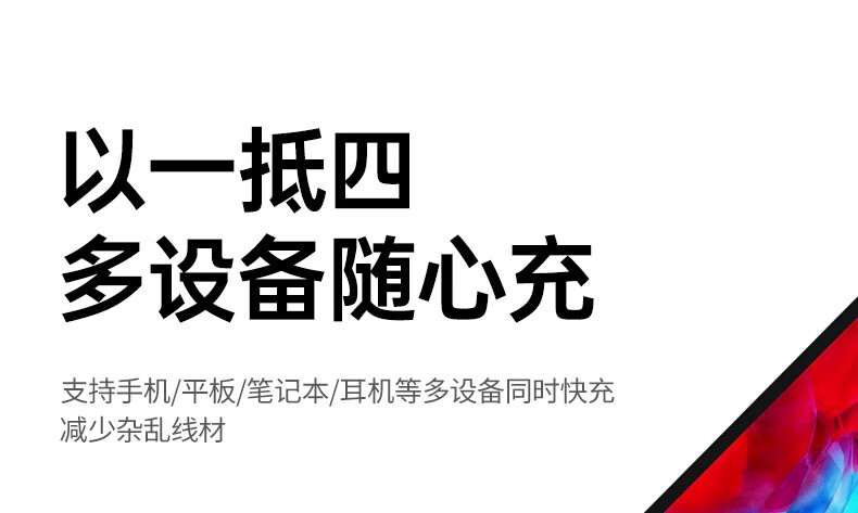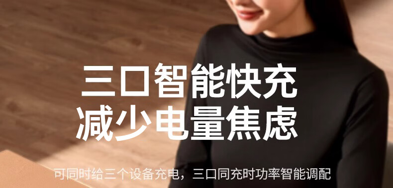 以一抵四多设备随心充; 功率自适配多设备随心充; 可同时给三个设备充电,三口同充时功率智能调配