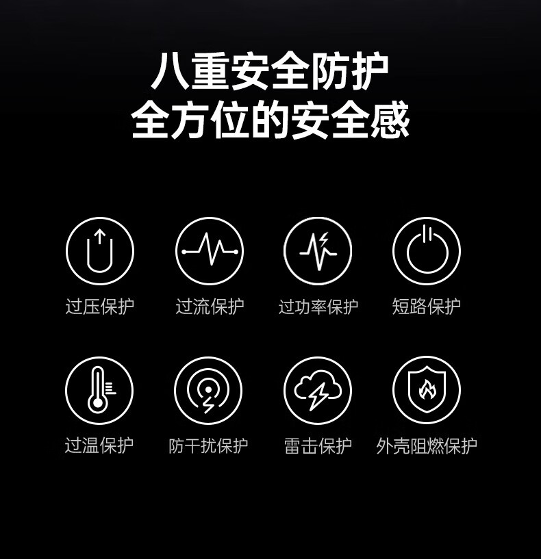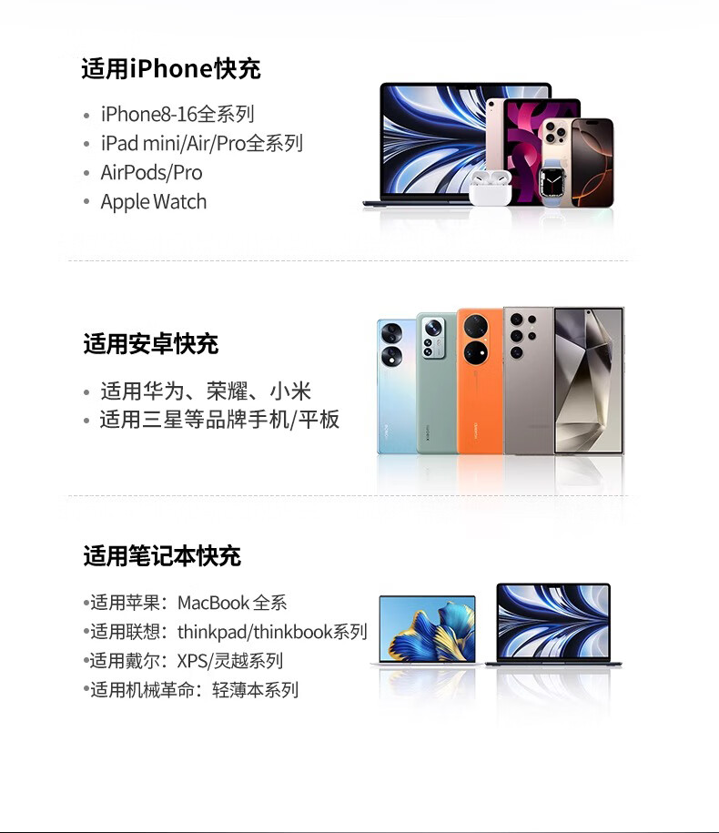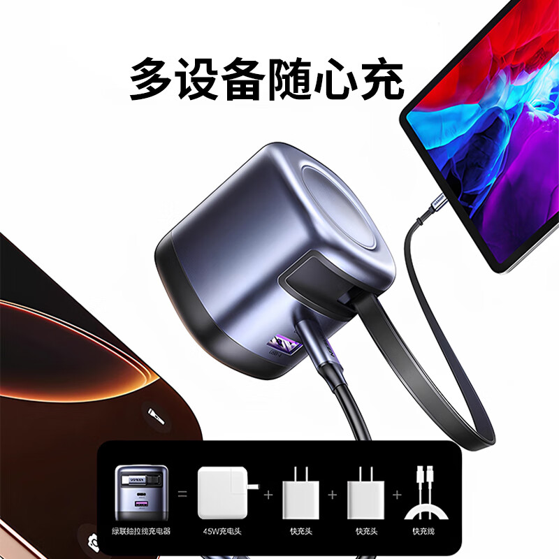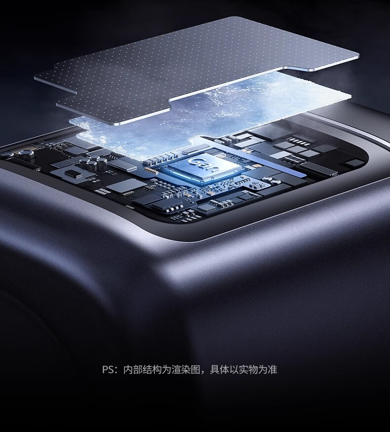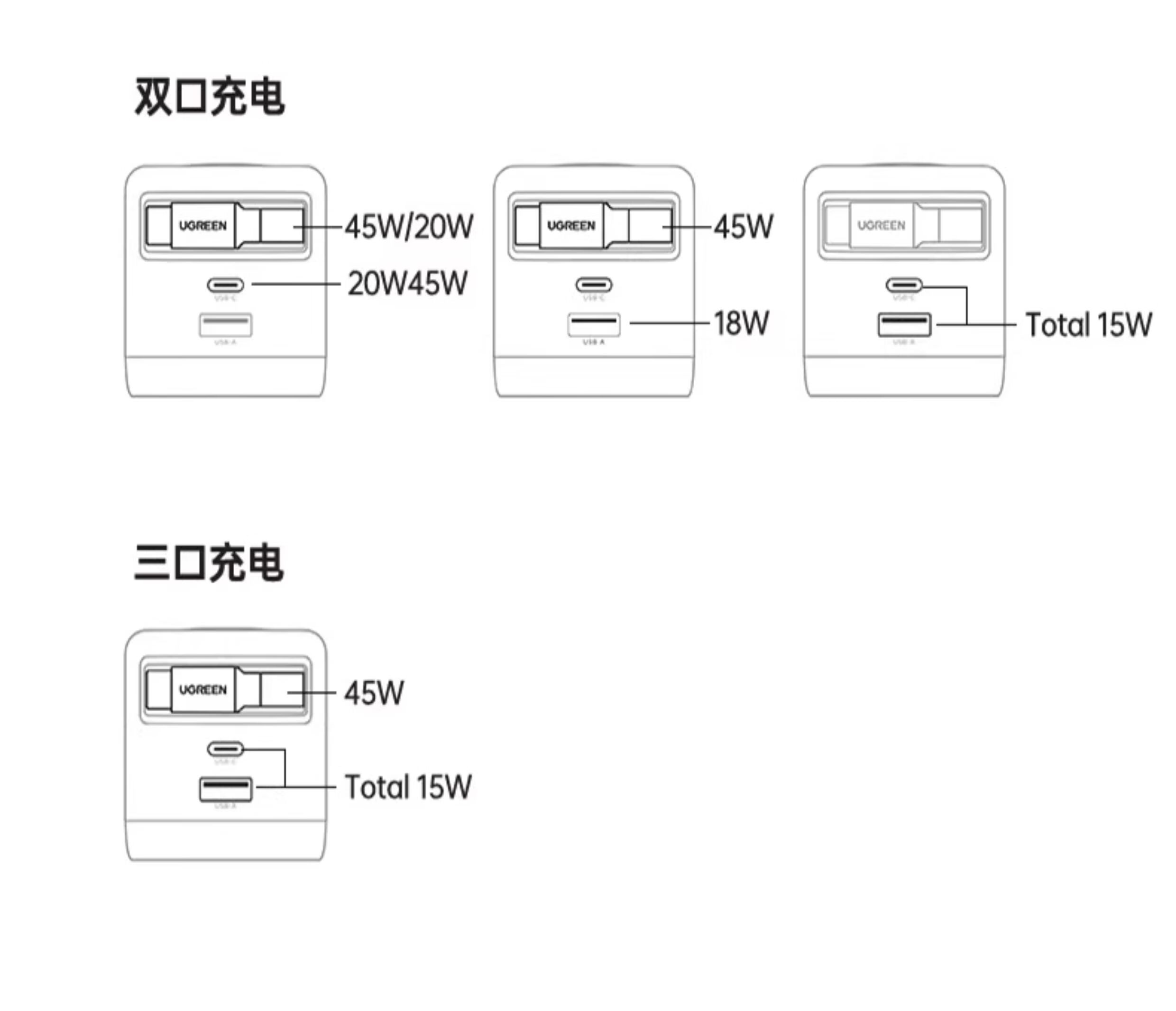 以一抵四多设备随心充; 功率自适配多设备随心充; 可同时给三个设备充电,三口同充时功率智能调配