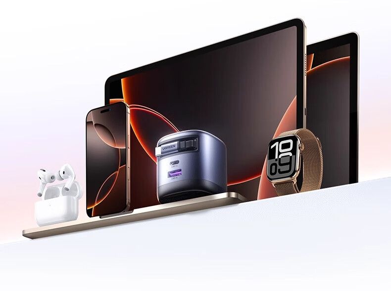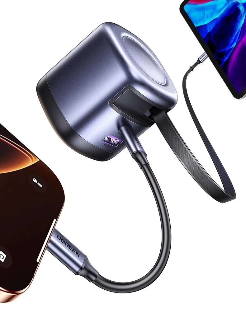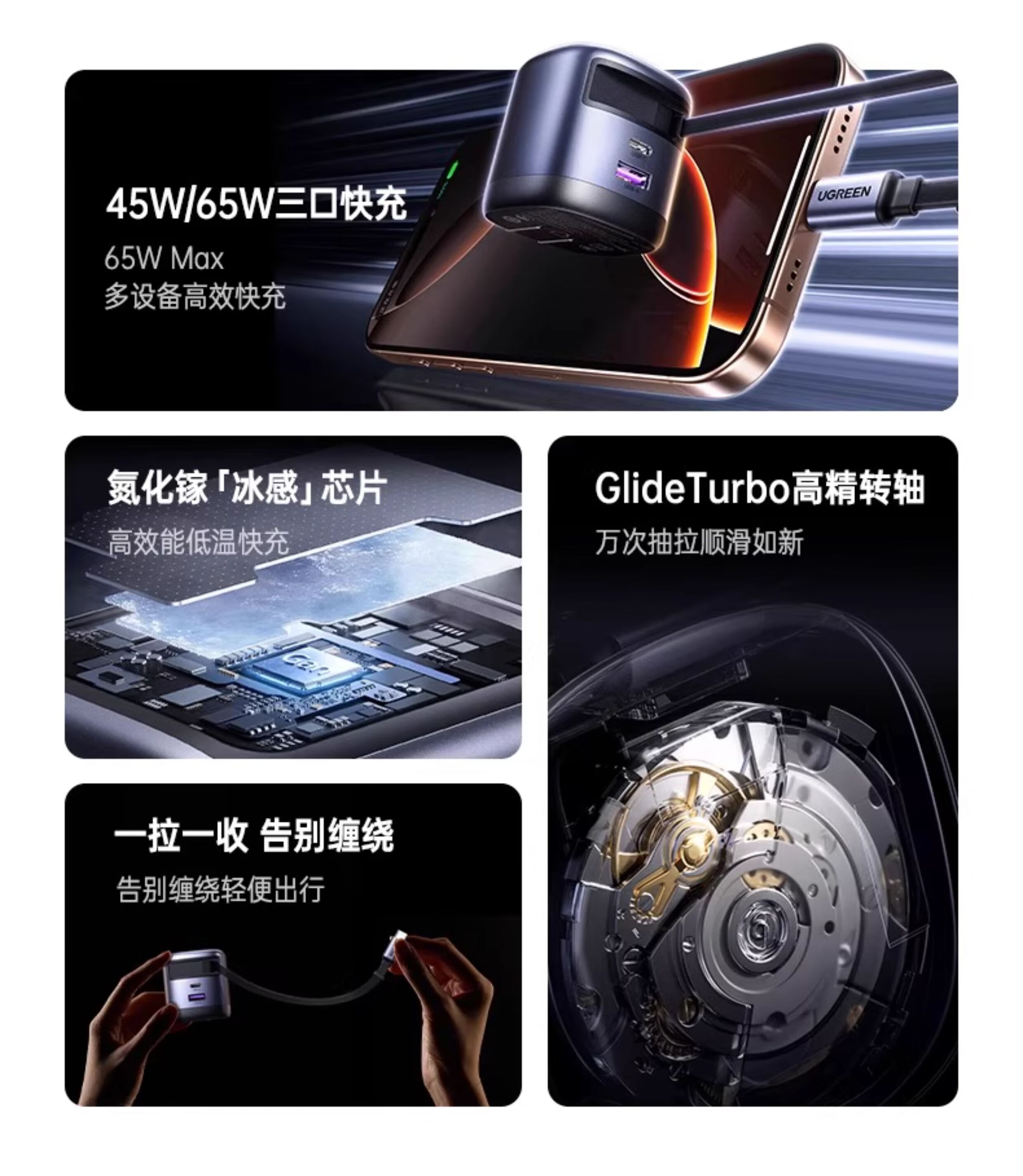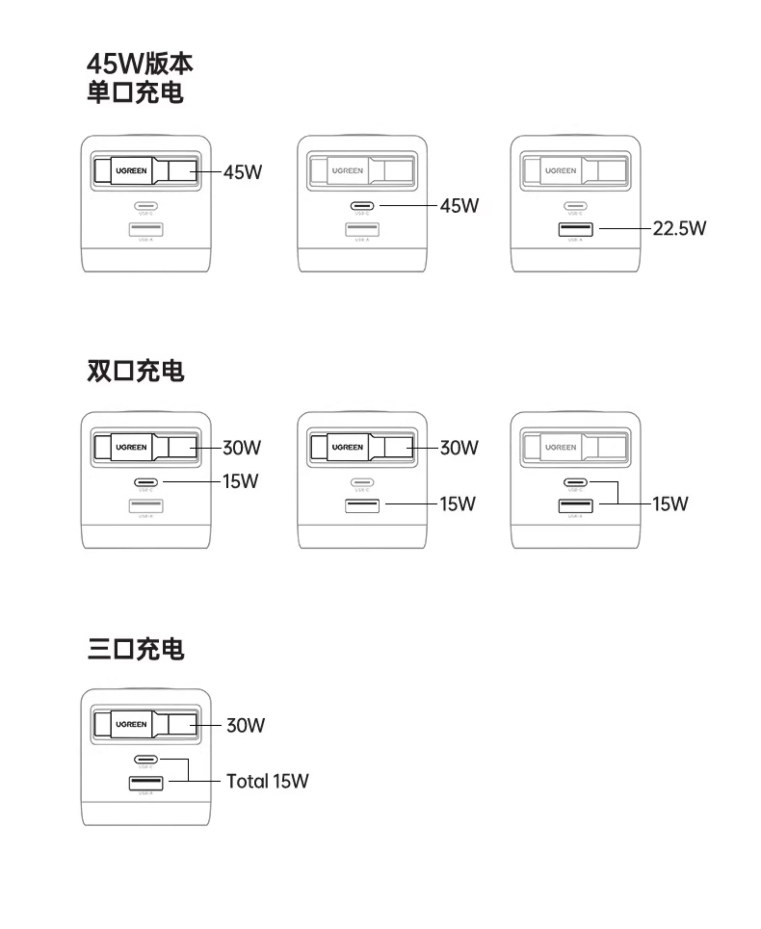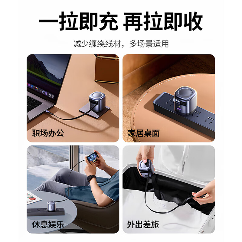 以一抵四多设备随心充; 功率自适配多设备随心充; 可同时给三个设备充电,三口同充时功率智能调配