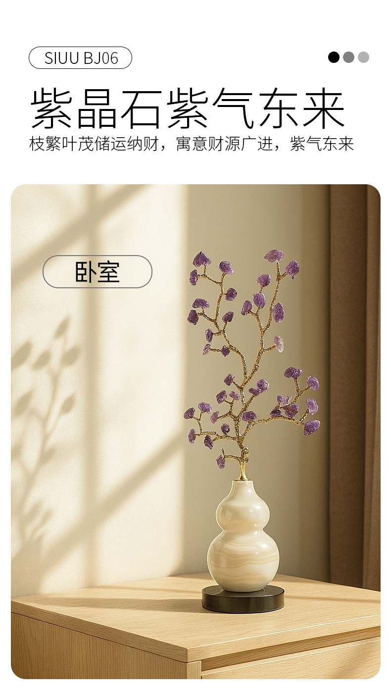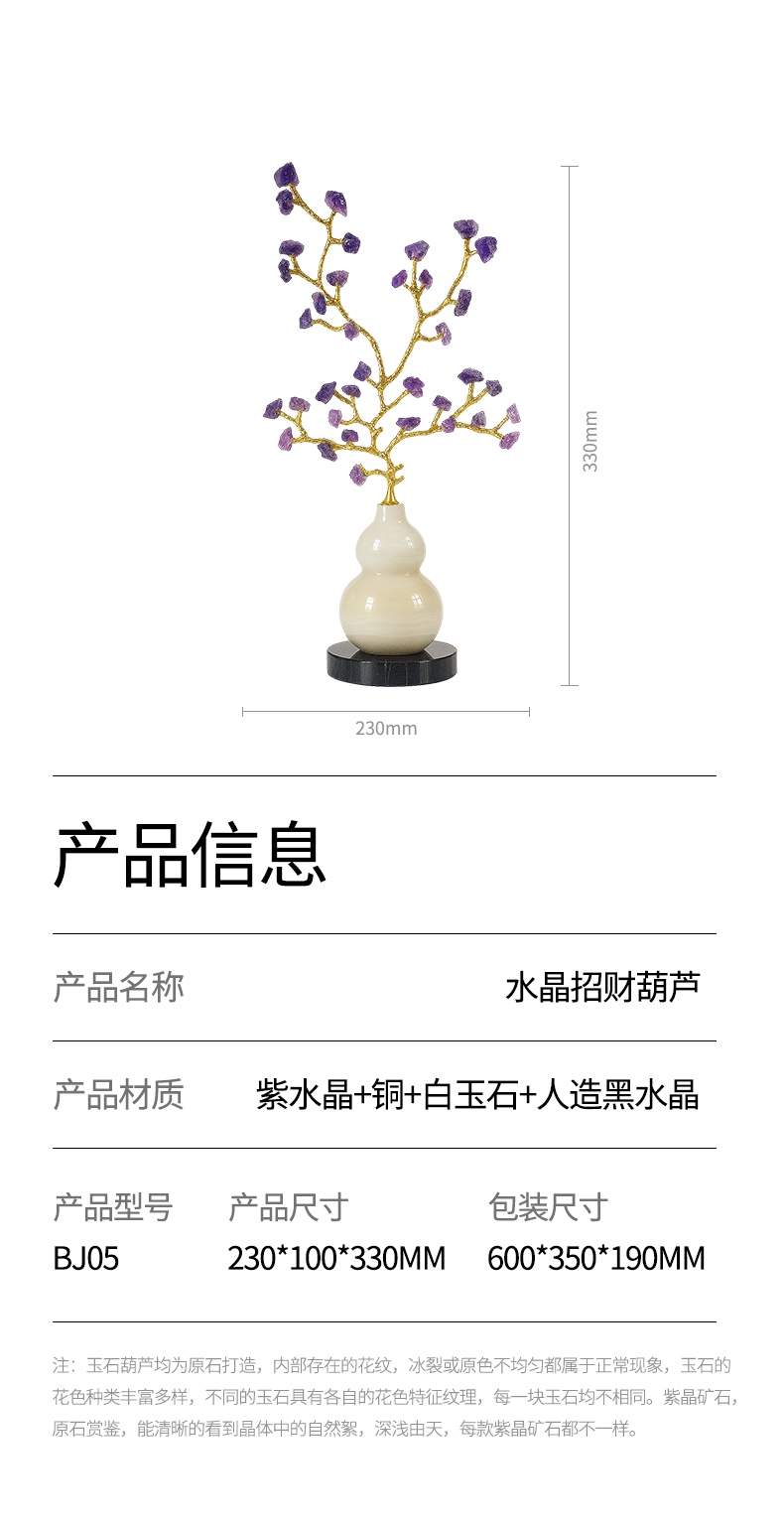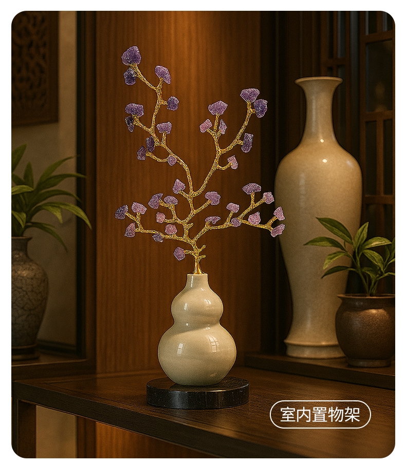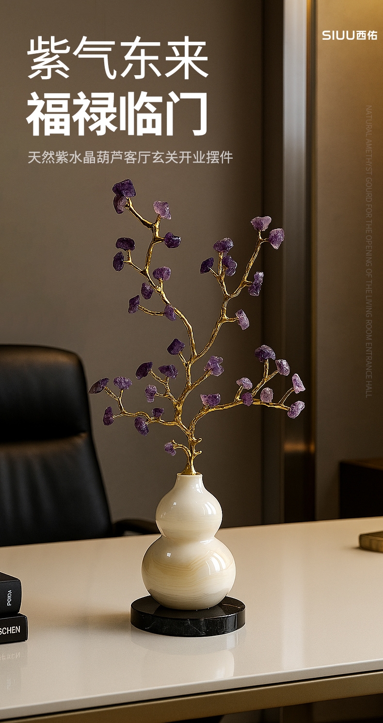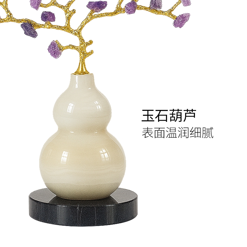 葫芦谐音"福禄",祈愿福禄双全;紫水晶象征"紫气东来",招财纳福;麋鹿角状枝丫寓意事业昌隆,富贵临门