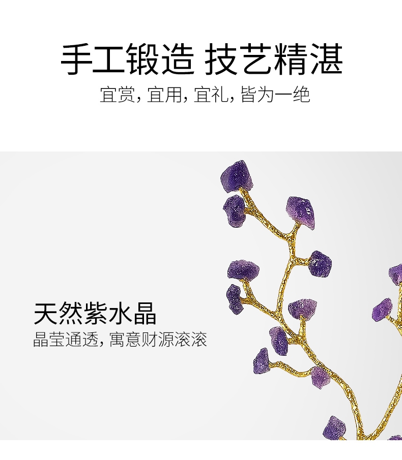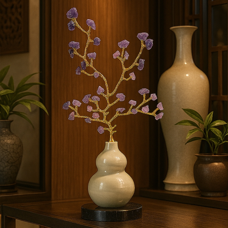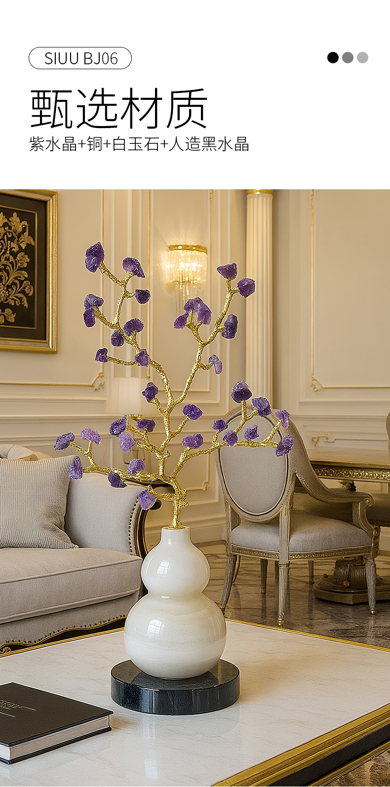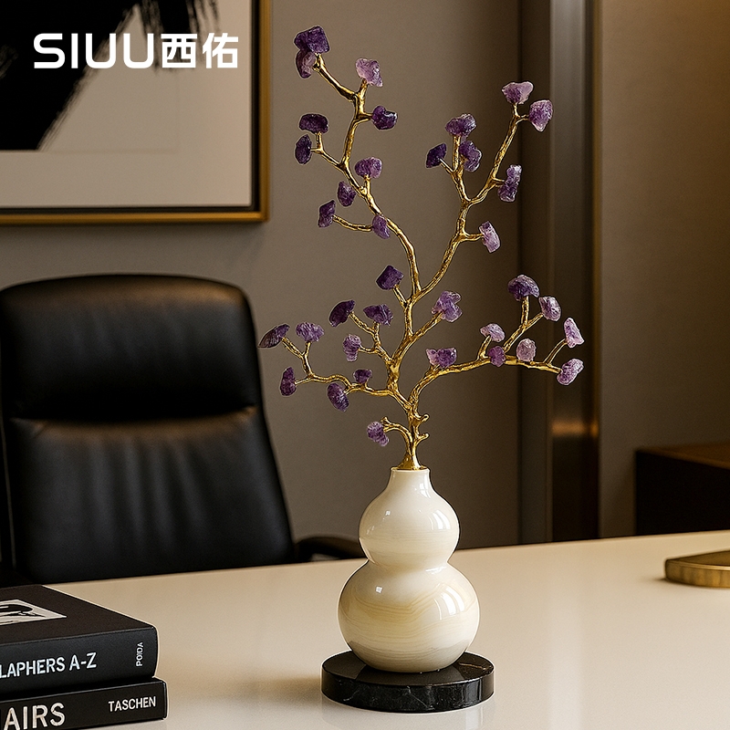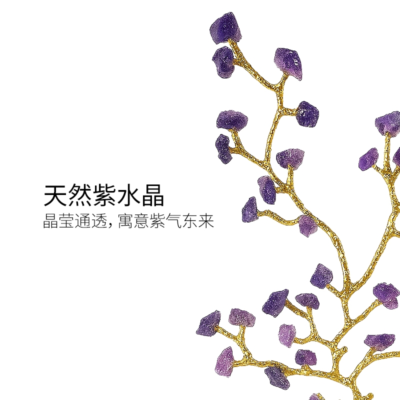 葫芦谐音"福禄",祈愿福禄双全;紫水晶象征"紫气东来",招财纳福;麋鹿角状枝丫寓意事业昌隆,富贵临门