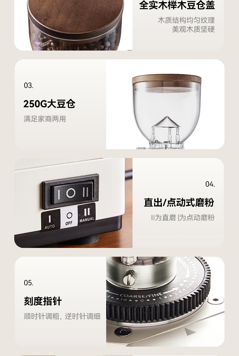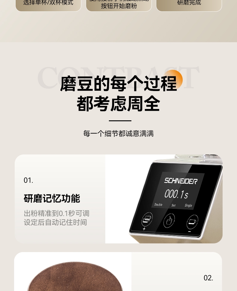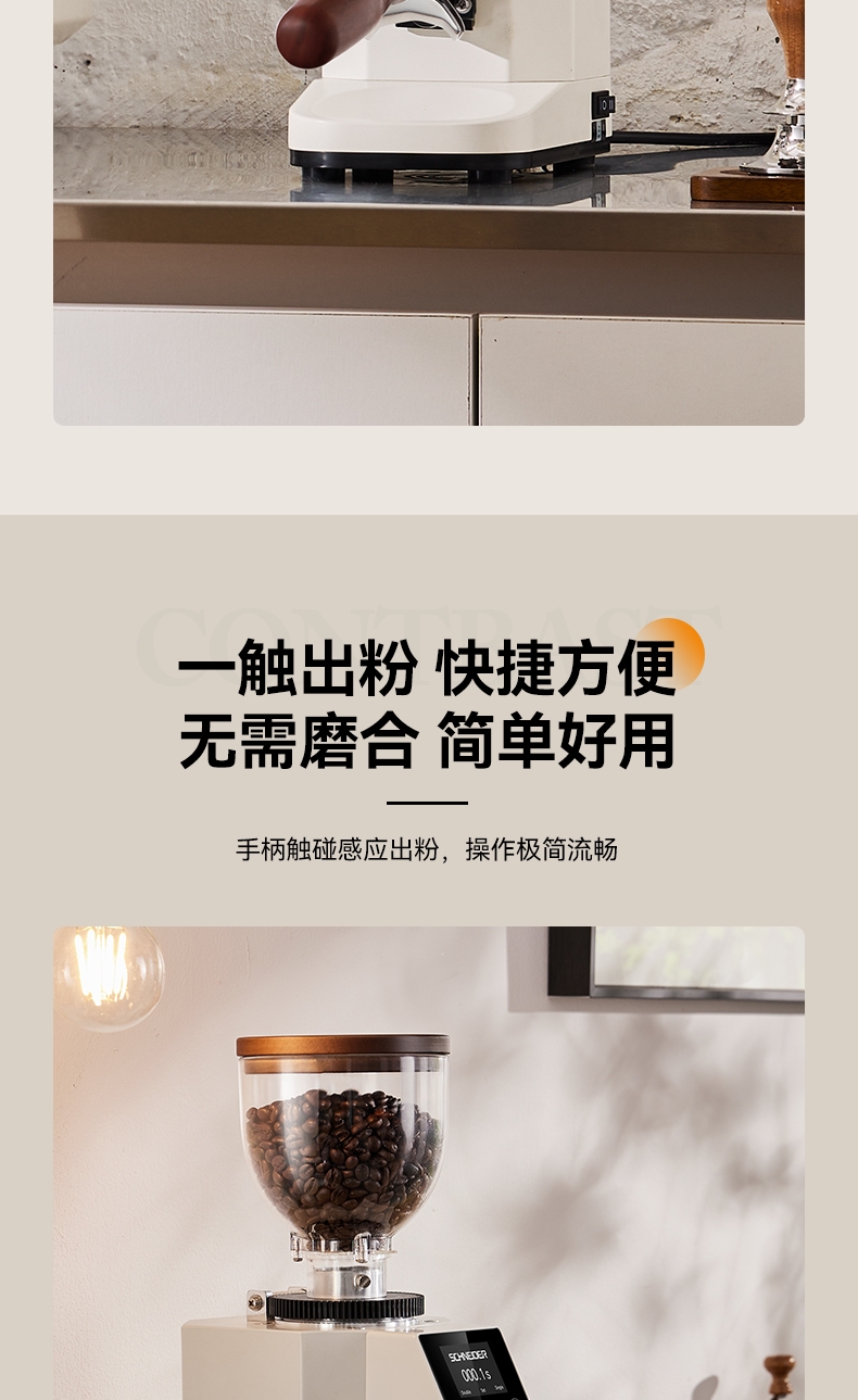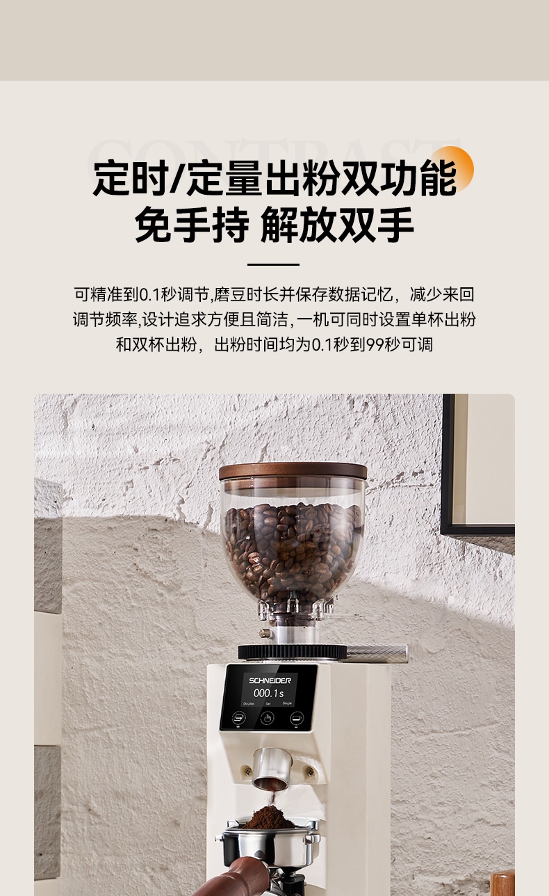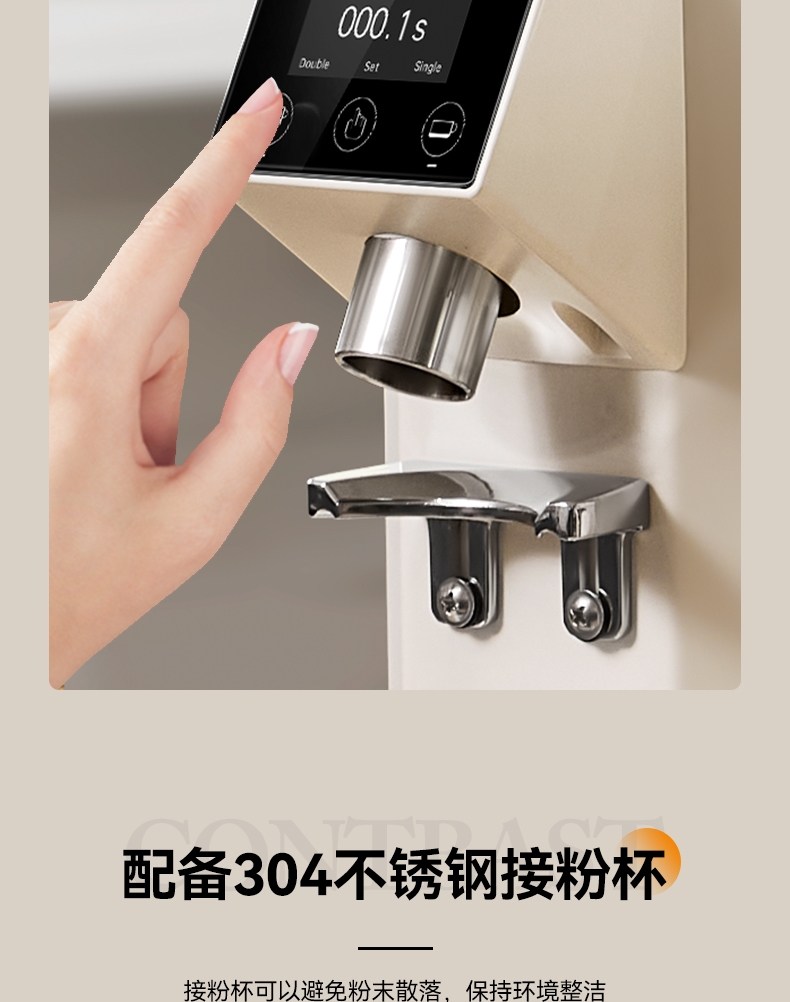 省咖啡豆,确保每次研磨都是新鲜且准确的粉量;一键研磨:预设时间或杯量,按一下即可。;让精品咖啡豆物有所值,喝到“豆子本该有的味道