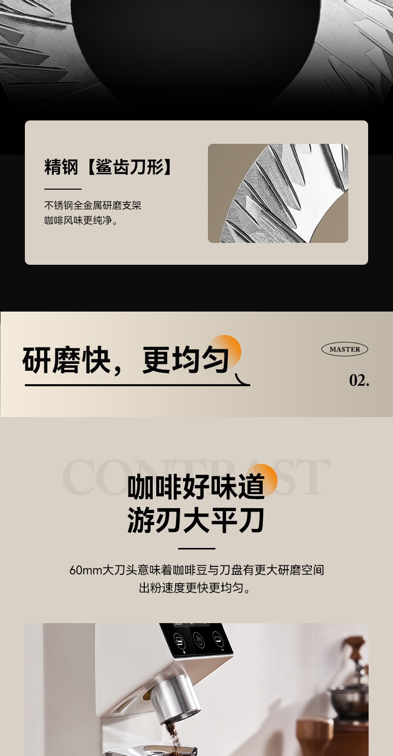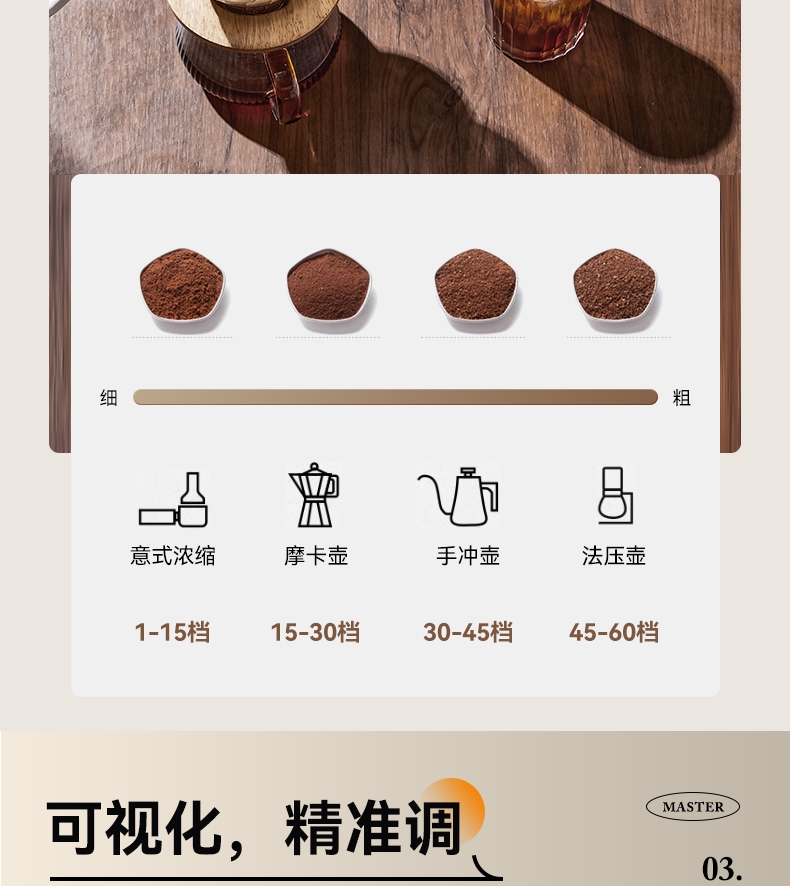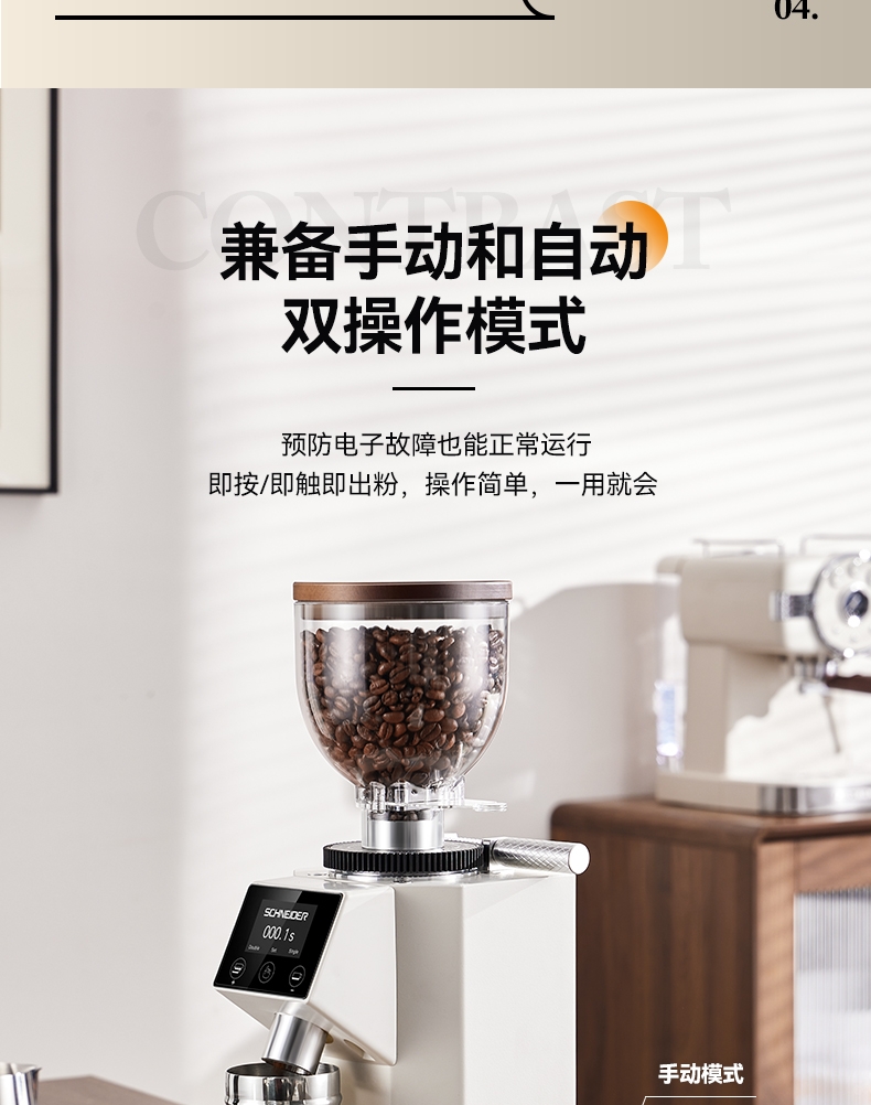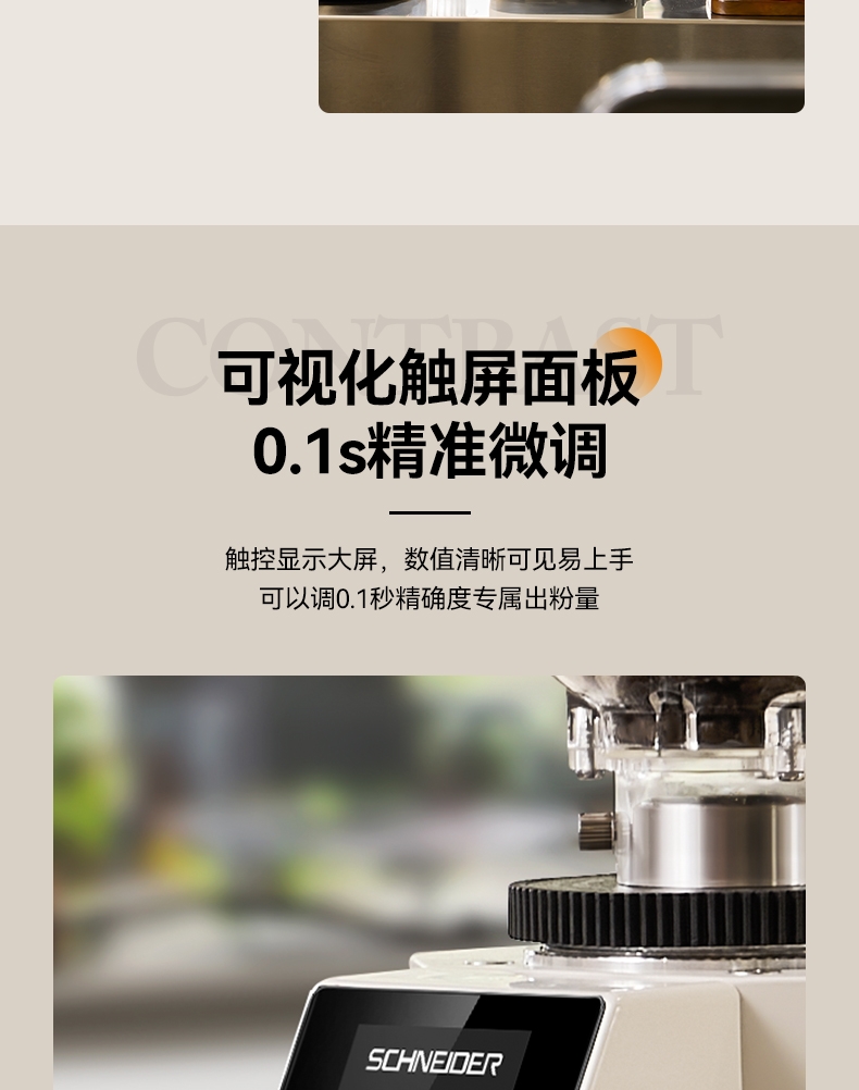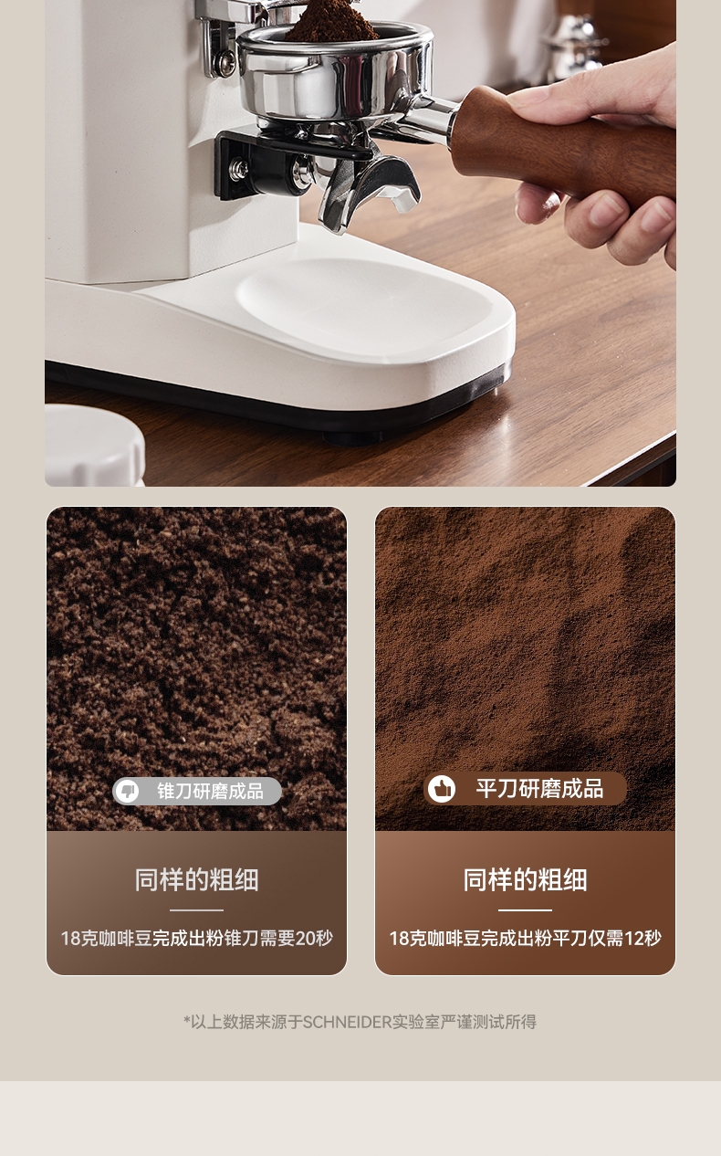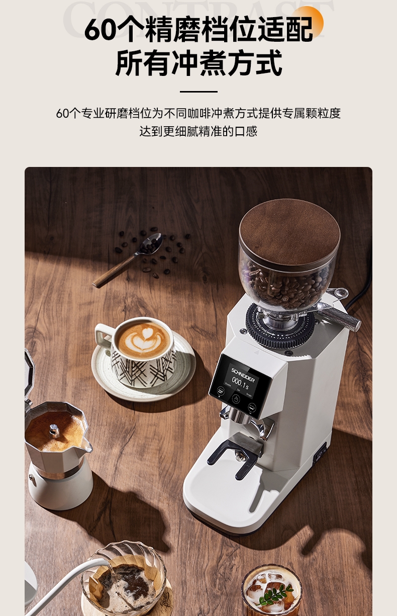 省咖啡豆,确保每次研磨都是新鲜且准确的粉量;一键研磨:预设时间或杯量,按一下即可。;让精品咖啡豆物有所值,喝到“豆子本该有的味道