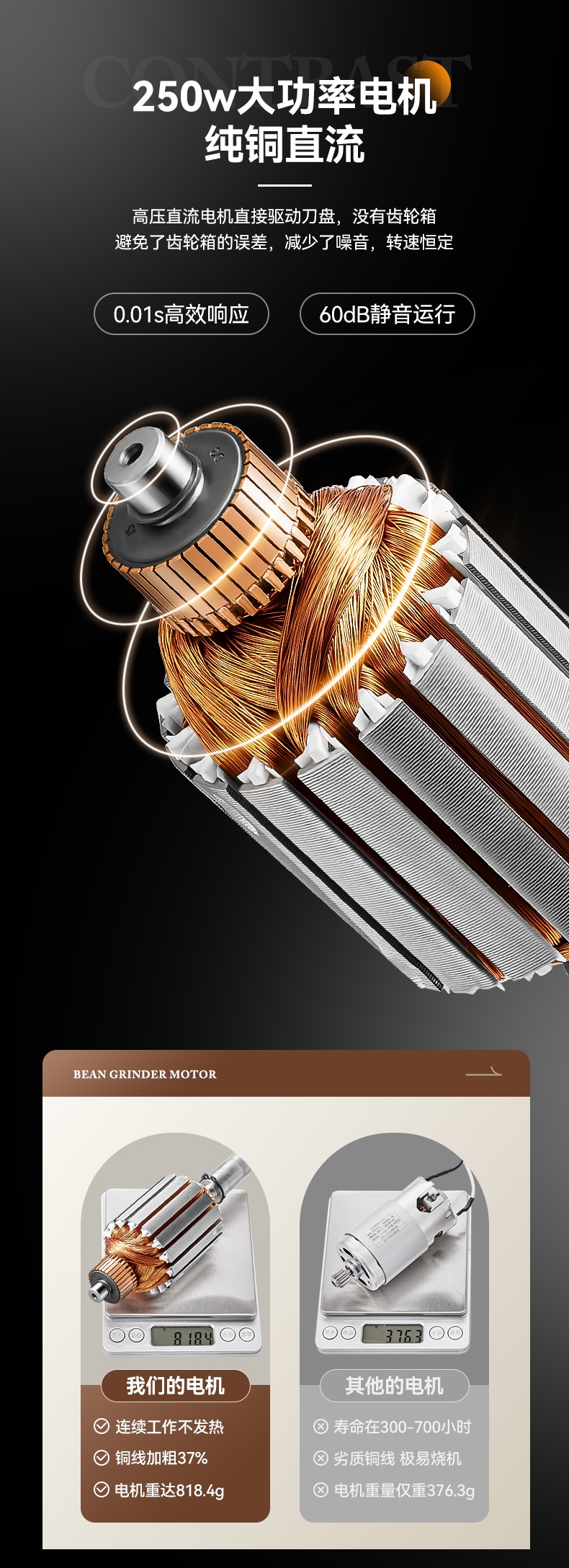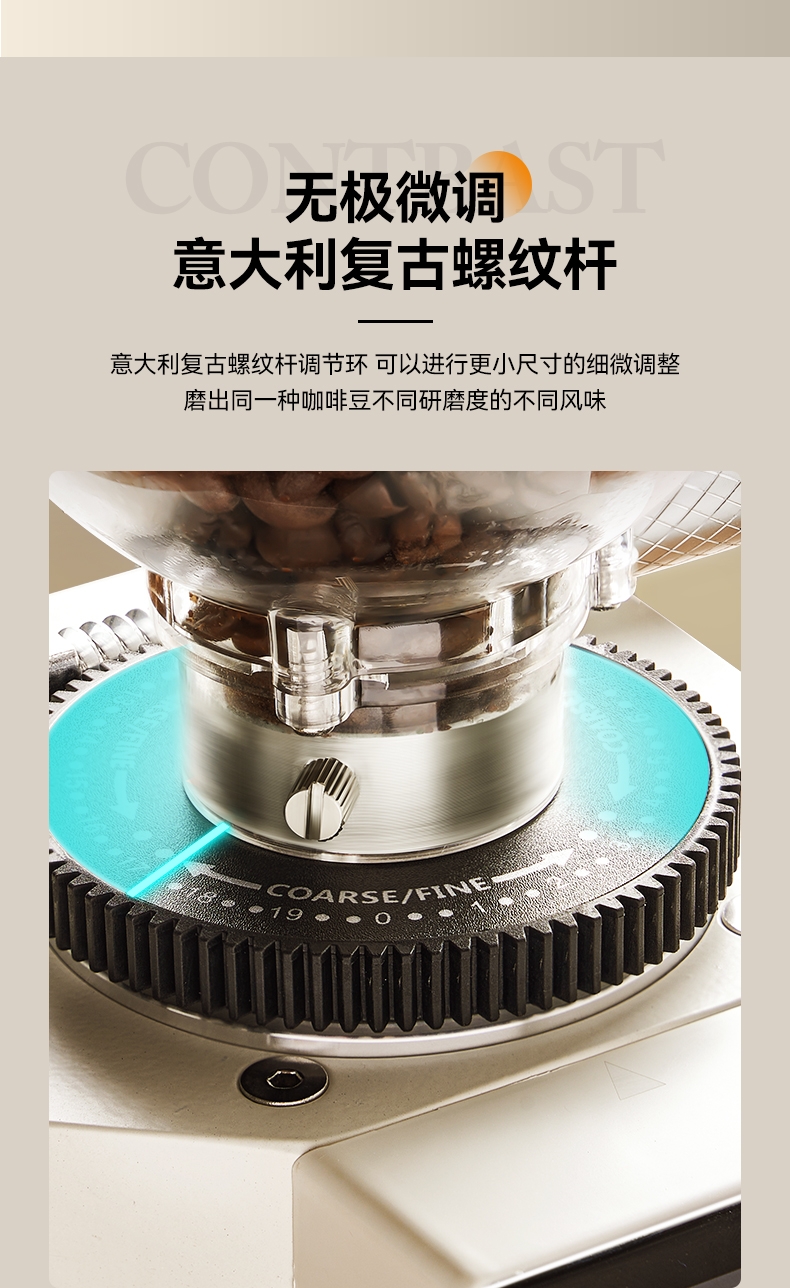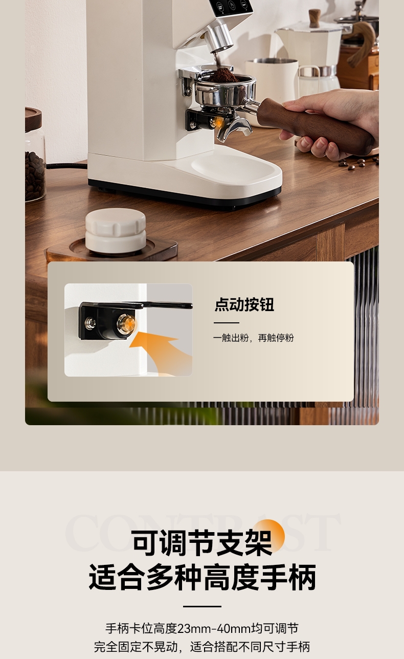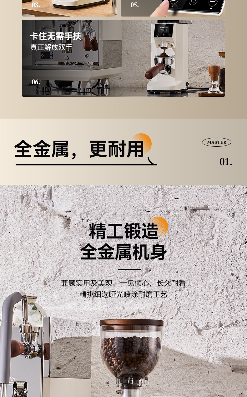 省咖啡豆,确保每次研磨都是新鲜且准确的粉量;一键研磨:预设时间或杯量,按一下即可。;让精品咖啡豆物有所值,喝到“豆子本该有的味道