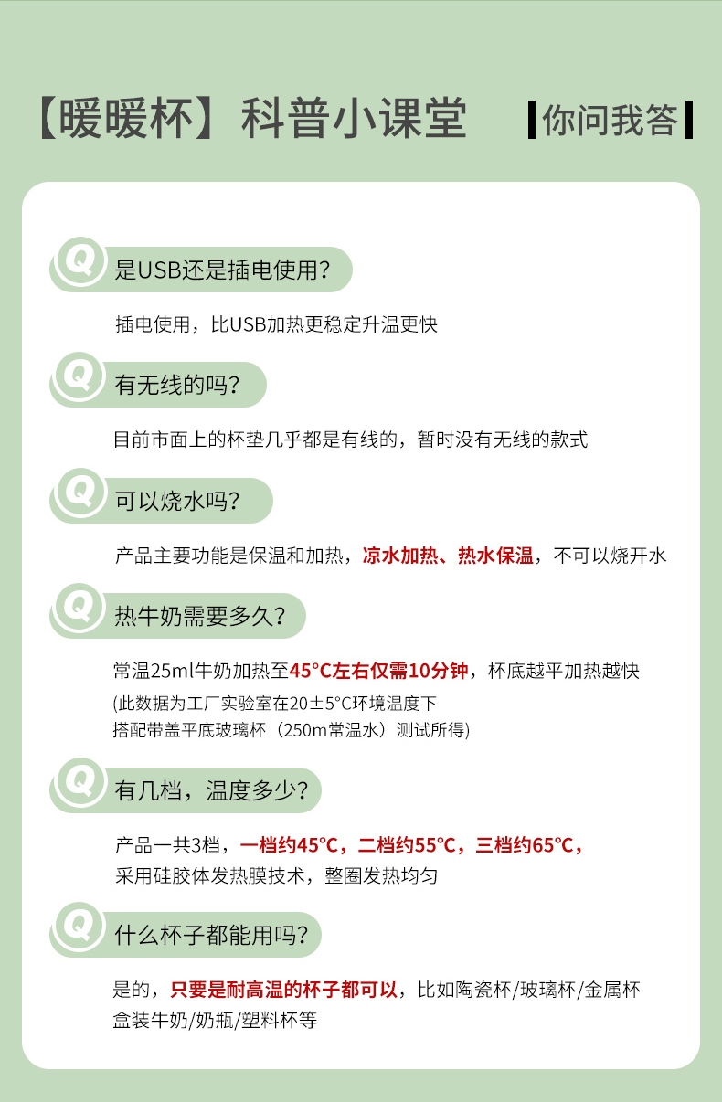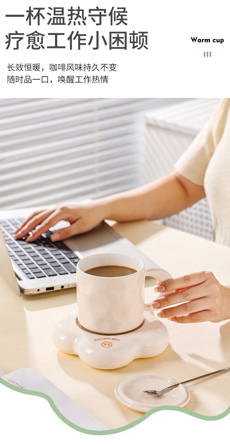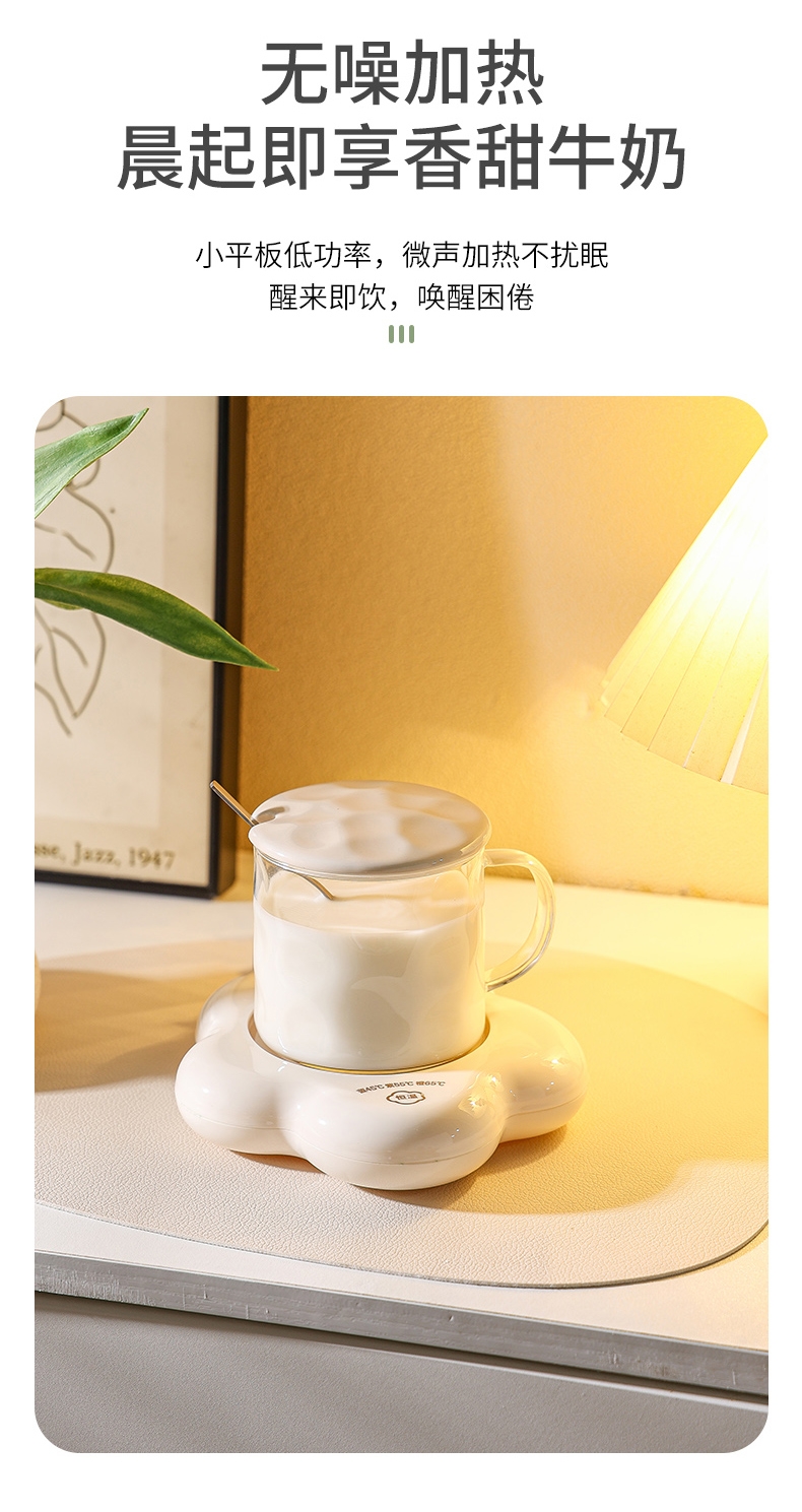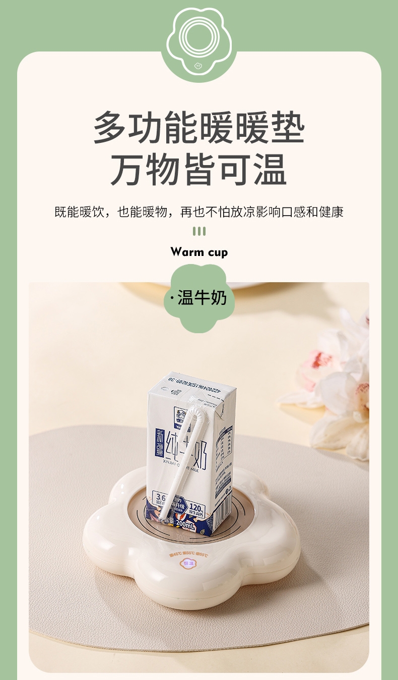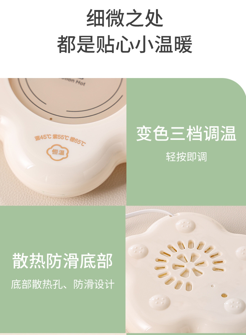 400ml大容量,安全易清洗;三档温控调节,45℃/55℃/65℃;55℃自动恒温,12h超长恒温;16W无噪加热,不挑杯子,快速加热,多彩颜色;极简设计,放办公室/床头都是风景
